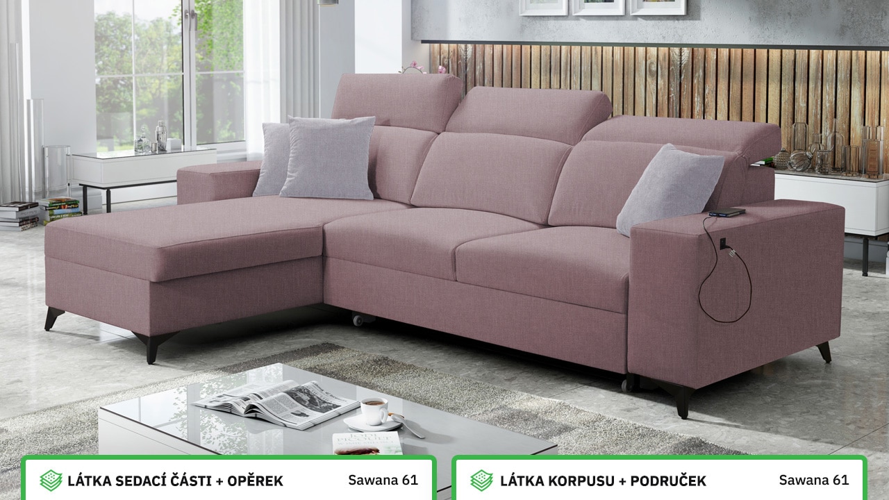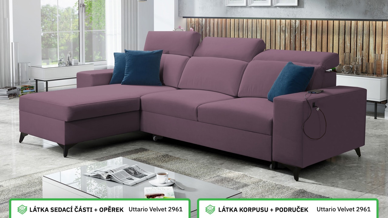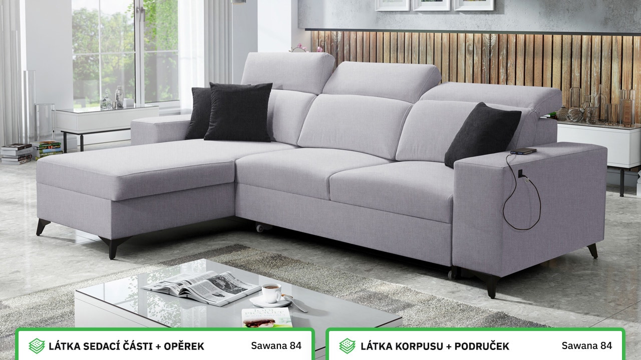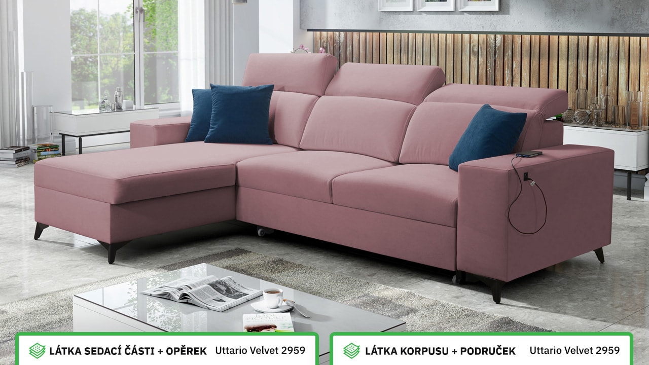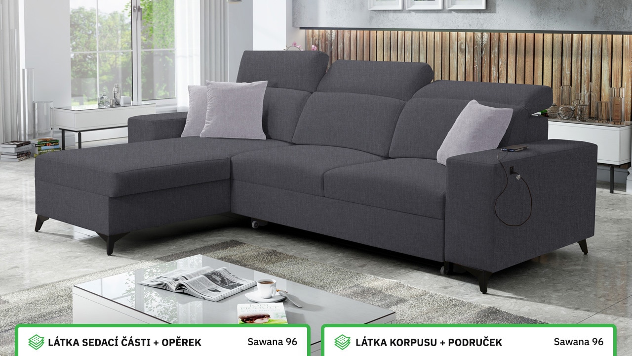 Ideální rohová pohovka pro odpočinek a lenošení. Má polohovatelné opěrky hlavy, úložný prostor a vestavěné rozkládací lůžko. Výhodou je také zabudovaný USB port pro nabíjení, díky čemuž můžete mít mobil nebo tablet vždy po ruce. Sedačku vám nabízíme s možností vlastního výběru potahového materiálu, aby ulahodila vašemu oku a zapadla do stylu vaší domácnosti. Ozdobné polštářky máte od nás grátis.