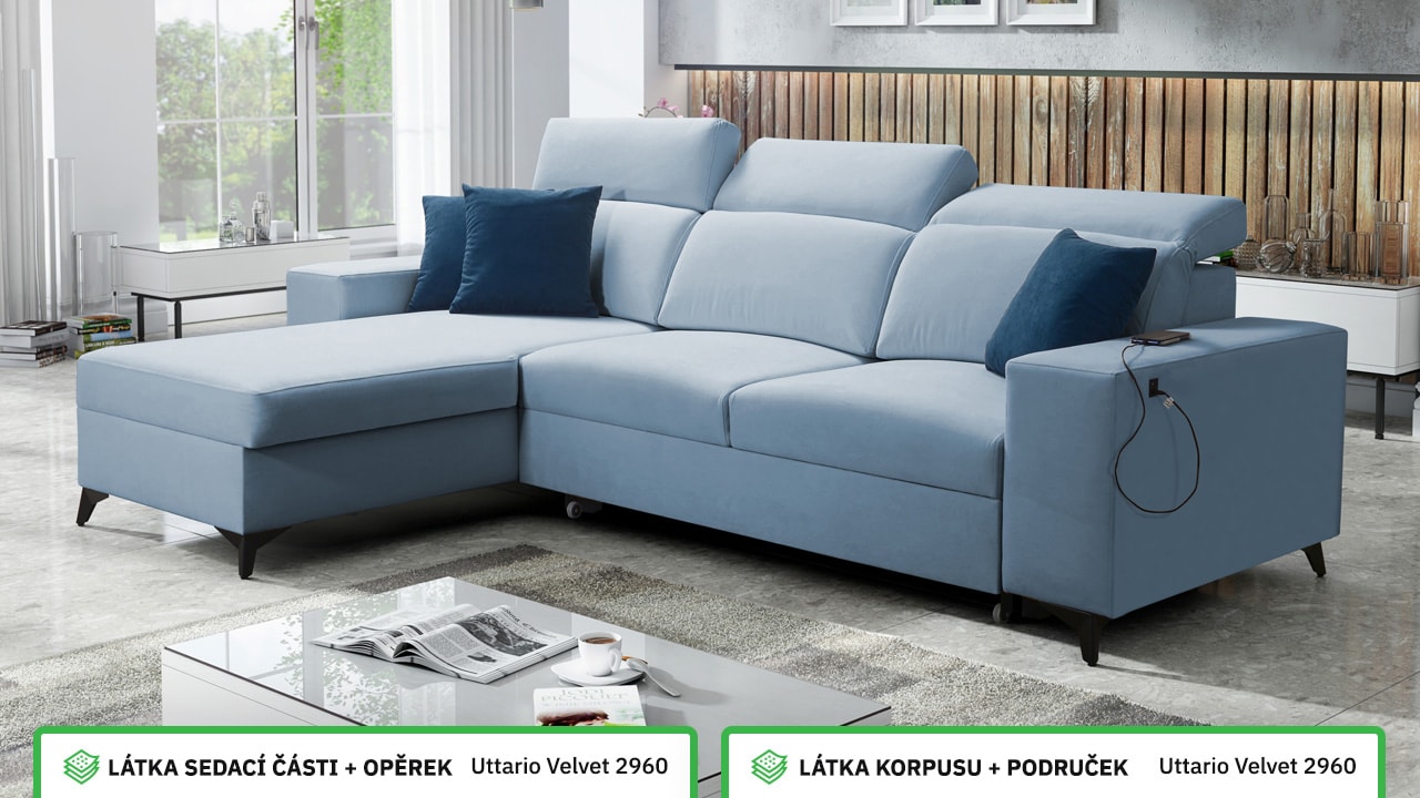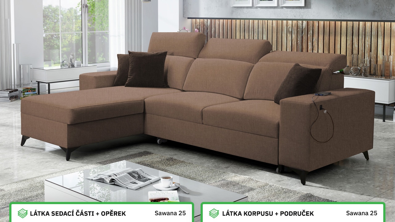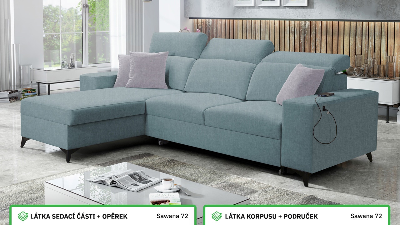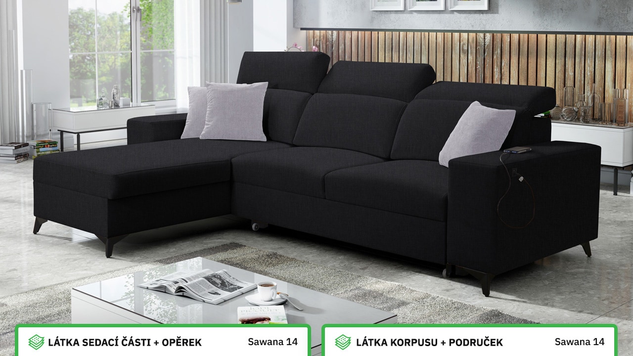 Ideální rohová pohovka pro odpočinek a lenošení. Má polohovatelné opěrky hlavy, úložný prostor a vestavěné rozkládací lůžko. Výhodou je také zabudovaný USB port pro nabíjení, díky čemuž můžete mít mobil nebo tablet vždy po ruce. Sedačku vám nabízíme s možností vlastního výběru potahového materiálu, aby ulahodila vašemu oku a zapadla do stylu vaší domácnosti. Ozdobné polštářky máte od nás grátis.