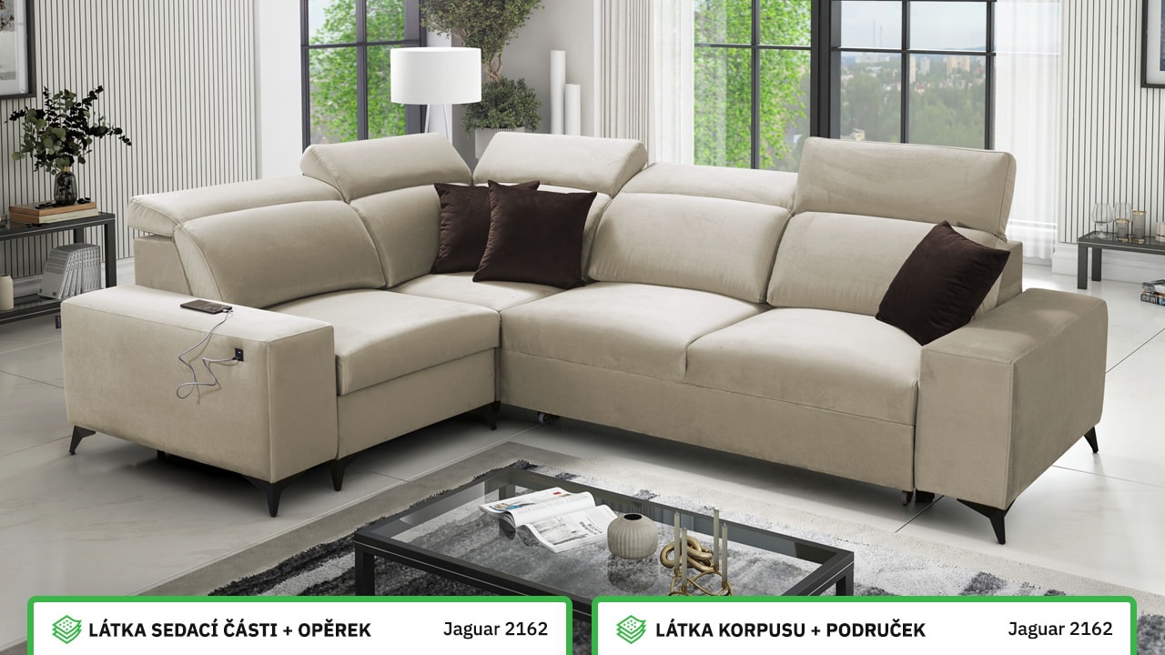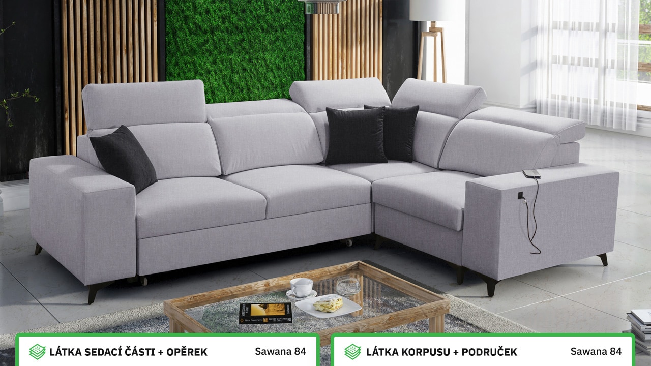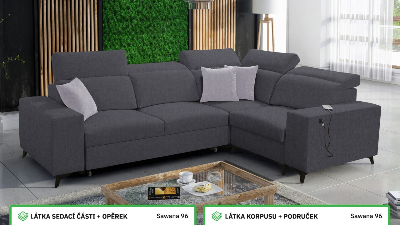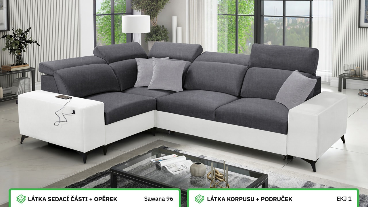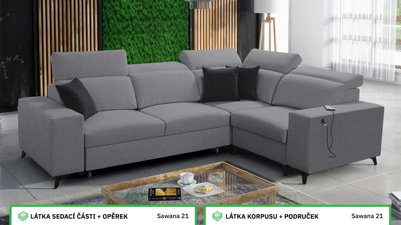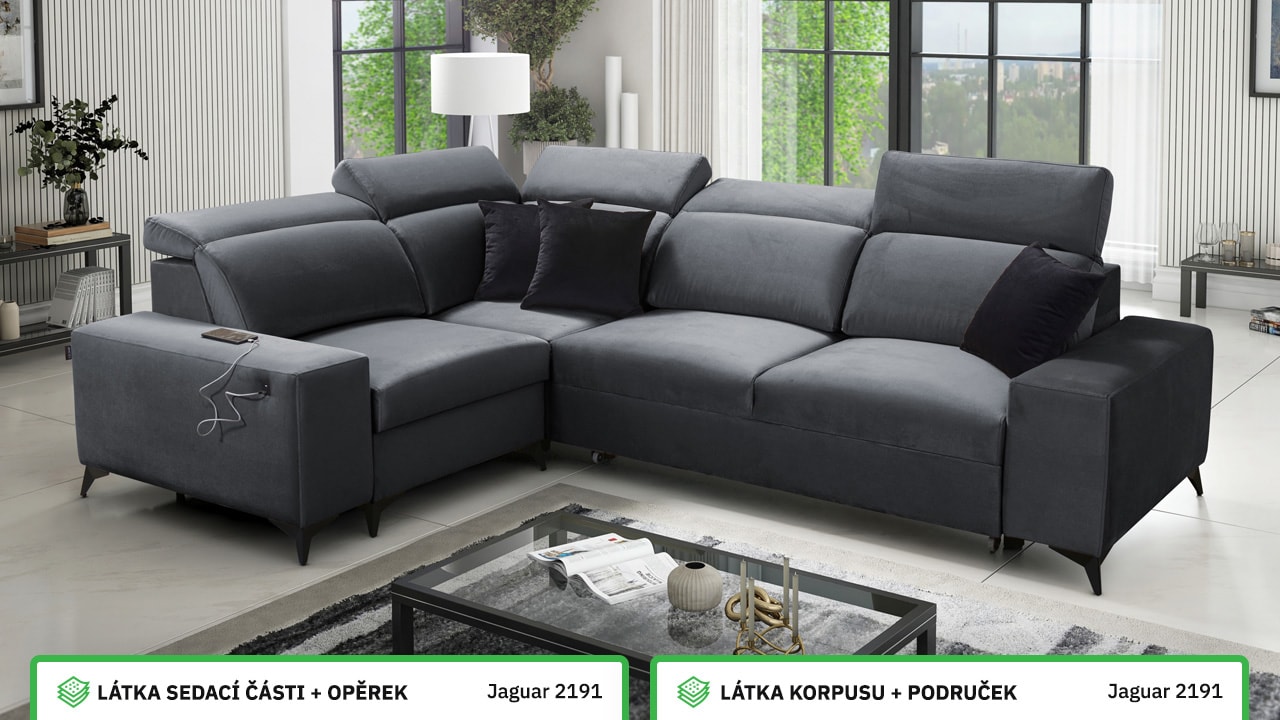 Univerzální rohová sedačka s praktickými rozměry, vhodnými i do menších bytů nebo kancelářských prostorů. Má polohovatelné opěrky hlavy, úložný prostor, možnost rozkládání a také vestavěný USB post pro dobíjení mobilu i tabletu. Sedačku si můžete nechat vyrobit v kterémkoli potahovém materiálu z naší nabídky. Dekorační polštářky ve vámi vybraném vzoru od nás dostanete k sedačce zdarma.