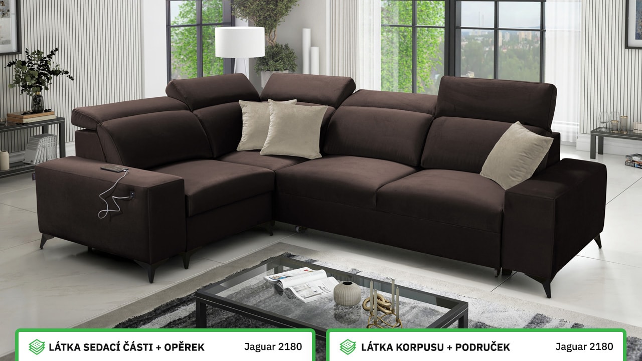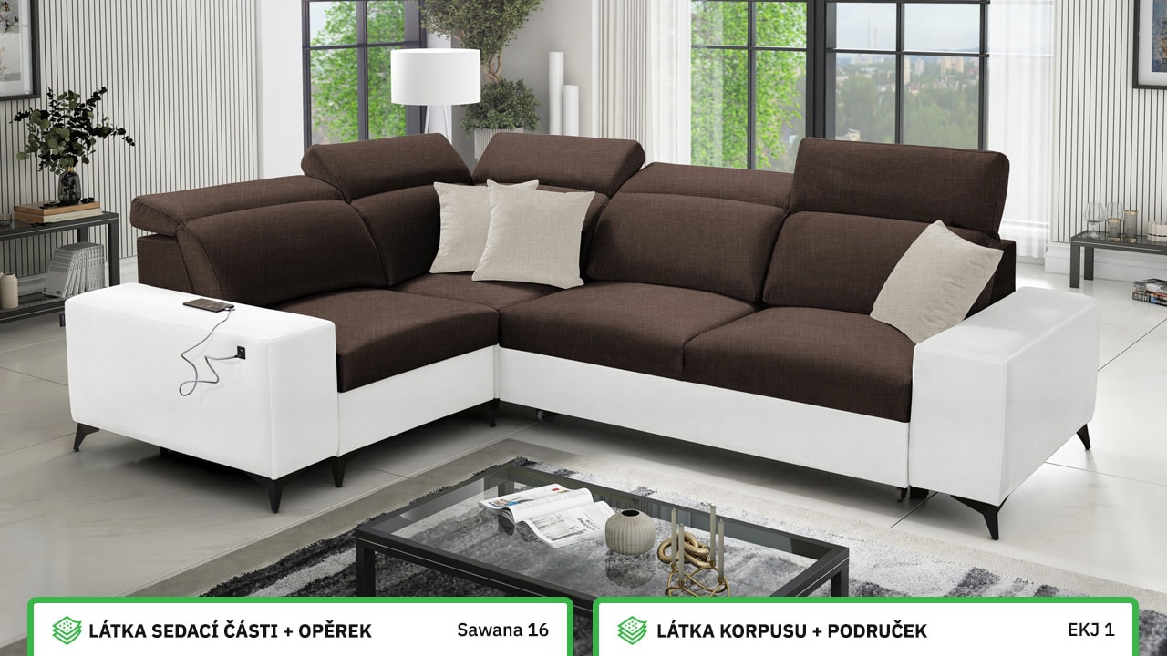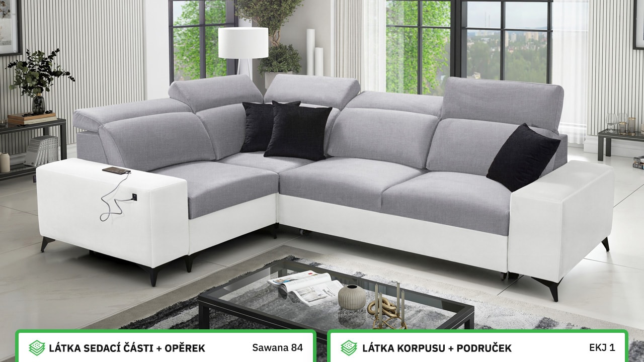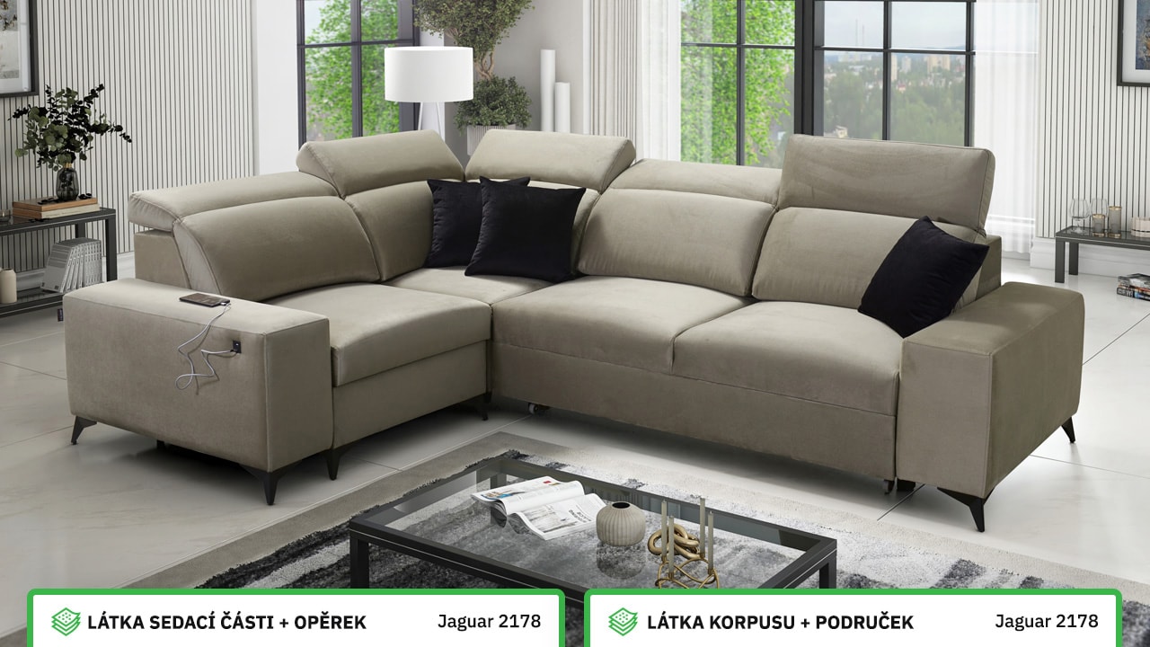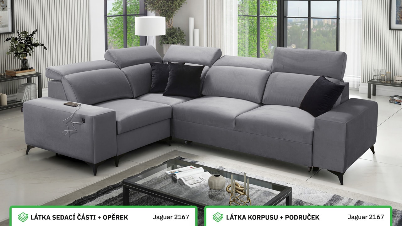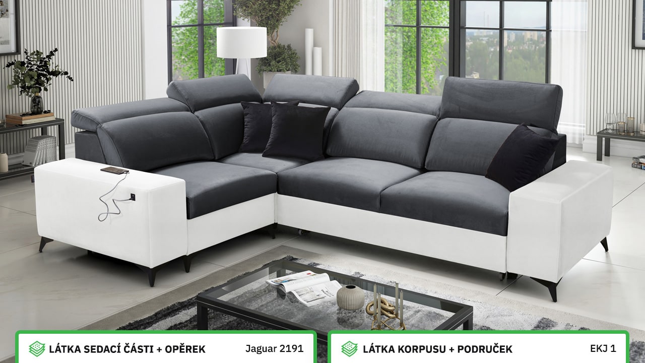 Univerzální rohová sedačka s praktickými rozměry, vhodnými i do menších bytů nebo kancelářských prostorů. Má polohovatelné opěrky hlavy, úložný prostor, možnost rozkládání a také vestavěný USB post pro dobíjení mobilu i tabletu. Sedačku si můžete nechat vyrobit v kterémkoli potahovém materiálu z naší nabídky. Dekorační polštářky ve vámi vybraném vzoru od nás dostanete k sedačce zdarma.