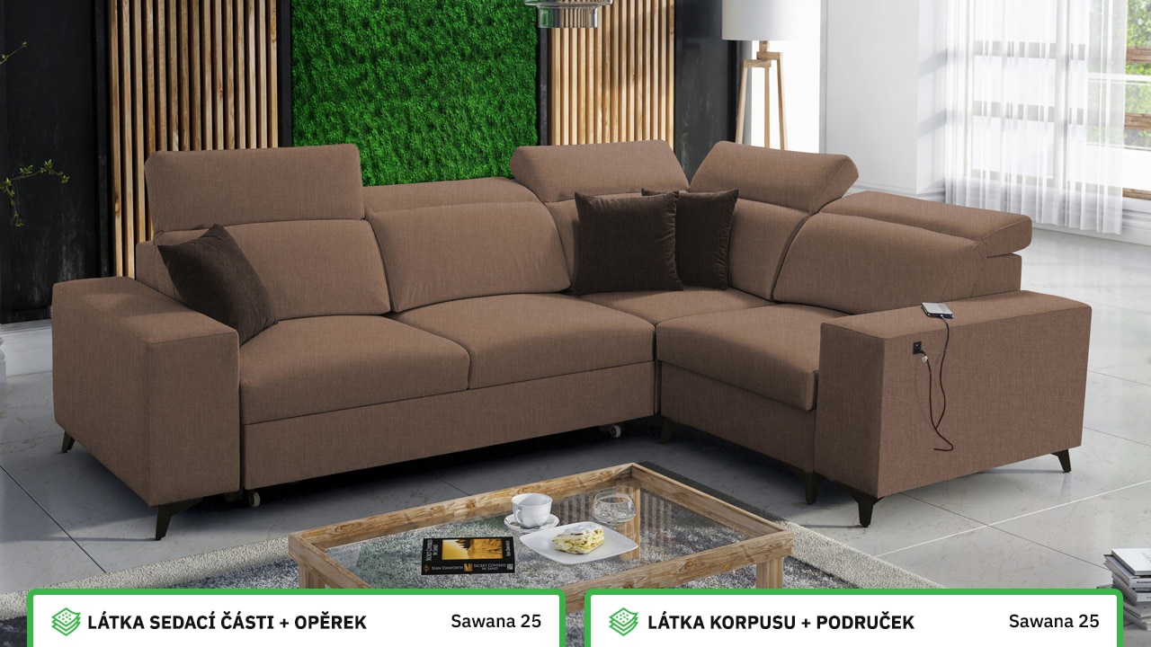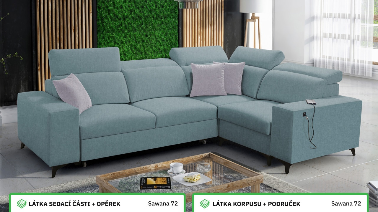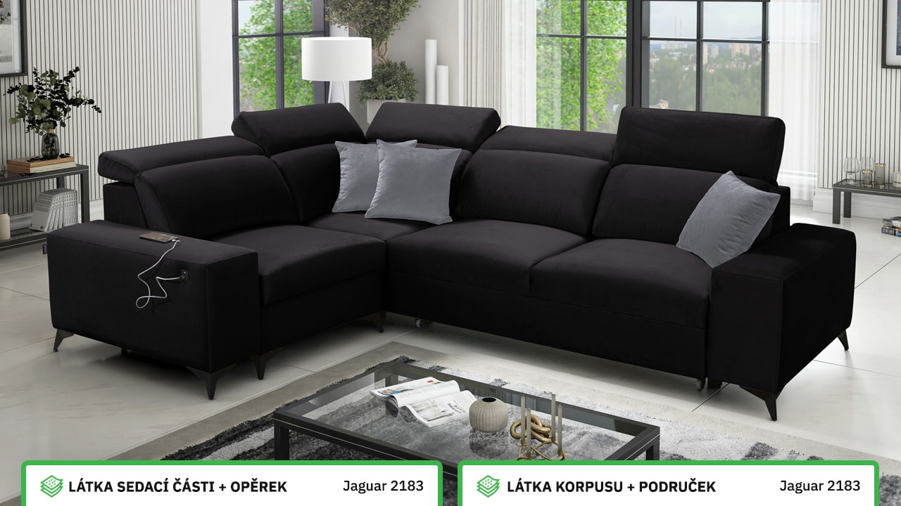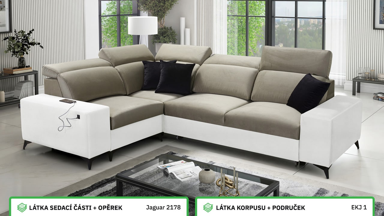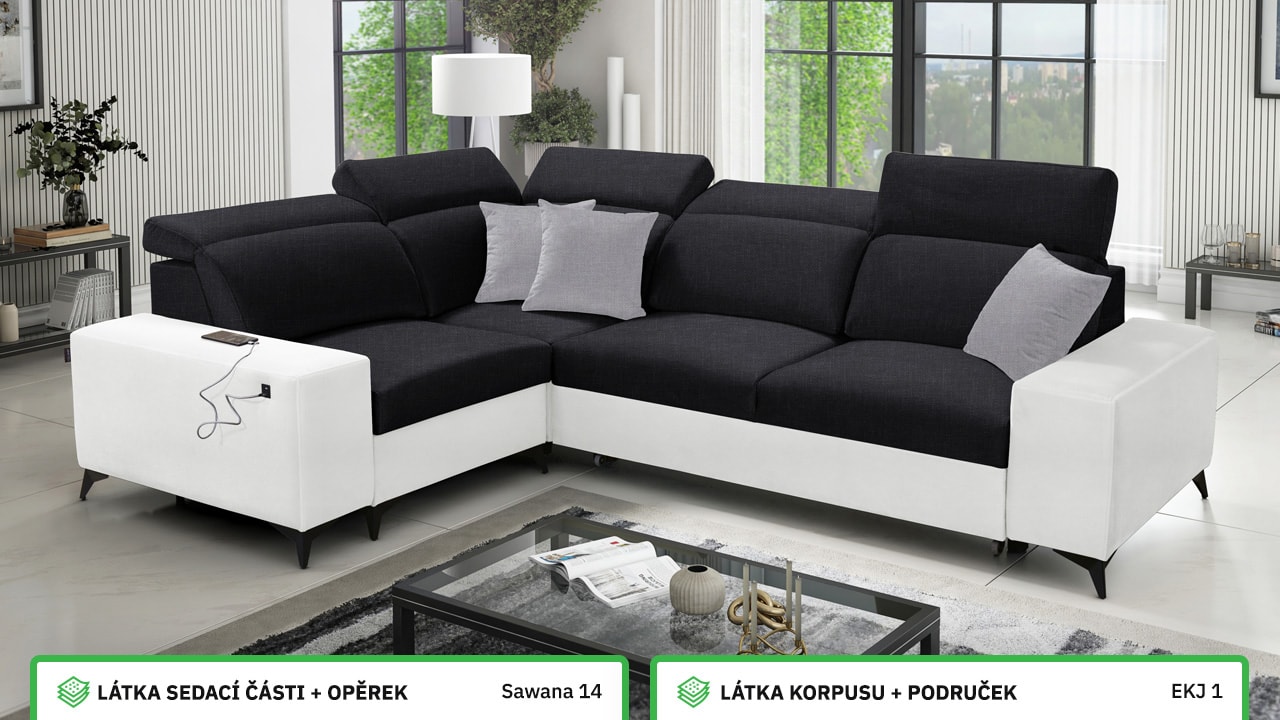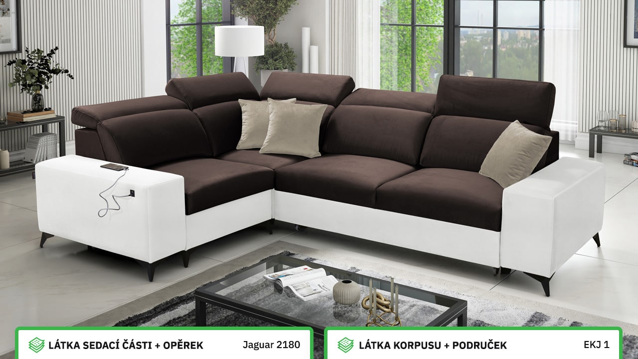 Univerzální rohová sedačka s praktickými rozměry, vhodnými i do menších bytů nebo kancelářských prostorů. Má polohovatelné opěrky hlavy, úložný prostor, možnost rozkládání a také vestavěný USB post pro dobíjení mobilu i tabletu. Sedačku si můžete nechat vyrobit v kterémkoli potahovém materiálu z naší nabídky. Dekorační polštářky ve vámi vybraném vzoru od nás dostanete k sedačce zdarma.
