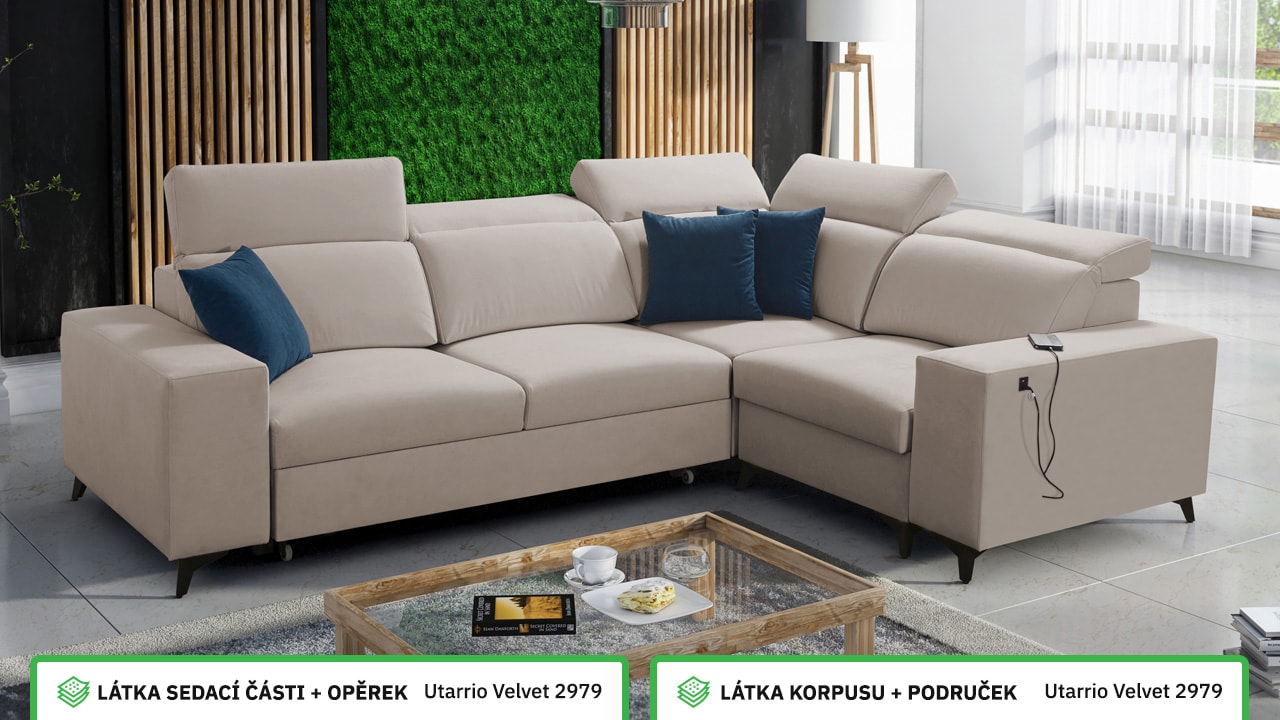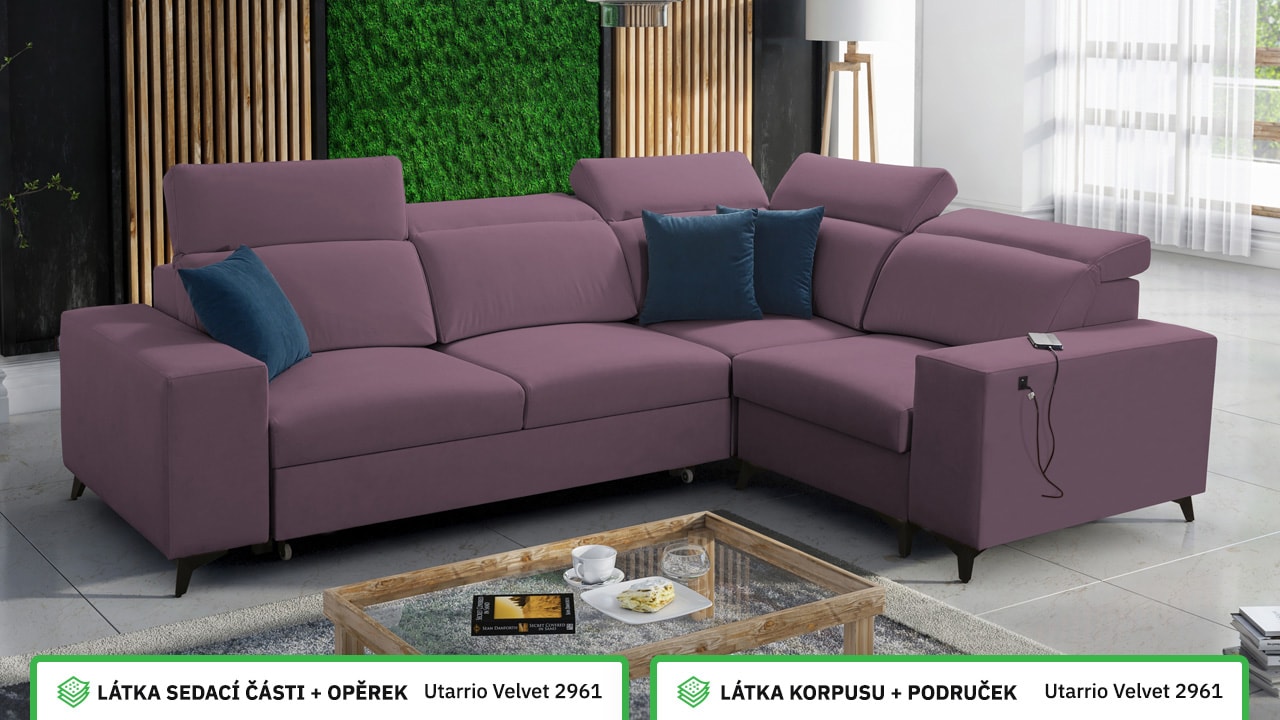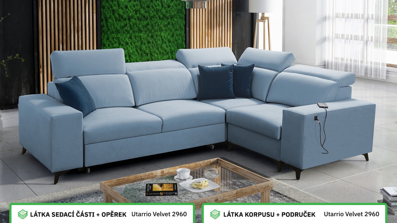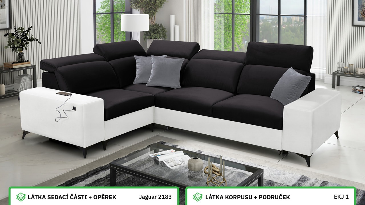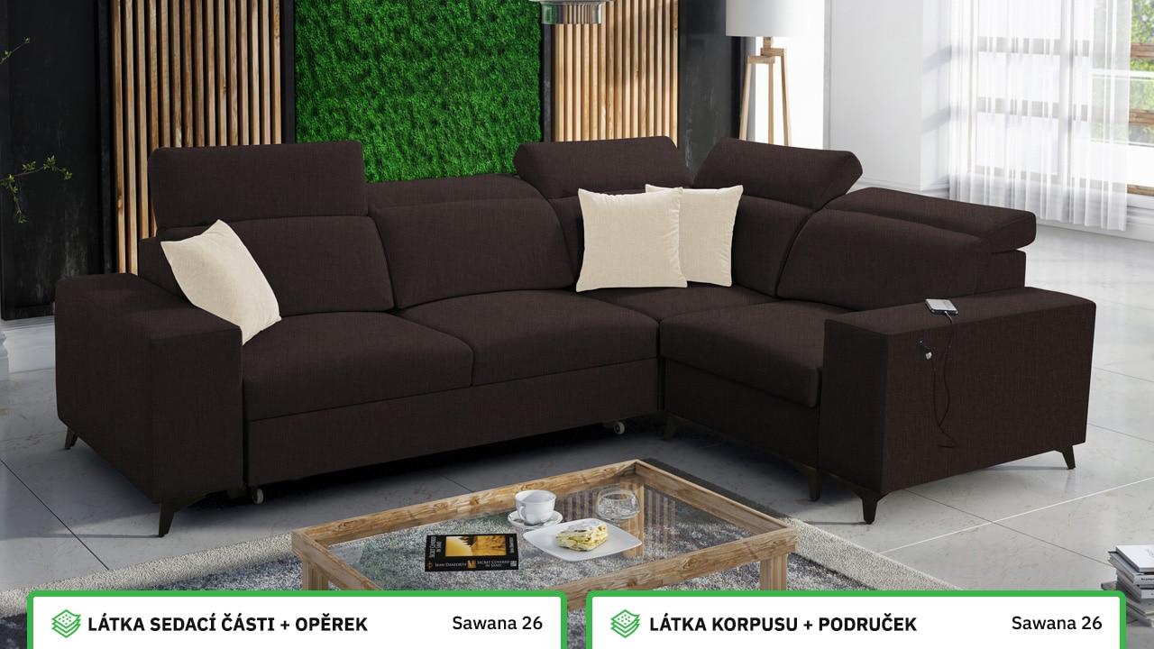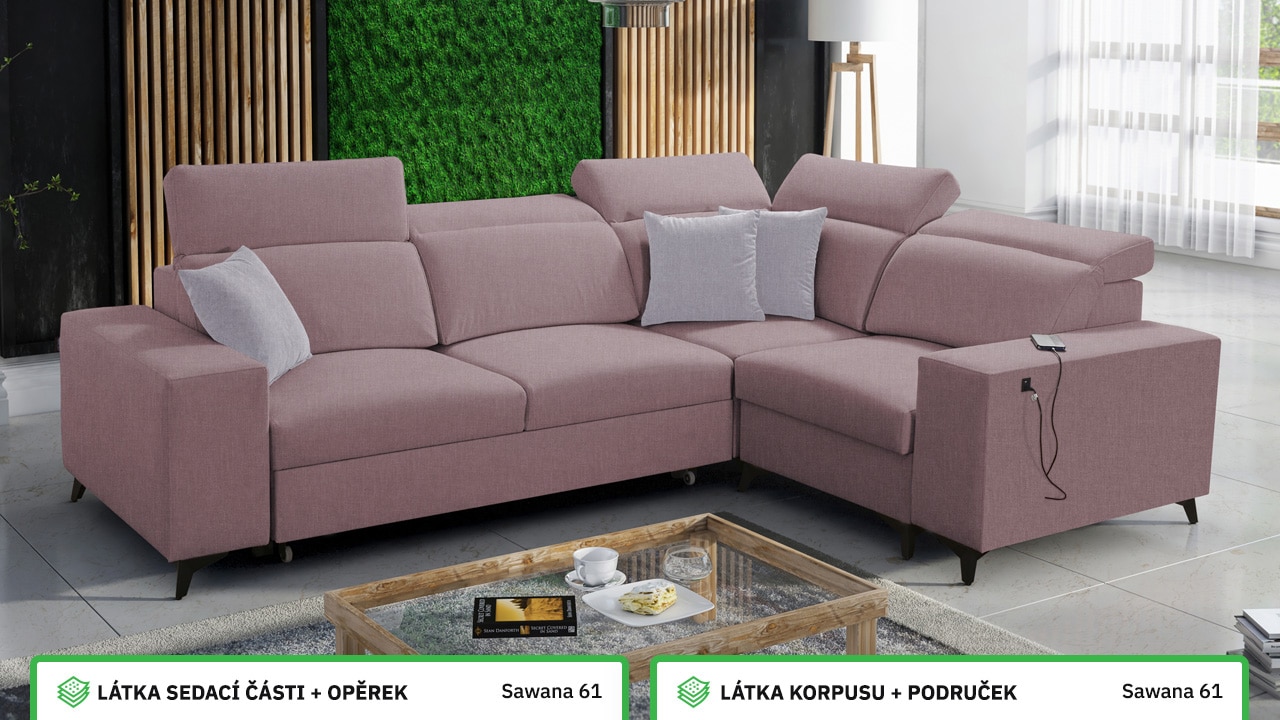 Univerzální rohová sedačka s praktickými rozměry, vhodnými i do menších bytů nebo kancelářských prostorů. Má polohovatelné opěrky hlavy, úložný prostor, možnost rozkládání a také vestavěný USB post pro dobíjení mobilu i tabletu. Sedačku si můžete nechat vyrobit v kterémkoli potahovém materiálu z naší nabídky. Dekorační polštářky ve vámi vybraném vzoru od nás dostanete k sedačce zdarma.