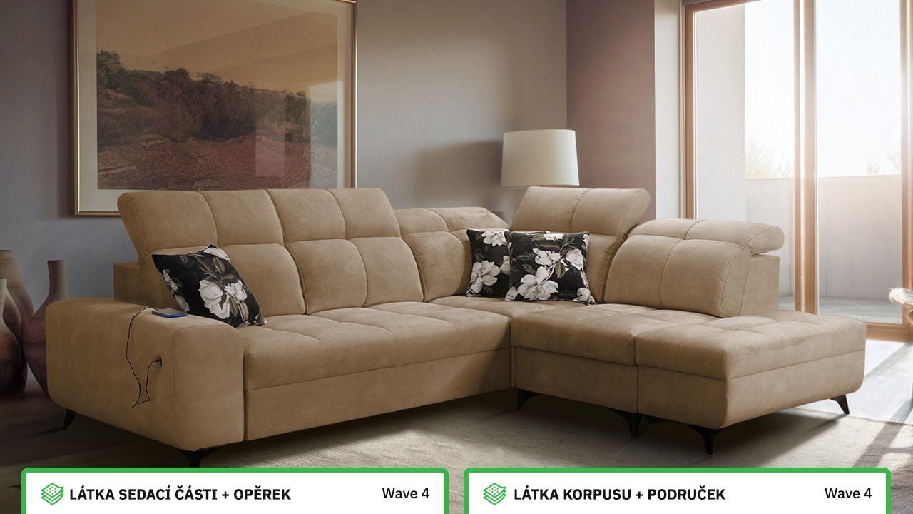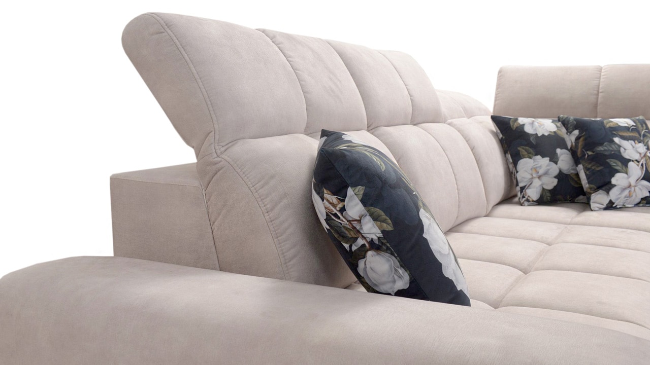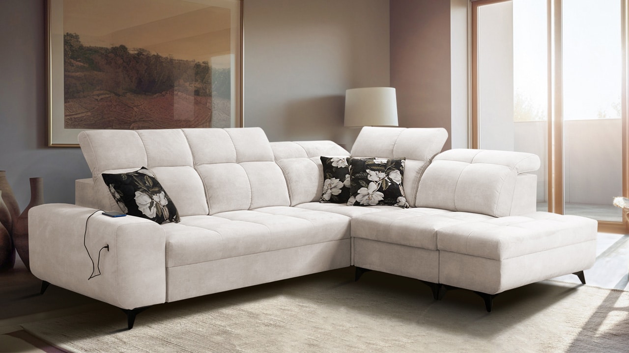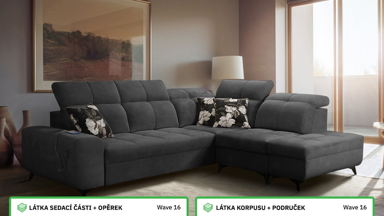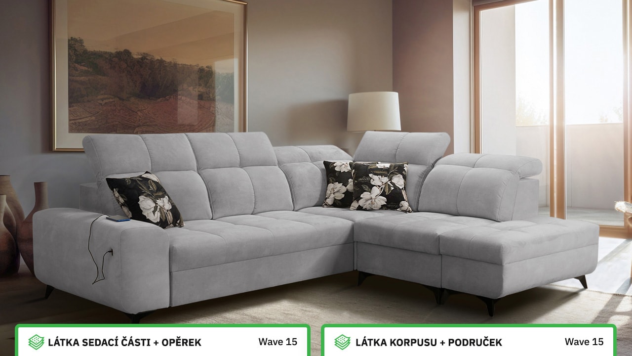 Univerzální rohová sedačka vynikne v každém interiéru. Není jen synonymem pohodlí, ale také praktičnosti a elegance. S polohovatelnými opěrkami hlavy a vestavěným USB portem pro nabití mobilu nebo tabletu se stane ideálním společníkem pro relax. Díky možnosti výběru potahového materiálu a krásnému elegantnímu designu si ji snadno přizpůsobíte do jakéhokoli stylu bydlení. Sedačku nelze vyrobit v potahech Erie, Bristol a Bahama.