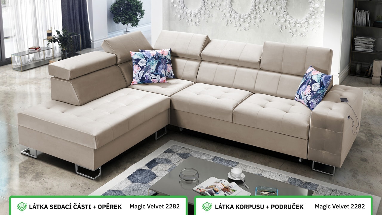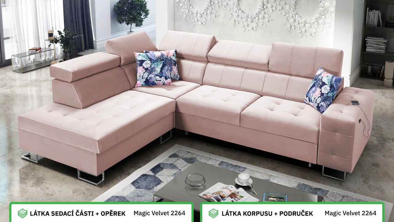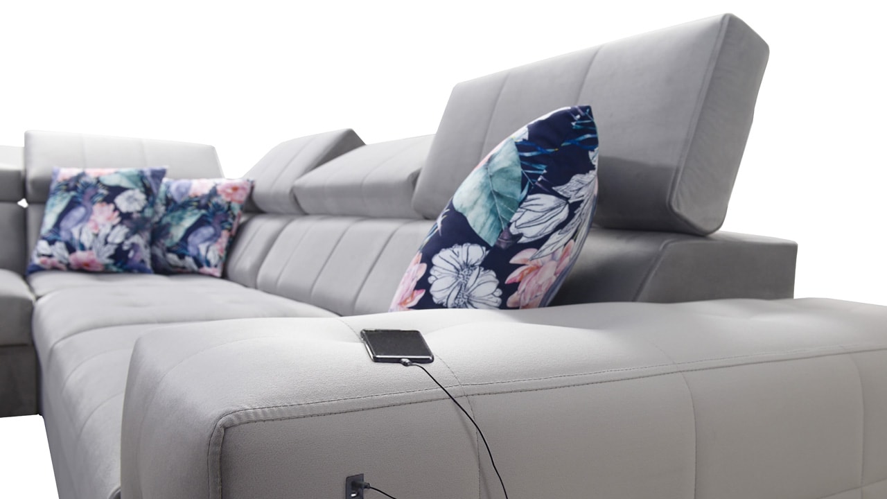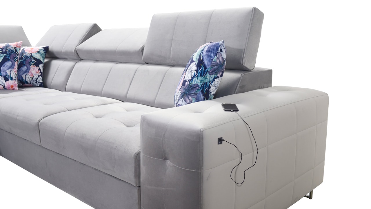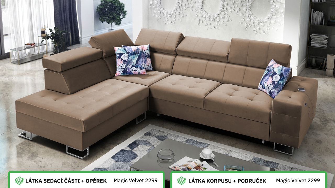 Moderní rohová sedačka, která vám poskytne flexibilitu a komfort. Podle svých představ si totiž můžete zvolit nejen barvu a typ potahové látky, ale také design nožiček a orientaci rohu na pravou či levou stranu. No a co ten komfort? Ten zajistí kvalitní výplň sezení, pohodlné opěrky páteře, nastavitelné opěrky hlavy, možnost rozložení a vestavěný USB port pro nabíjení, díky kterému budete mít mobil či tablet vždycky po ruce.