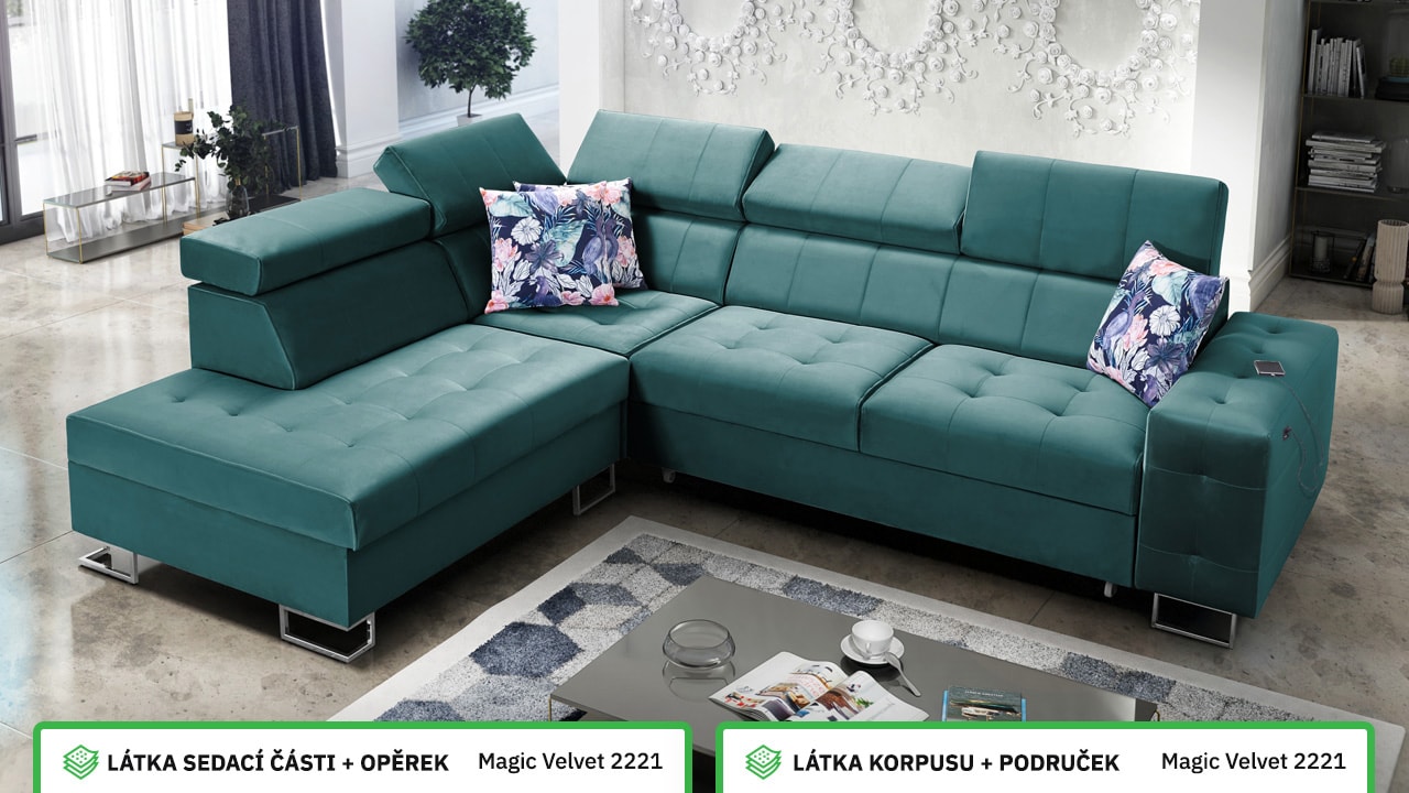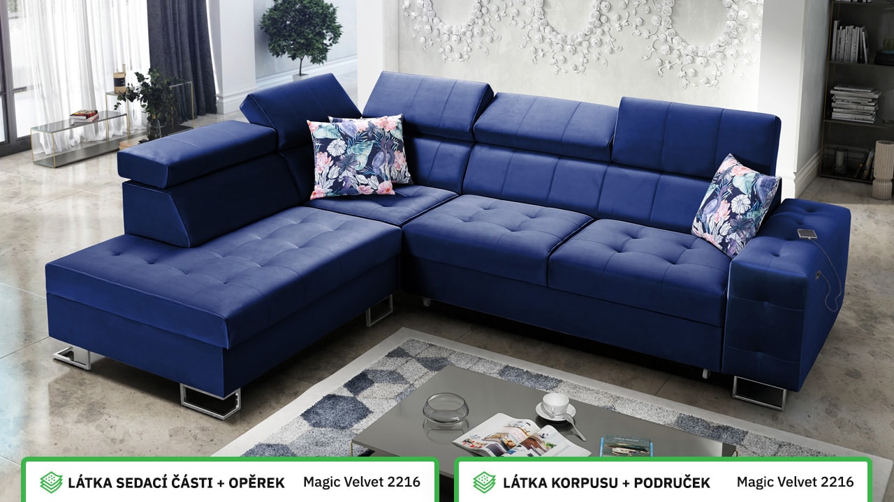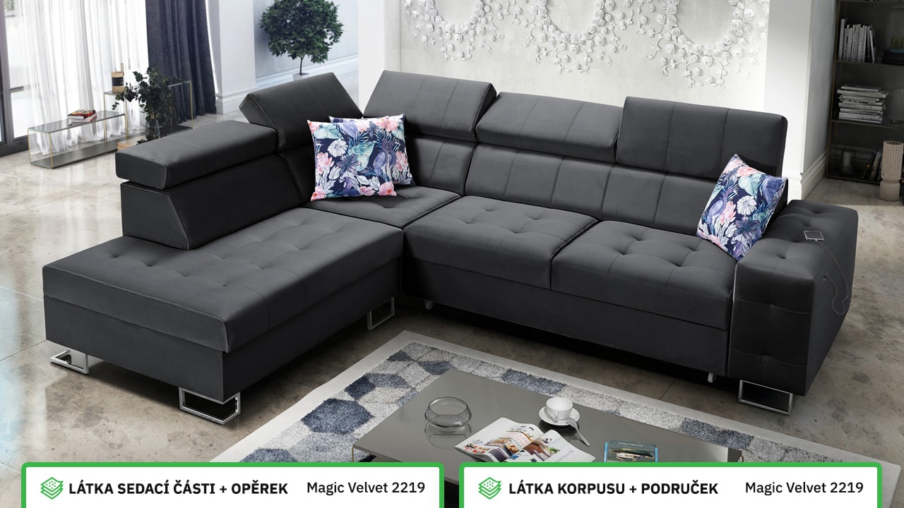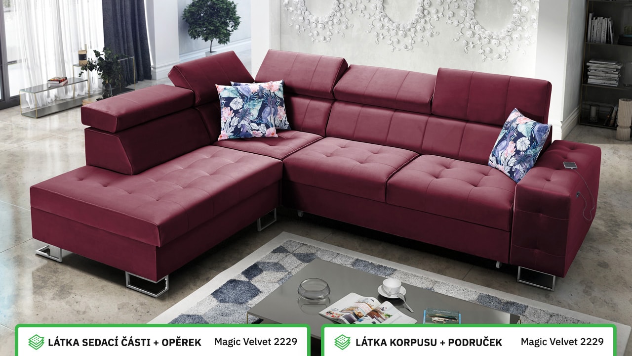 Moderní rohová sedačka, která vám poskytne flexibilitu a komfort. Podle svých představ si totiž můžete zvolit nejen barvu a typ potahové látky, ale také design nožiček a orientaci rohu na pravou či levou stranu. No a co ten komfort? Ten zajistí kvalitní výplň sezení, pohodlné opěrky páteře, nastavitelné opěrky hlavy, možnost rozložení a vestavěný USB port pro nabíjení, díky kterému budete mít mobil či tablet vždycky po ruce.