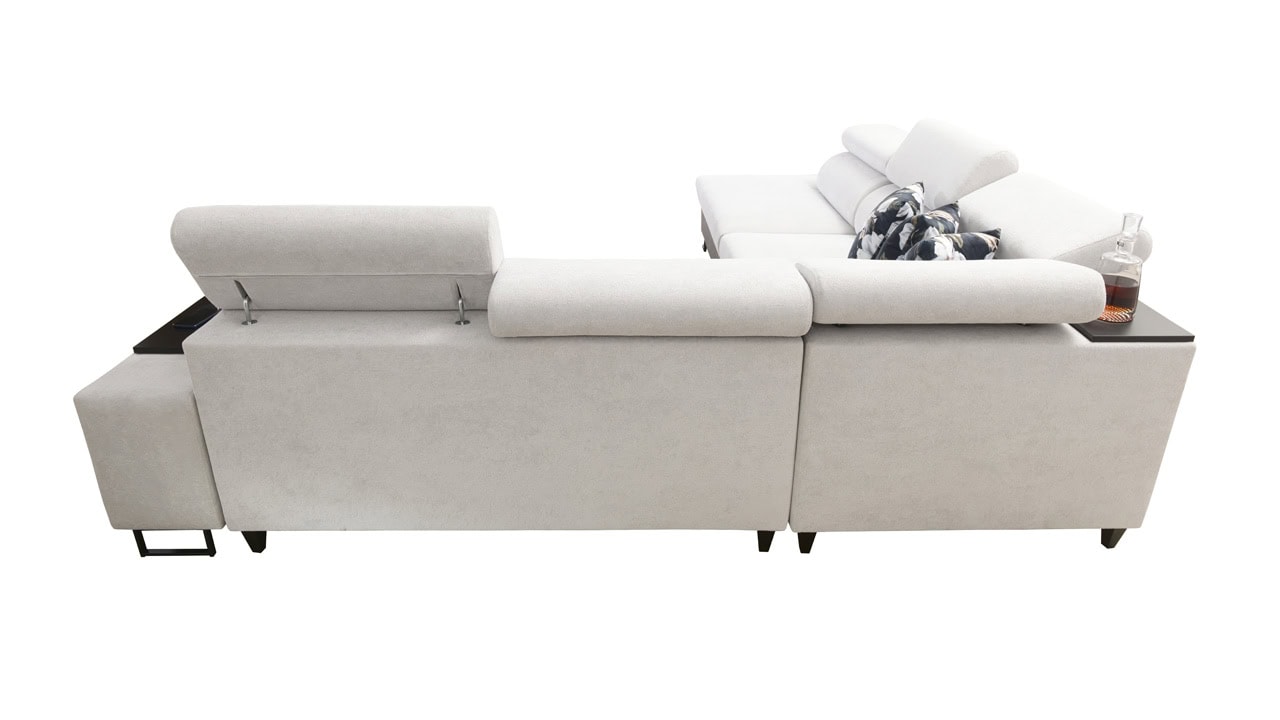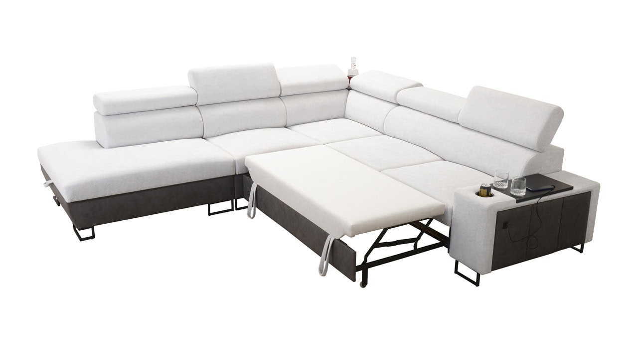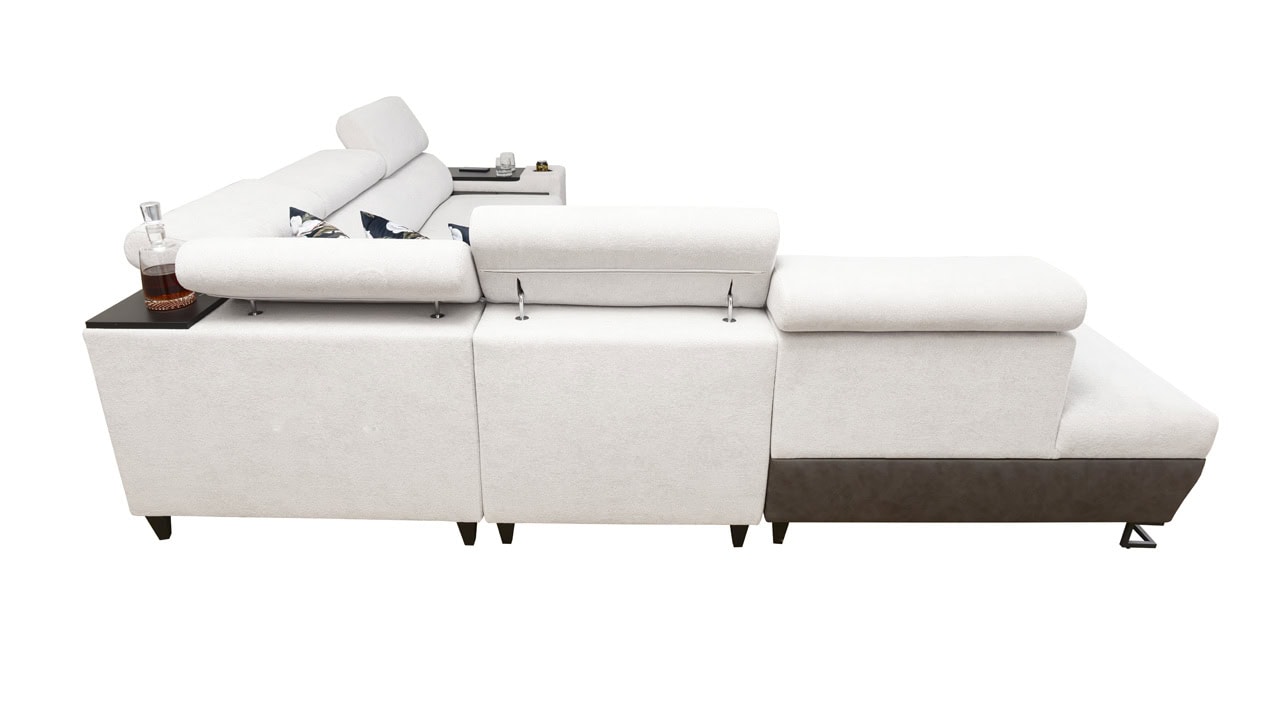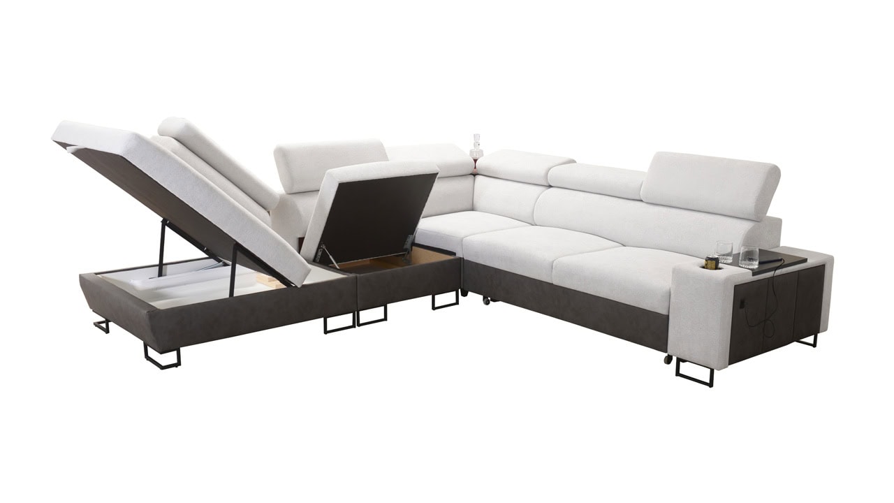 Velká rohová sedačka pro vaše moderní bydlení. Je vybavena vším, co byste od sedačky mohli očekávat – dá se rozložit, ukrývá velký úložný prostor, má nastavitelné opěrky hlavy, vestavěný minibar, držák na sklenici, a také zabudovanou USB nabíječku pro nabití mobilu nebo tabletu. Kromě toho je extra pohodlná, díky čemuž se stane dokonalým společníkem na dlouhé večery při filmu či dobré knize.