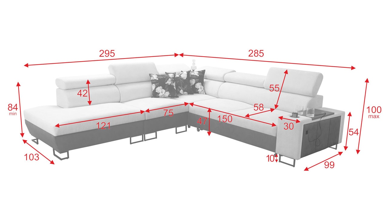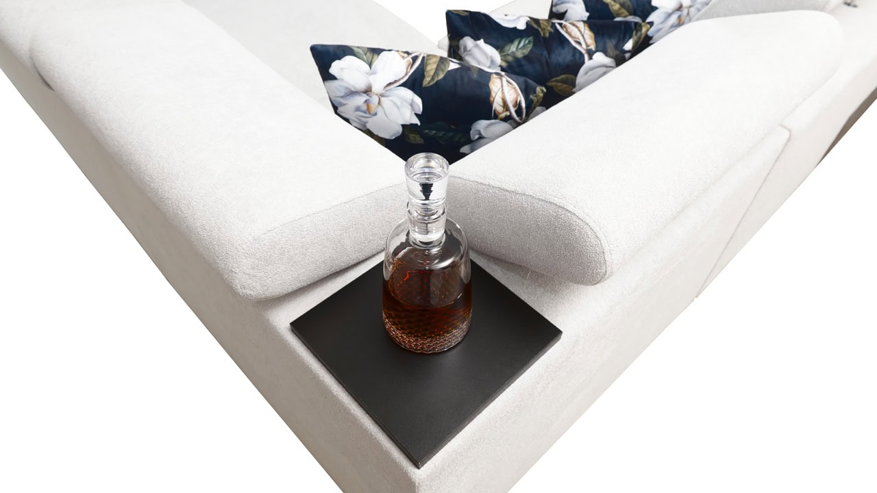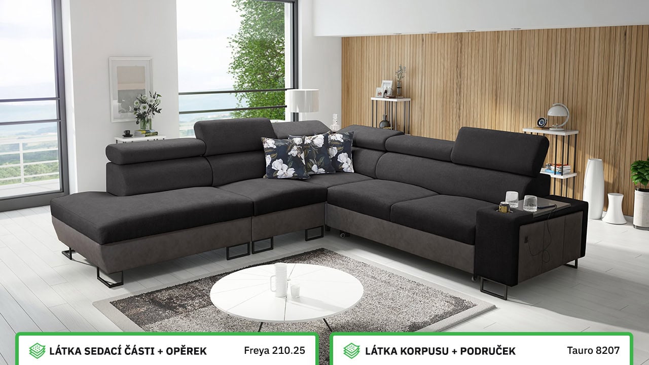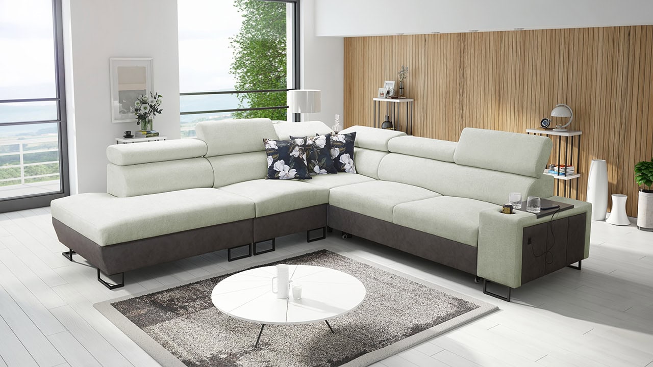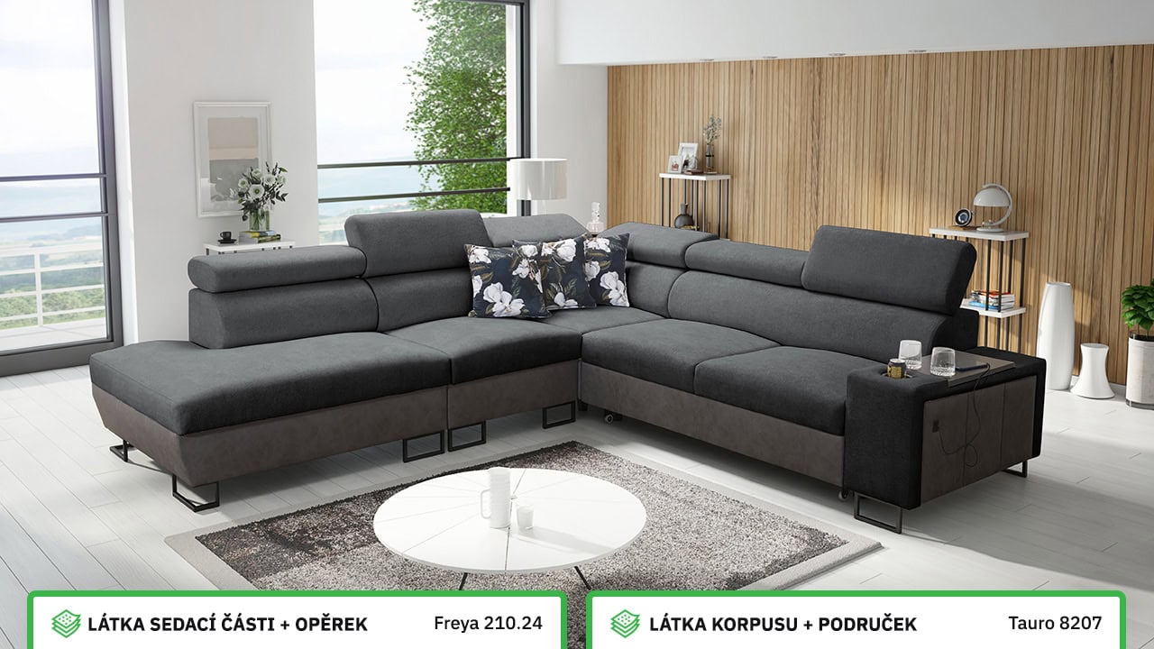 Velká rohová sedačka pro vaše moderní bydlení. Je vybavena vším, co byste od sedačky mohli očekávat – dá se rozložit, ukrývá velký úložný prostor, má nastavitelné opěrky hlavy, vestavěný minibar, držák na sklenici, a také zabudovanou USB nabíječku pro nabití mobilu nebo tabletu. Kromě toho je extra pohodlná, díky čemuž se stane dokonalým společníkem na dlouhé večery při filmu či dobré knize.