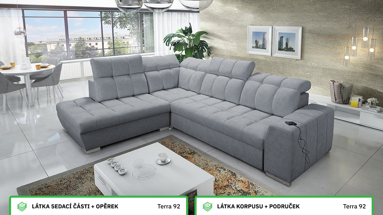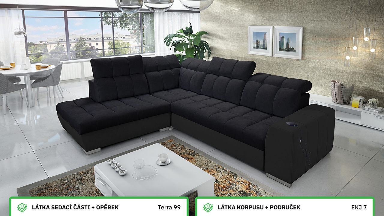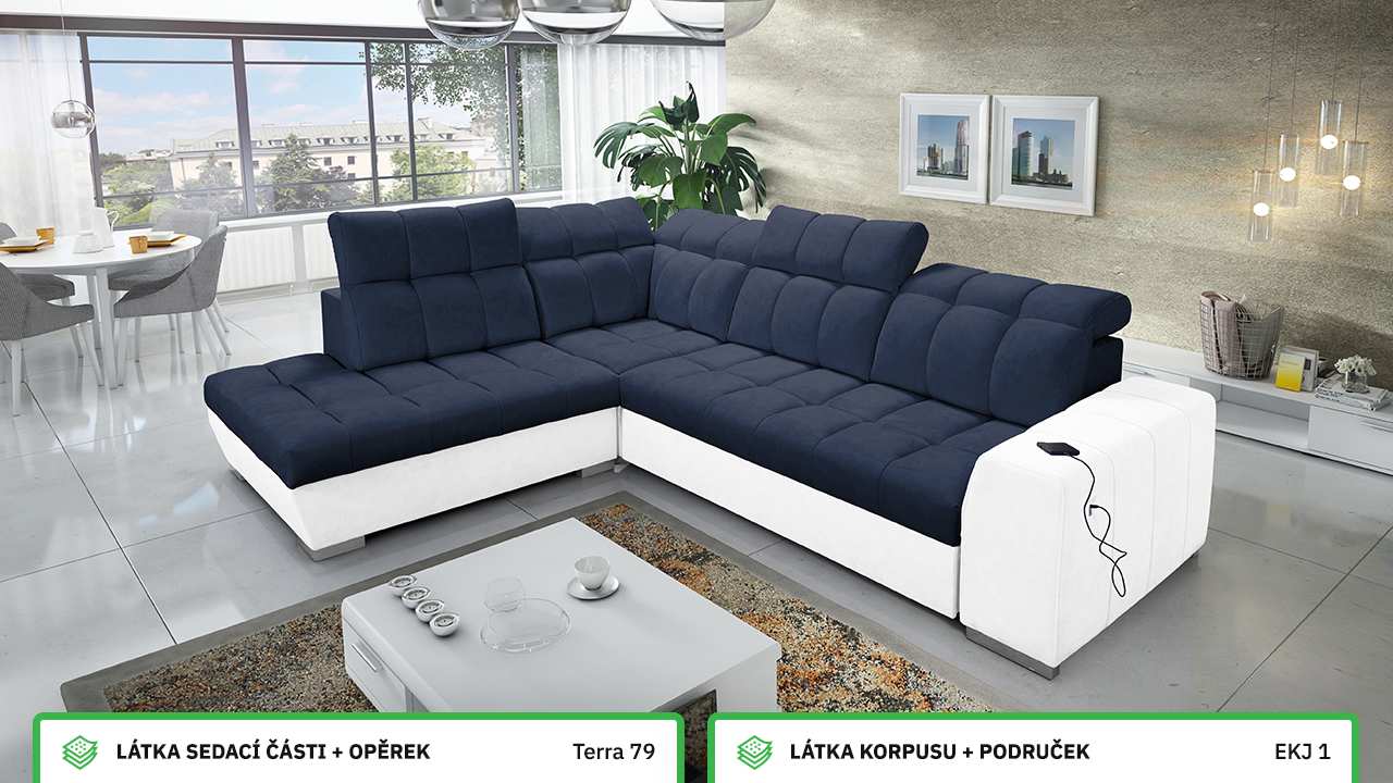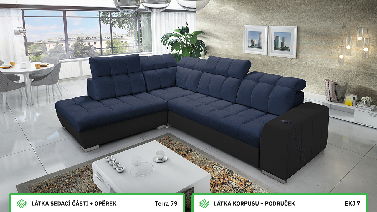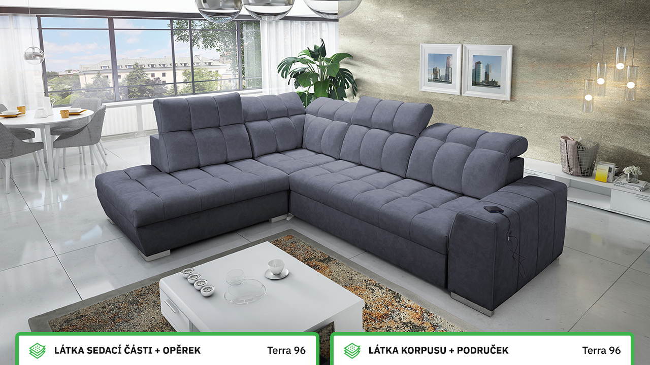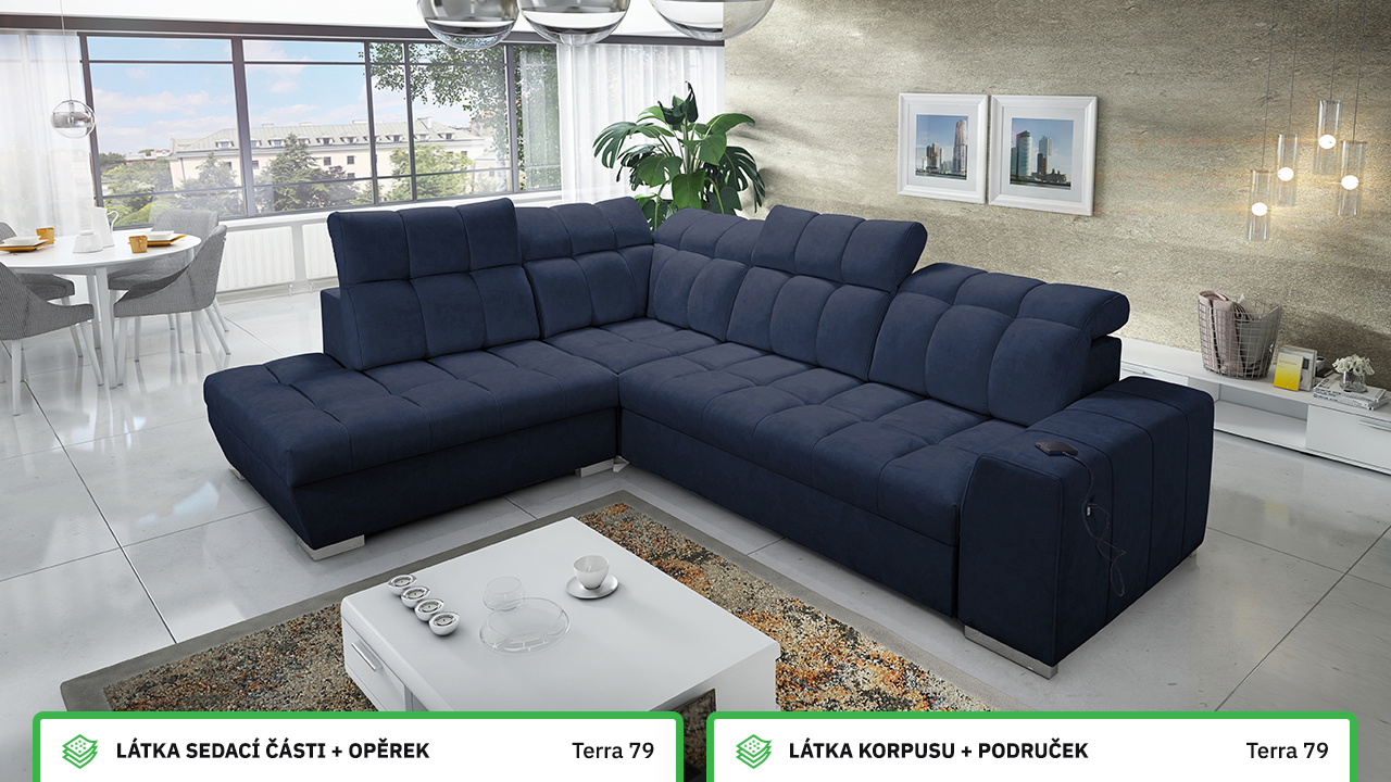 Tuto rohovou sedací soupravu si můžete sami dotvořit tak, aby odpovídala vaší představě dokonalé sedačky. Vyberte si levý nebo pravý roh, design nožiček a barvu i typ potahové látky. Jediné, co je neměnné, jsou její rozměry a praktické funkce, které zajisté oceníte – například polohovatelné opěrky hlavy, možnost rozložení či úložný prostor. Sedačku nelze vyrobit v potahových látkách Erie, Bristol a Bahama.