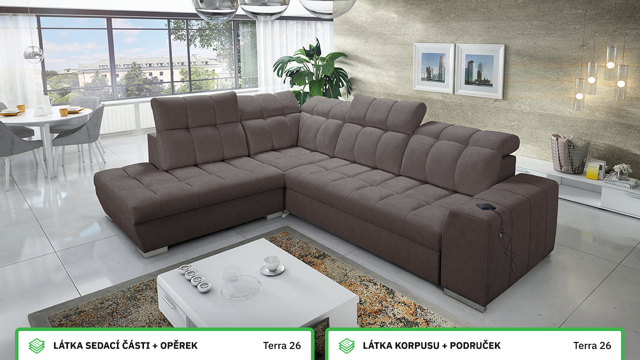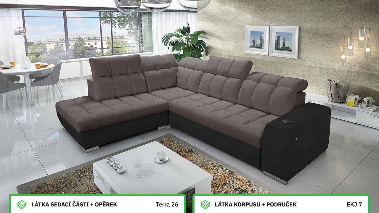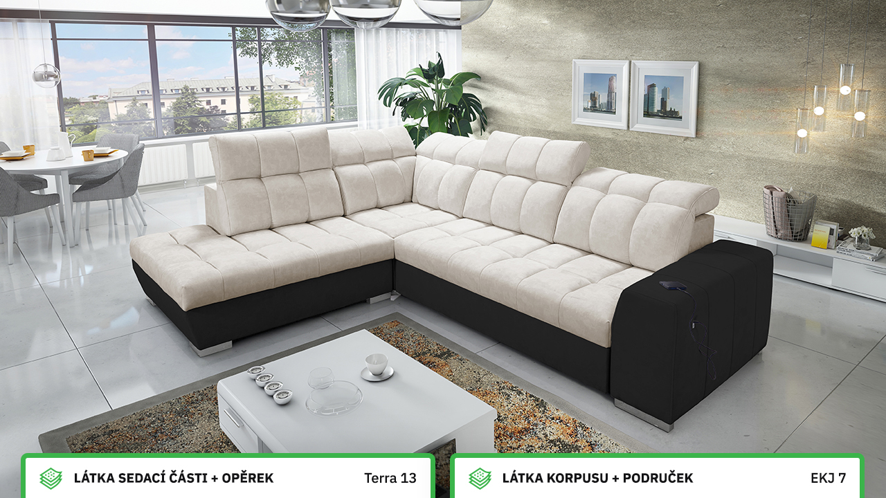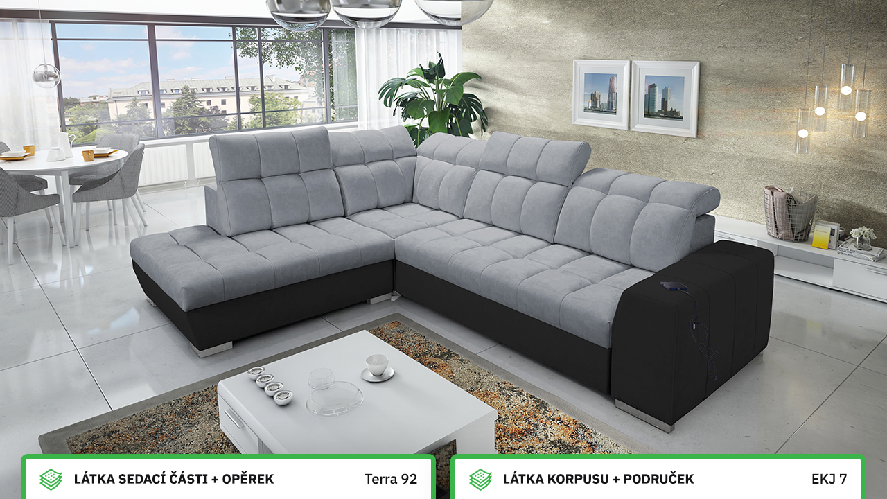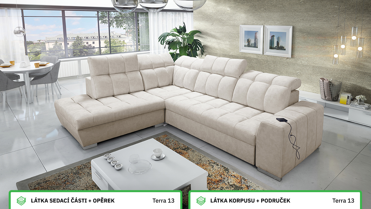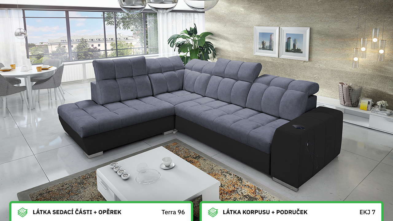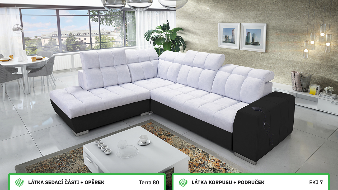 Tuto rohovou sedací soupravu si můžete sami dotvořit tak, aby odpovídala vaší představě dokonalé sedačky. Vyberte si levý nebo pravý roh, design nožiček a barvu i typ potahové látky. Jediné, co je neměnné, jsou její rozměry a praktické funkce, které zajisté oceníte – například polohovatelné opěrky hlavy, možnost rozložení či úložný prostor. Sedačku nelze vyrobit v potahových látkách Erie, Bristol a Bahama.