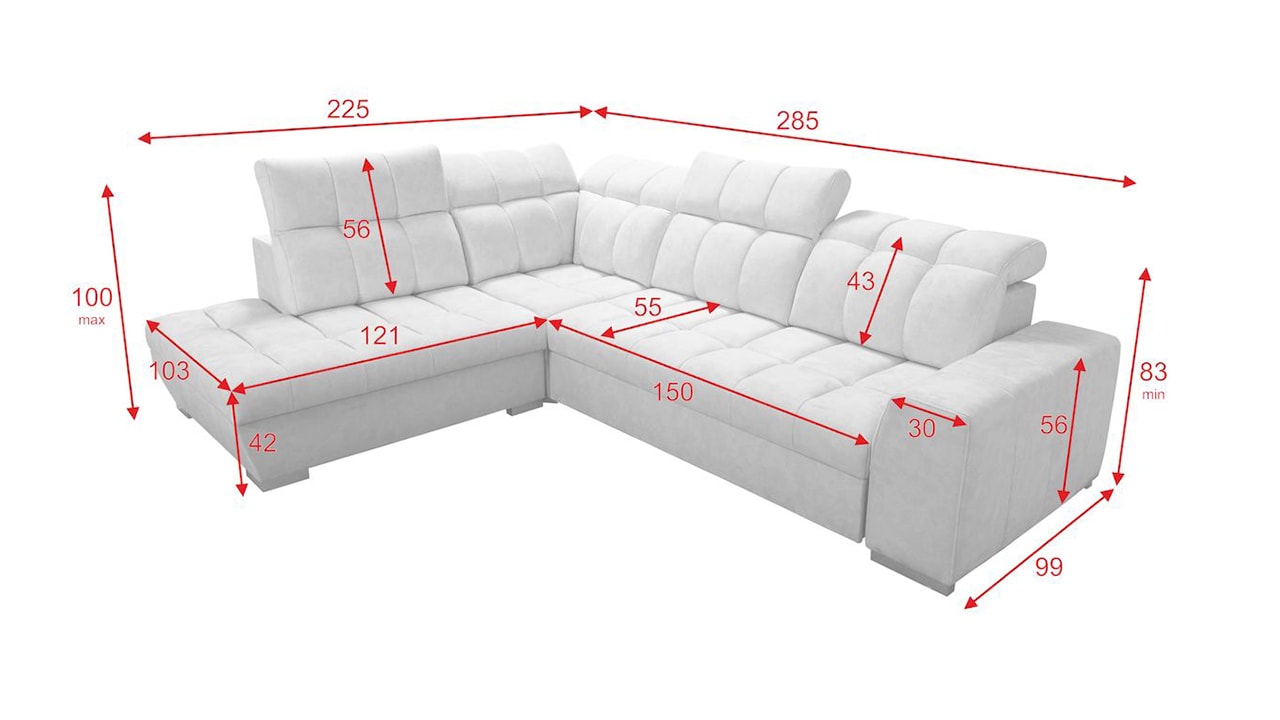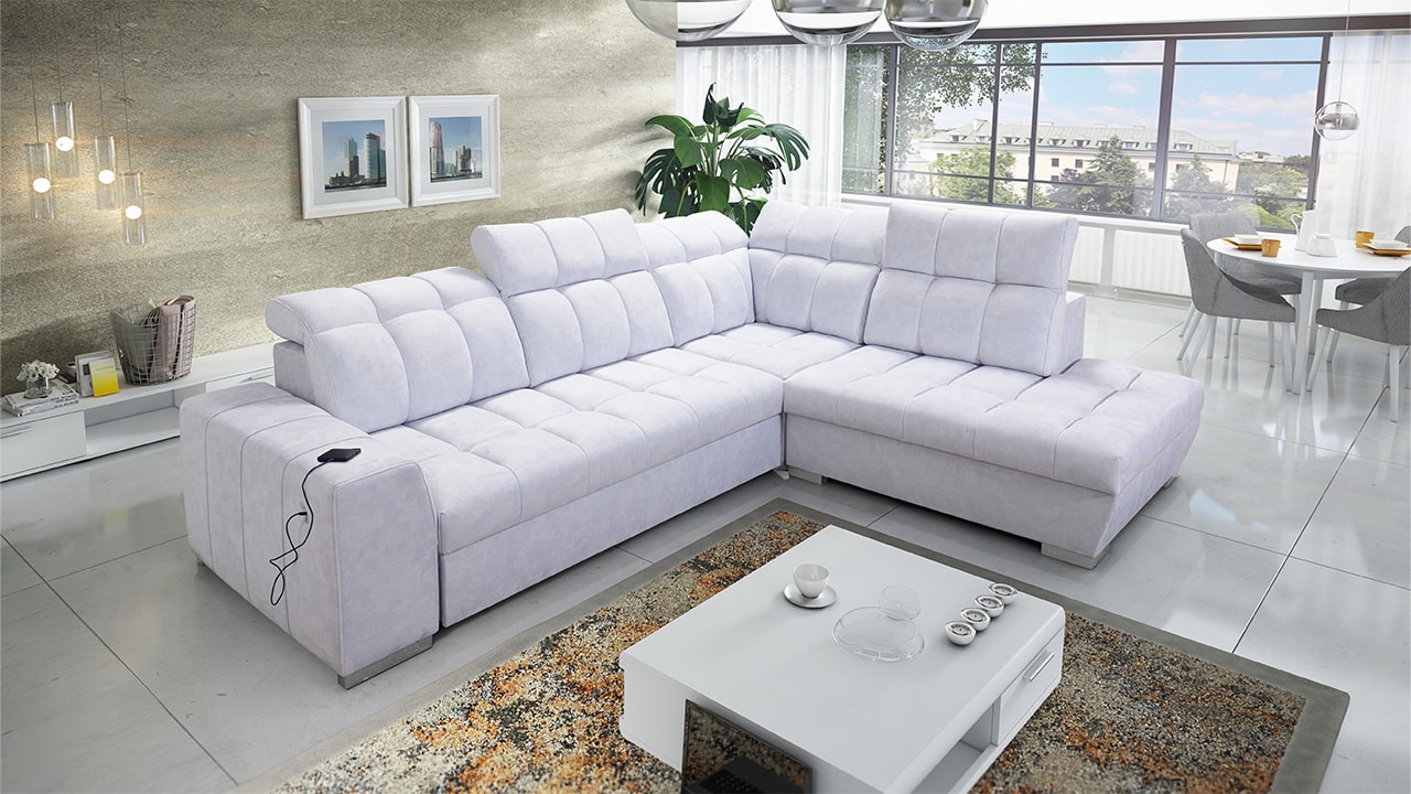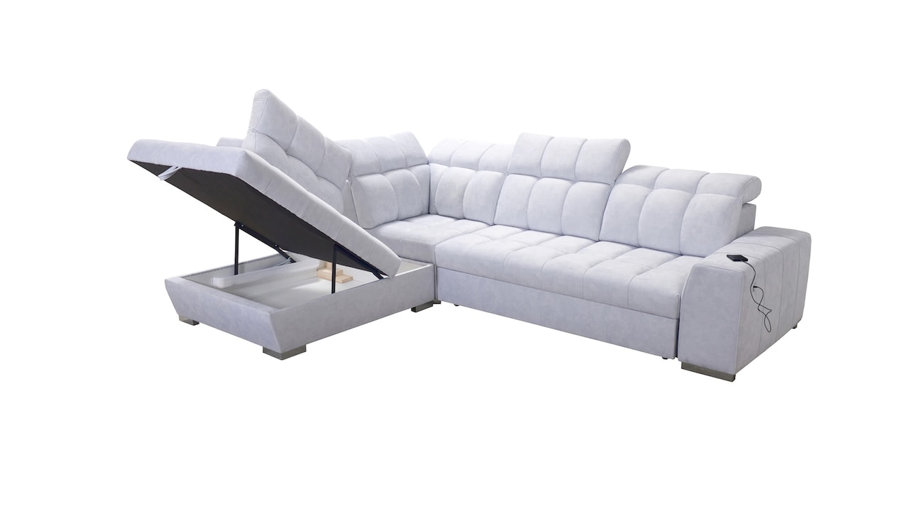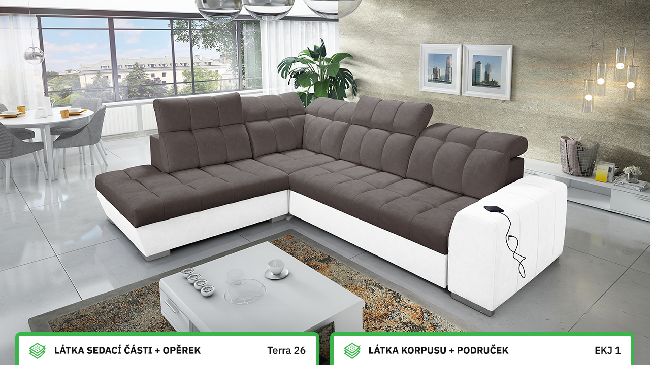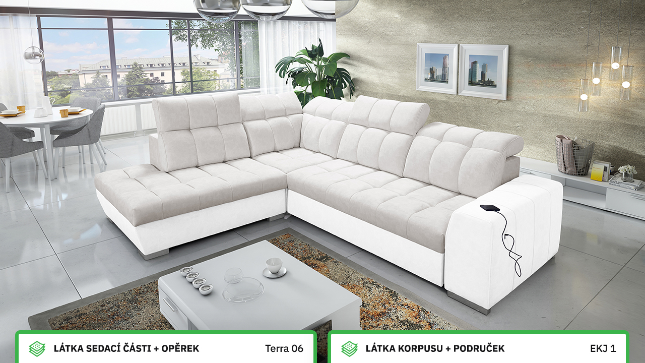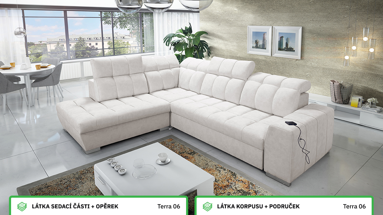 Tuto rohovou sedací soupravu si můžete sami dotvořit tak, aby odpovídala vaší představě dokonalé sedačky. Vyberte si levý nebo pravý roh, design nožiček a barvu i typ potahové látky. Jediné, co je neměnné, jsou její rozměry a praktické funkce, které zajisté oceníte – například polohovatelné opěrky hlavy, možnost rozložení či úložný prostor. Sedačku nelze vyrobit v potahových látkách Erie, Bristol a Bahama.