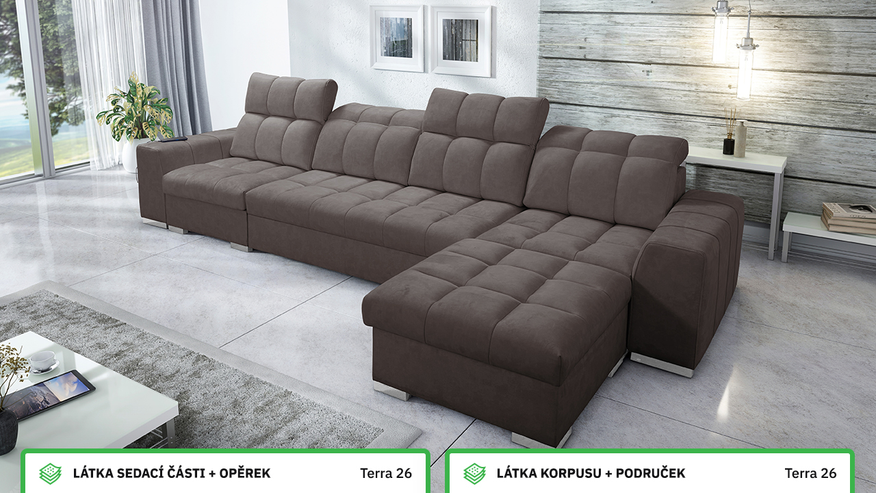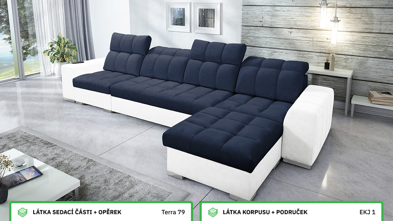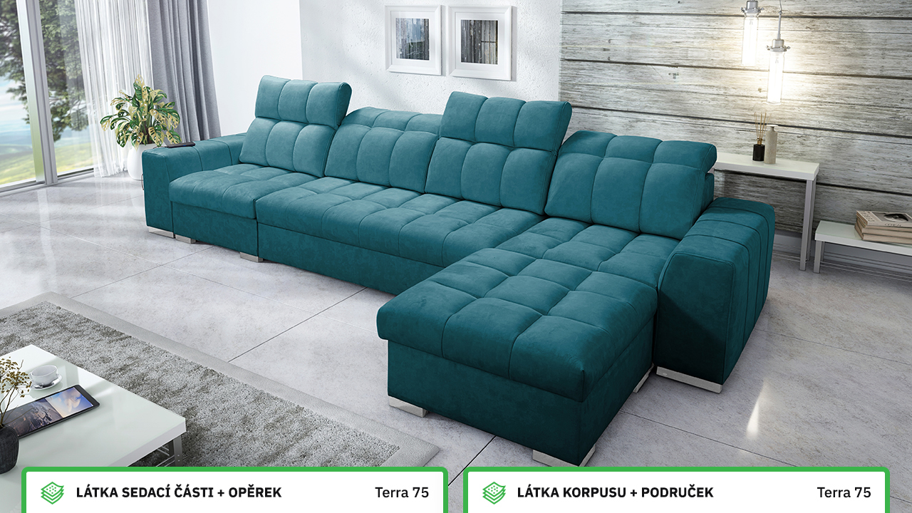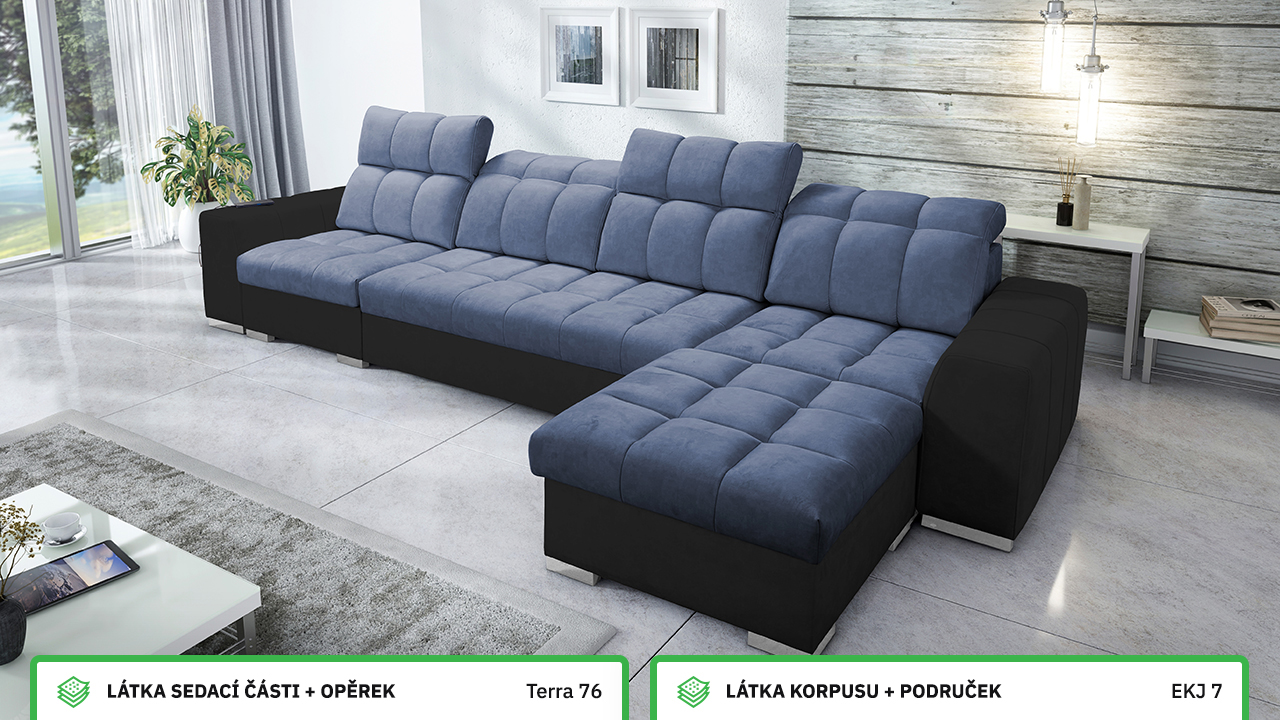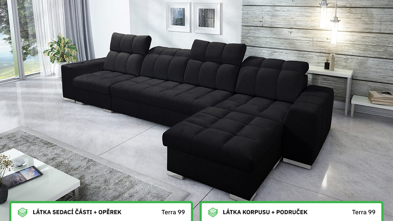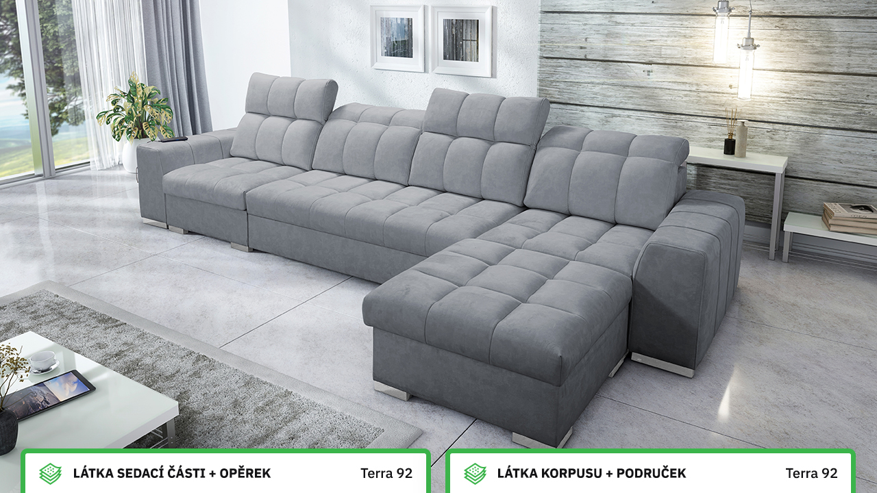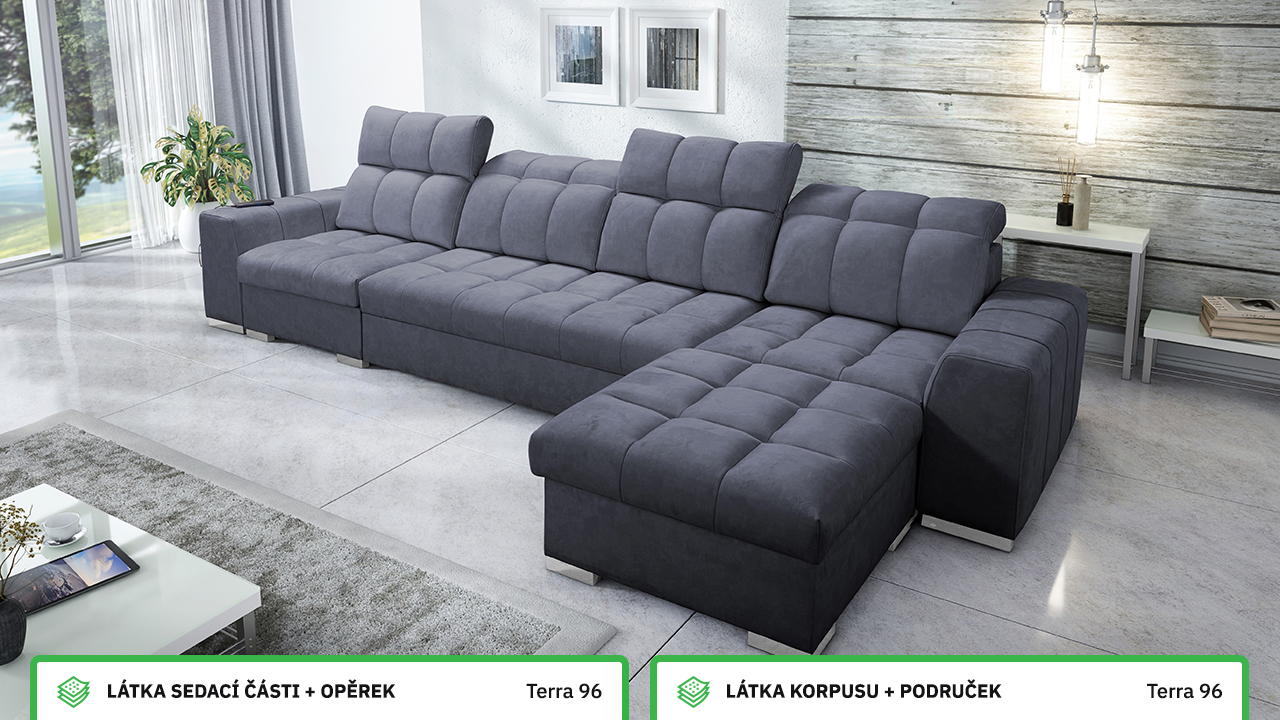 Univerzální rohová sedací souprava nadesignovaná pro maximální komfort a funkčnost. S její velkou pohodlnou plochou k sezení a polohovatelnými opěrkami hlavy si vytvoříte ideální místo pro sledování oblíbeného filmu, čtení knihy nebo vítání vašich návštěv. Návštěvu nejenže usadíte, ale i uložíte. Po rozložení sedačka poskytne komfortní místo ke spaní pro dva lidi. Sedačku nelze vyrobit v potazích Erie, Bristol a Bahama.
