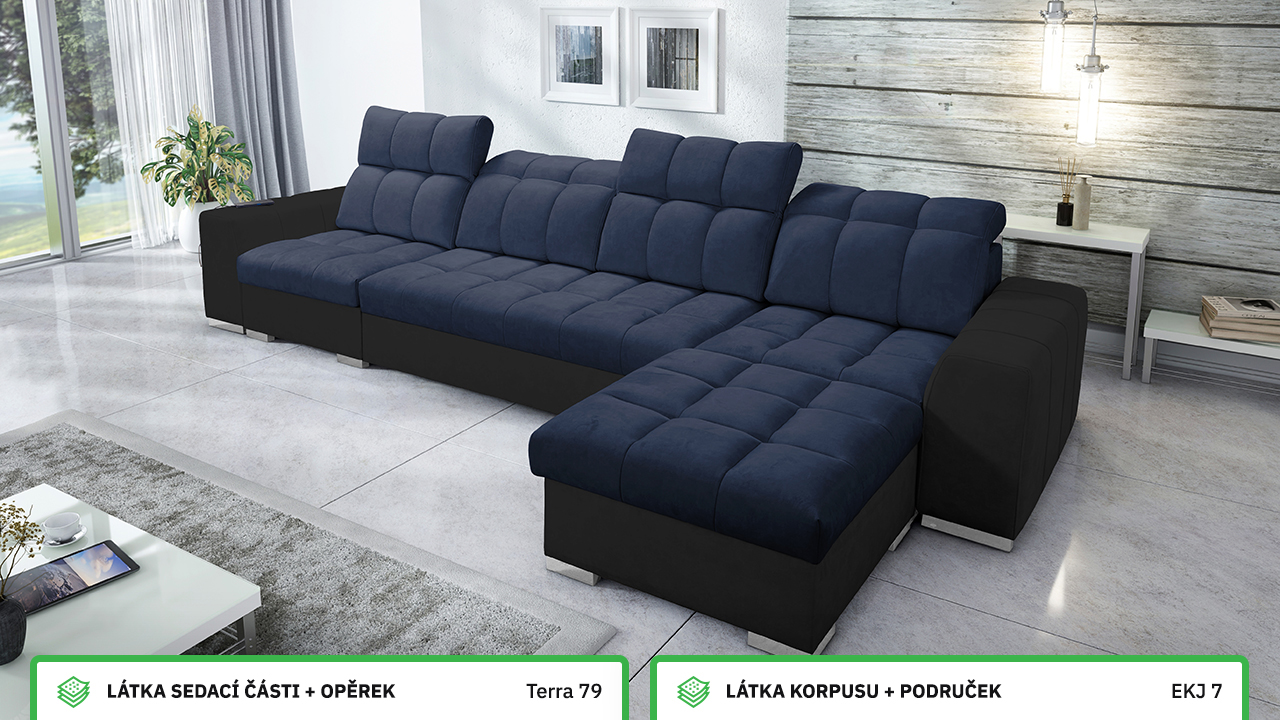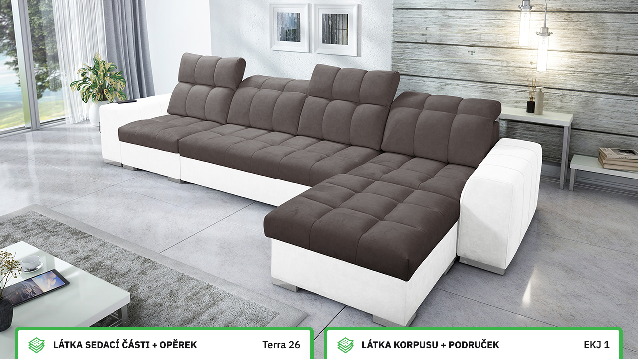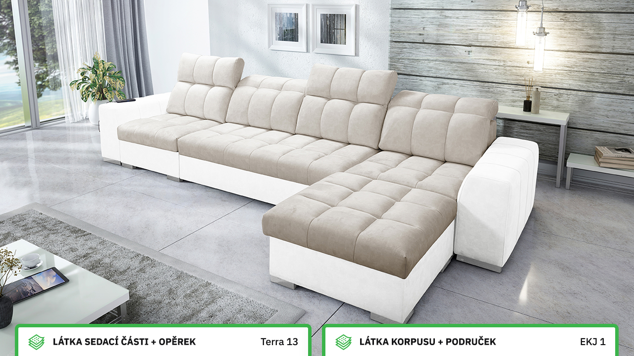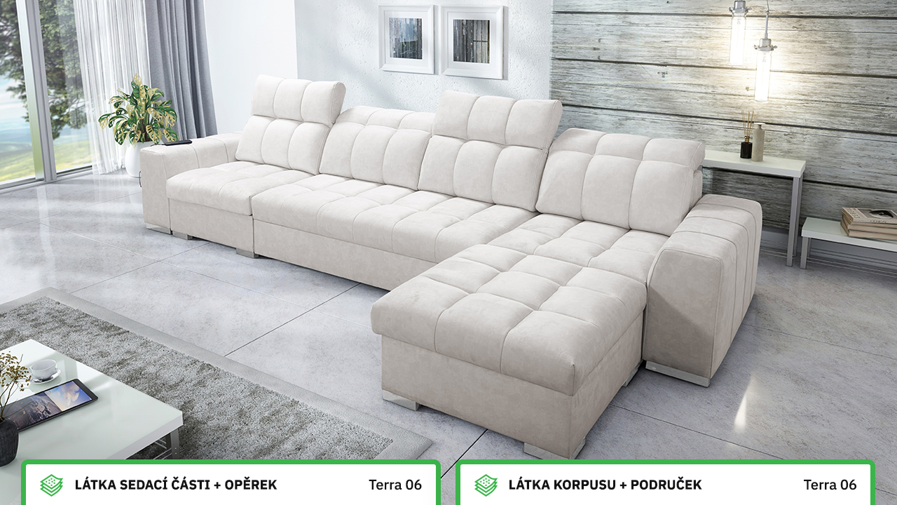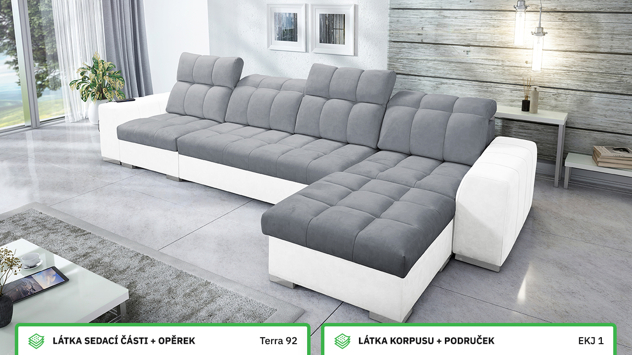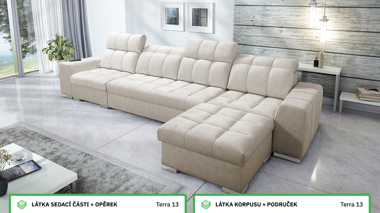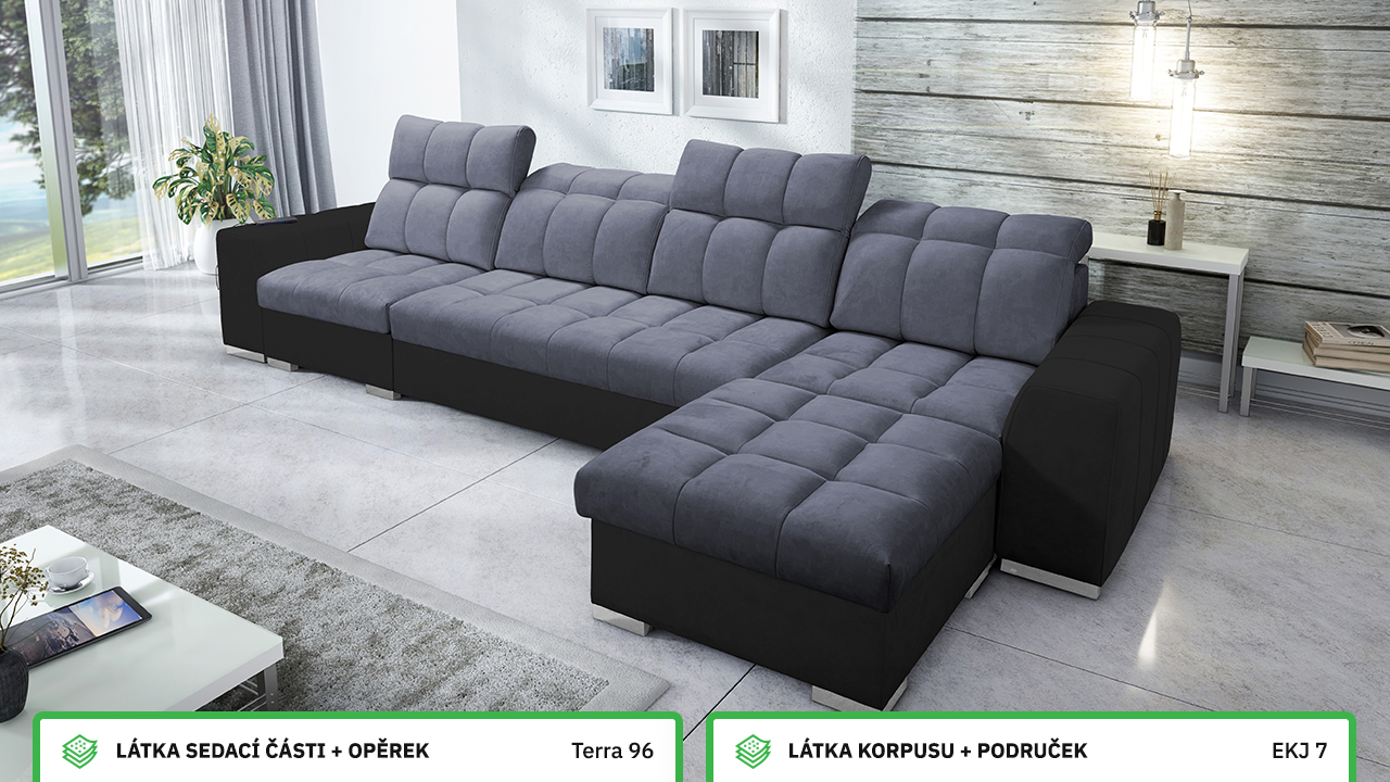 Univerzální rohová sedací souprava nadesignovaná pro maximální komfort a funkčnost. S její velkou pohodlnou plochou k sezení a polohovatelnými opěrkami hlavy si vytvoříte ideální místo pro sledování oblíbeného filmu, čtení knihy nebo vítání vašich návštěv. Návštěvu nejenže usadíte, ale i uložíte. Po rozložení sedačka poskytne komfortní místo ke spaní pro dva lidi. Sedačku nelze vyrobit v potazích Erie, Bristol a Bahama.