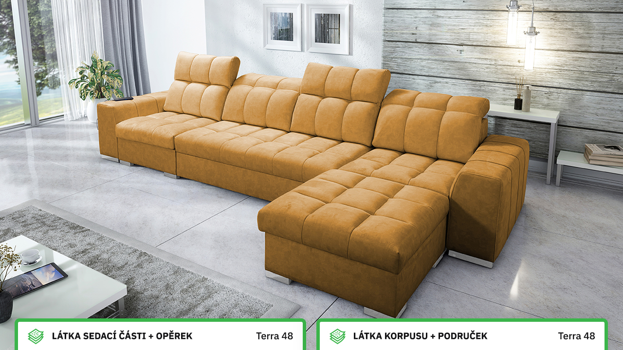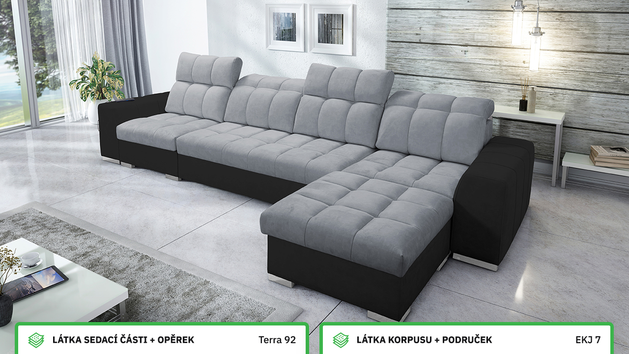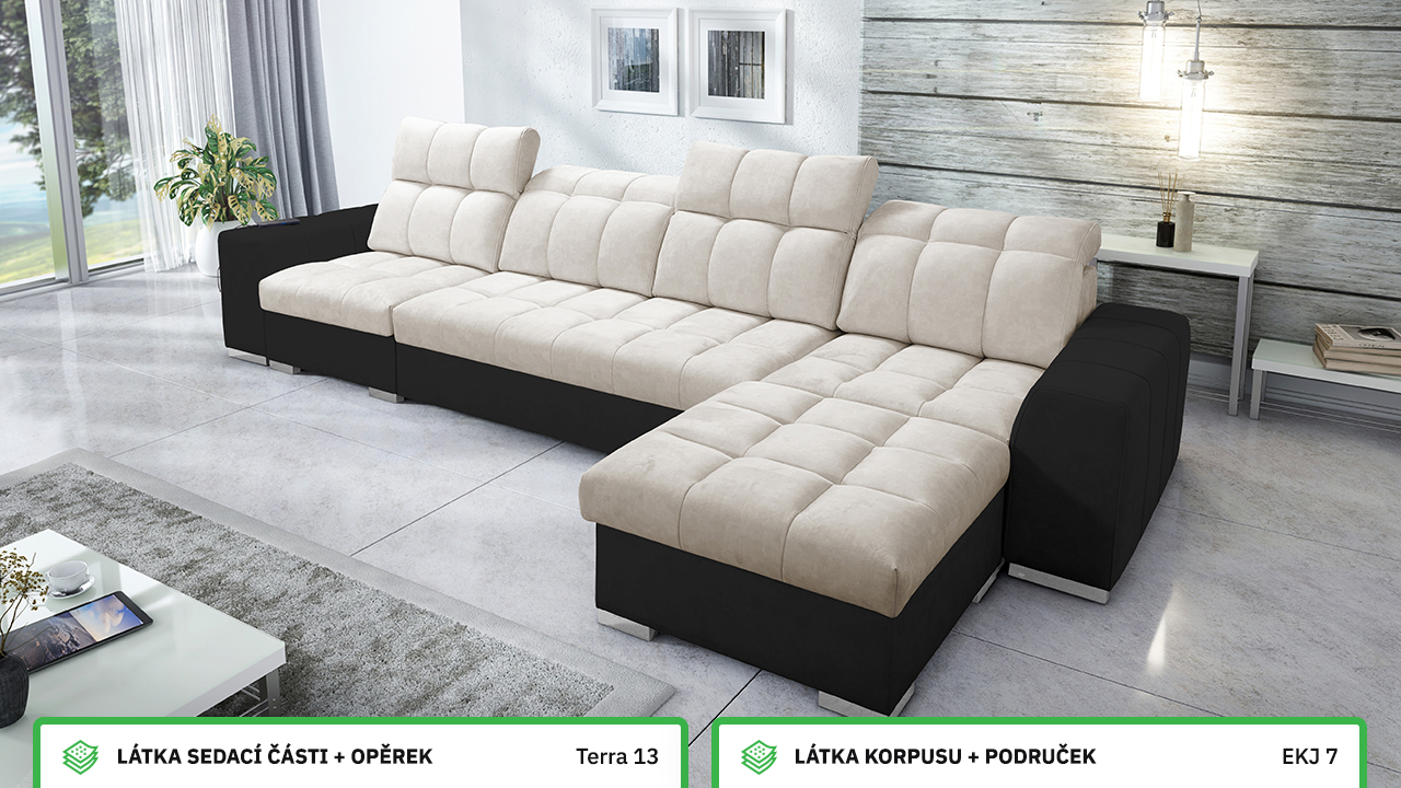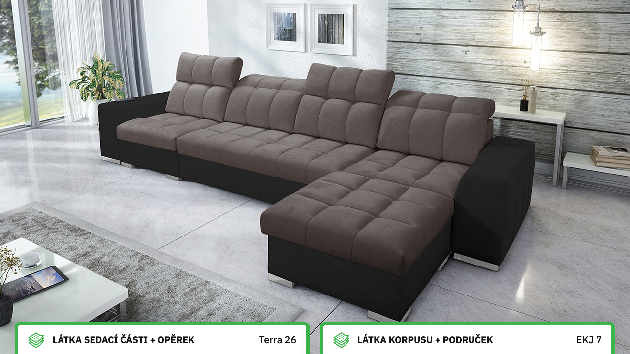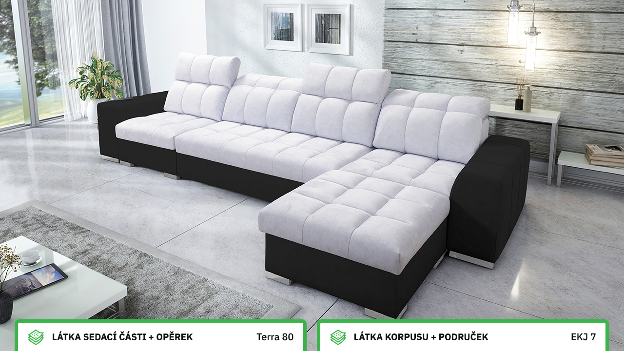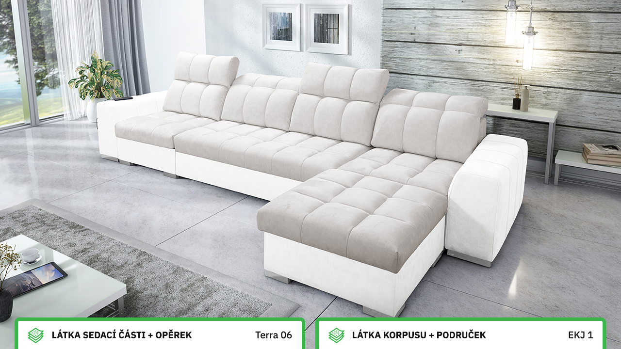 Univerzální rohová sedací souprava nadesignovaná pro maximální komfort a funkčnost. S její velkou pohodlnou plochou k sezení a polohovatelnými opěrkami hlavy si vytvoříte ideální místo pro sledování oblíbeného filmu, čtení knihy nebo vítání vašich návštěv. Návštěvu nejenže usadíte, ale i uložíte. Po rozložení sedačka poskytne komfortní místo ke spaní pro dva lidi. Sedačku nelze vyrobit v potazích Erie, Bristol a Bahama.