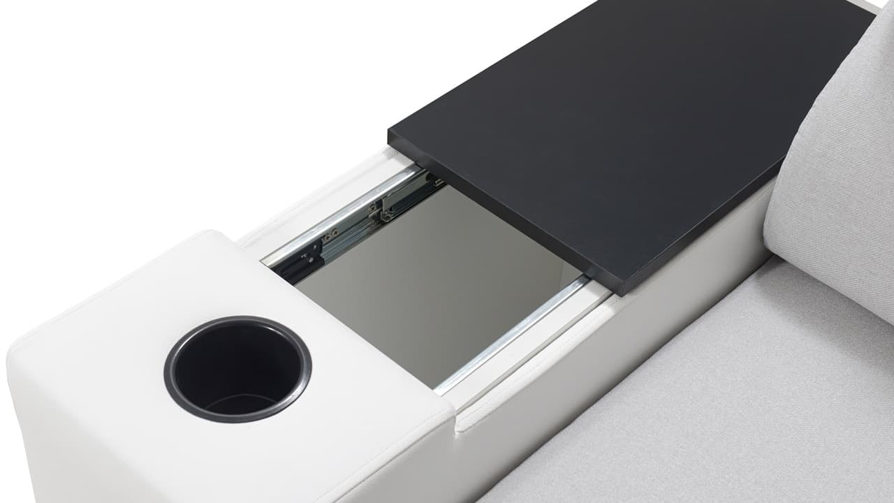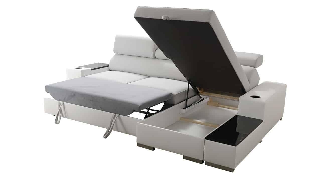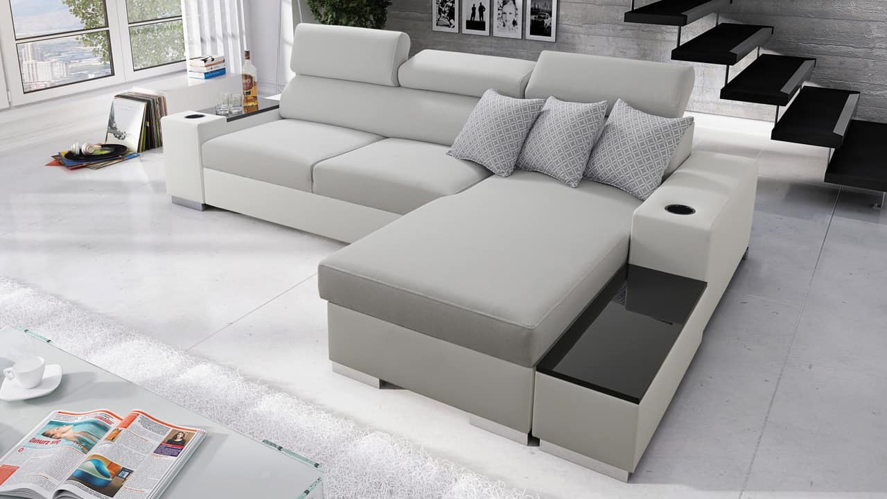 Moderní rohová sedačka typu chaise end splní i vaše nejnáročnější požadavky. Kromě úložného prostoru a možnosti rozkládání má totiž tato sedačka i nastavitelné opěrky hlavy, mini stolek a minibar vestavěný přímo v boční opěrce.