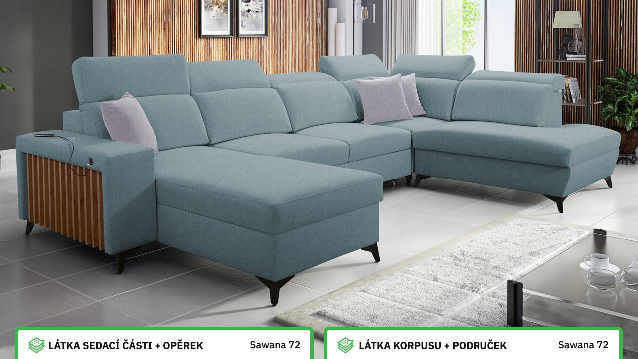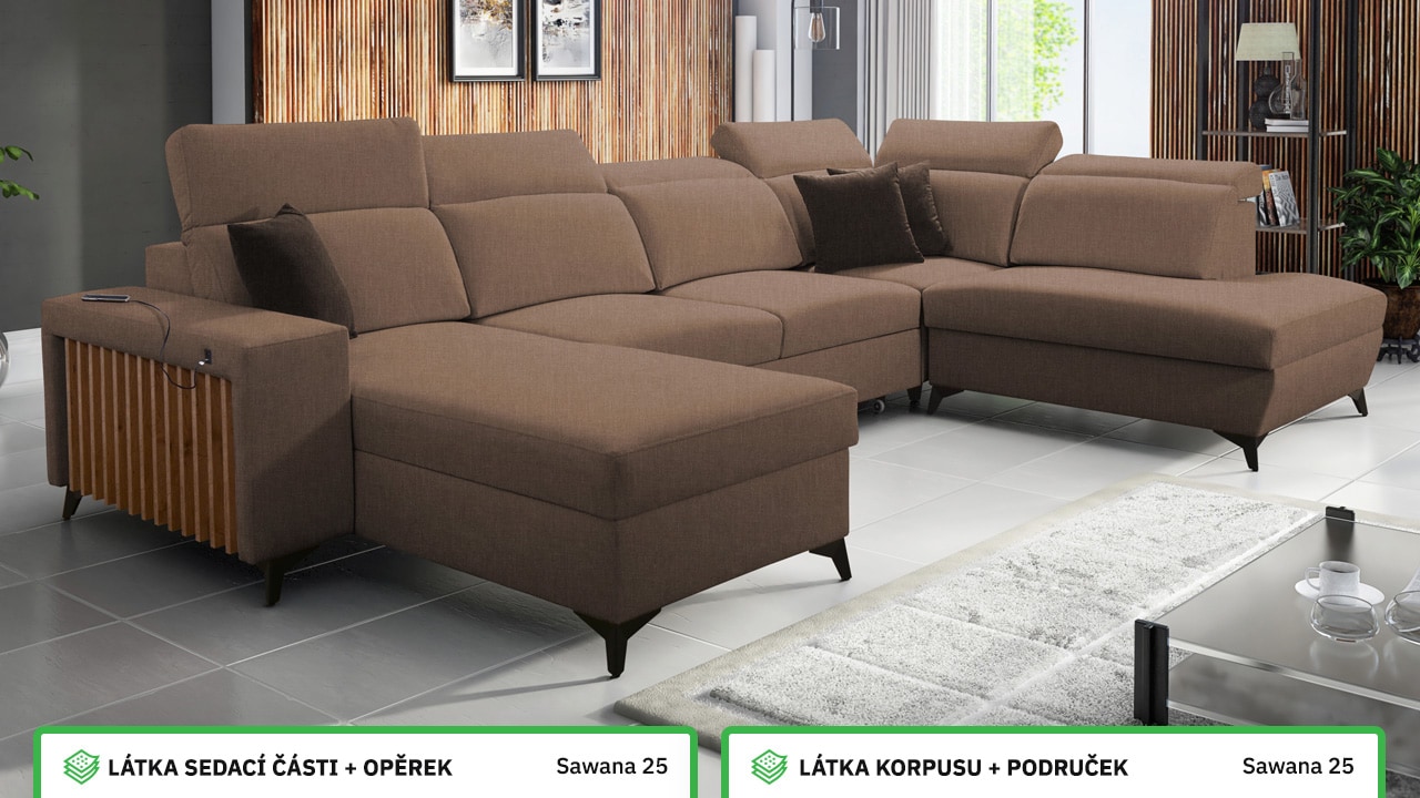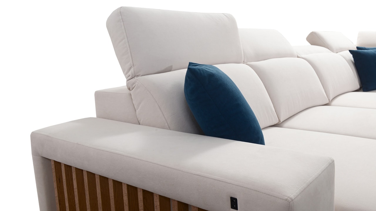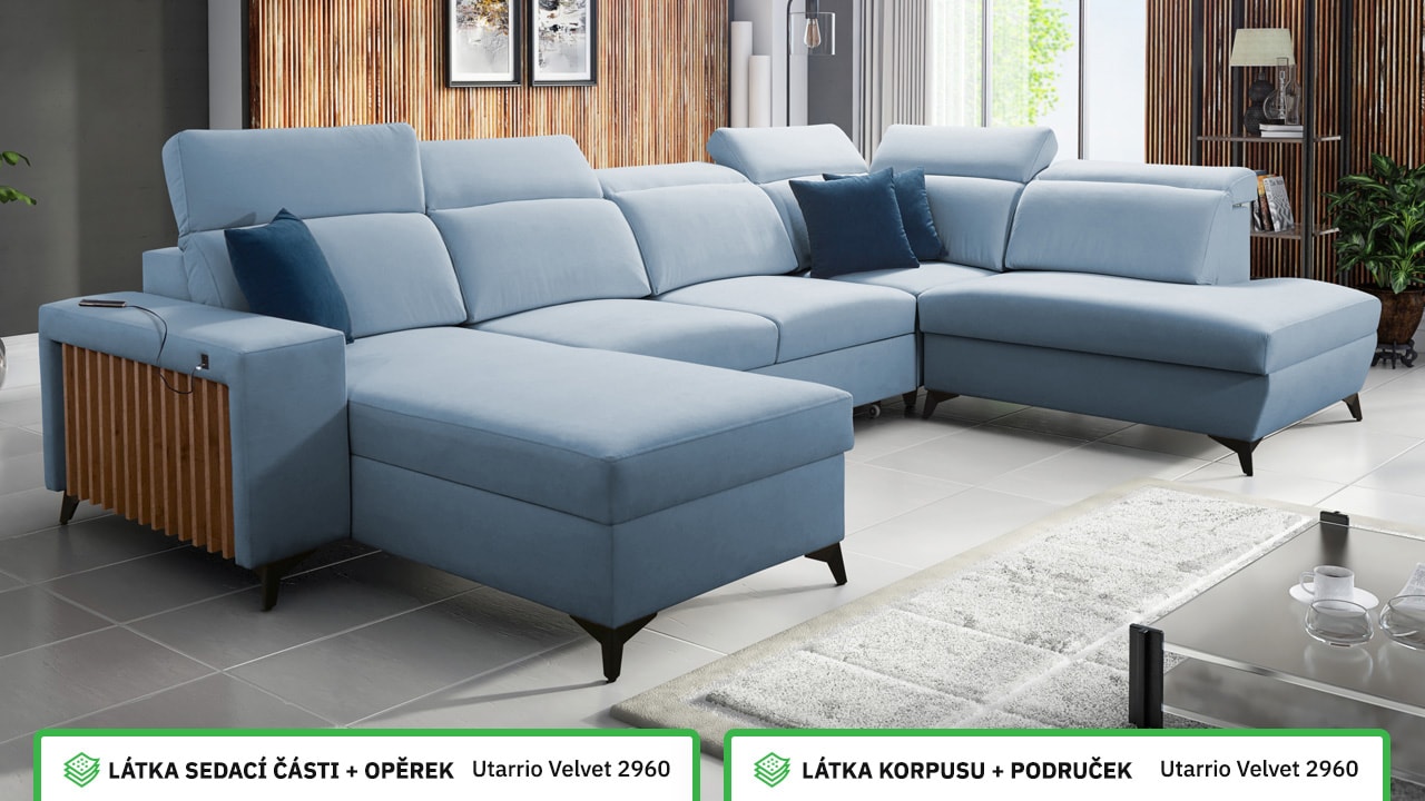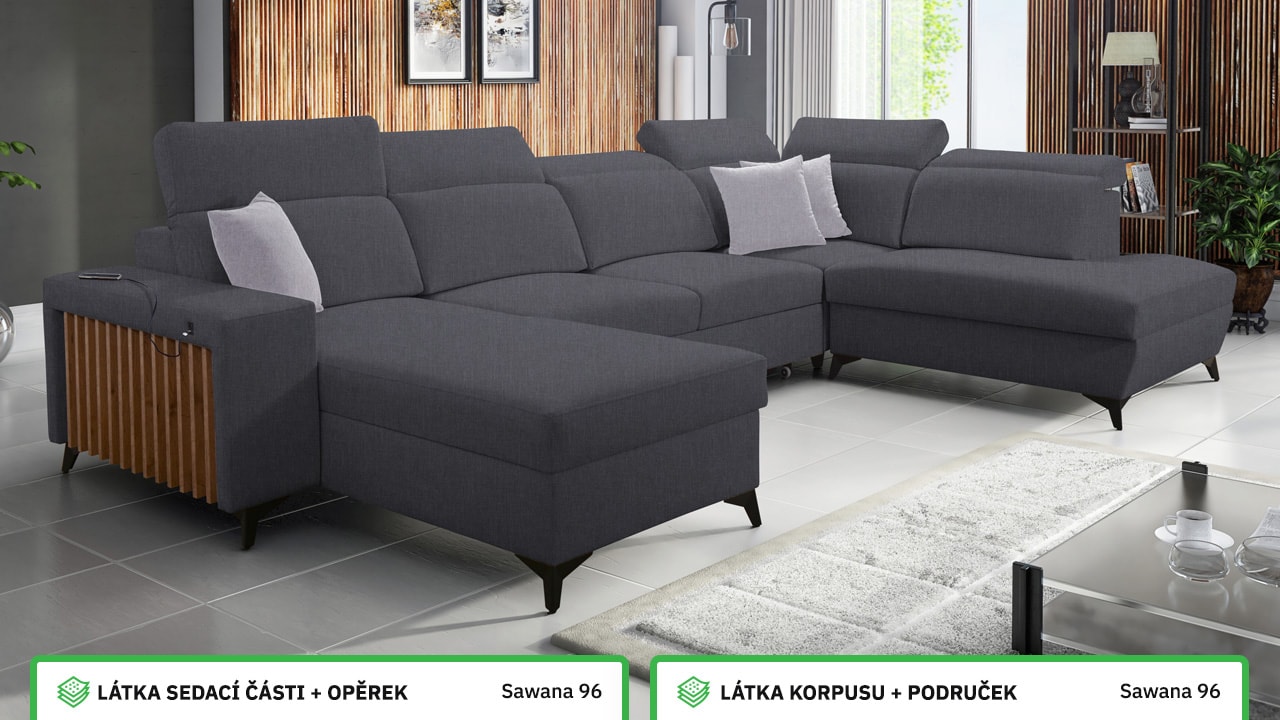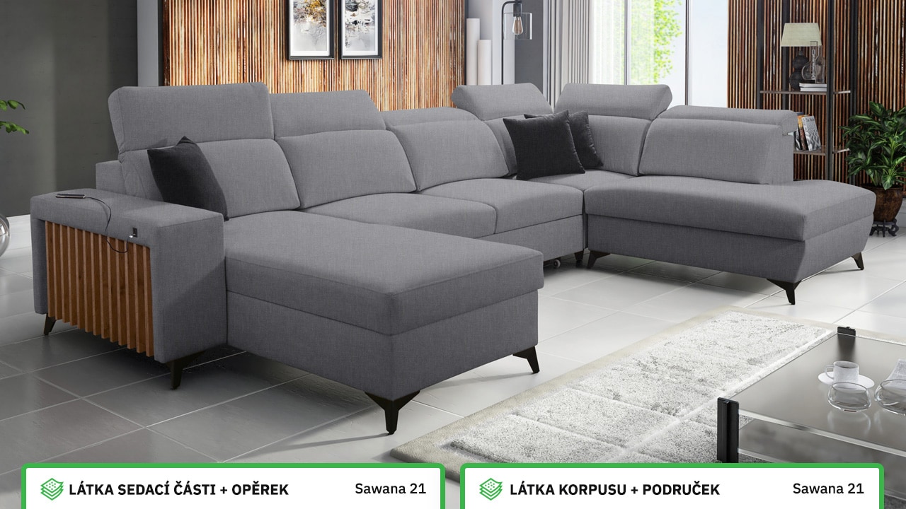 Nevíte najít tu správnou sedací soupravu? Toužíte po výrazné zářivé barvě, nebo naopak po jemných zemitých odstínech? Tuto sedačku si můžete nechat vyrobit na míru v jakémkoli potahu z našeho vzorníku. Dolaďte si k ní ještě zajímavý designový dřevěný prvek a pak už si jen sedněte a zrelaxujte. Pomůže vám v tom pohodlné sezení, polohovatelné opěrky hlavy i vestavěné USB porty pro nabití mobilu nebo tabletu.