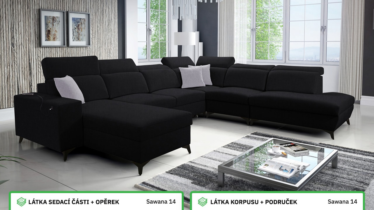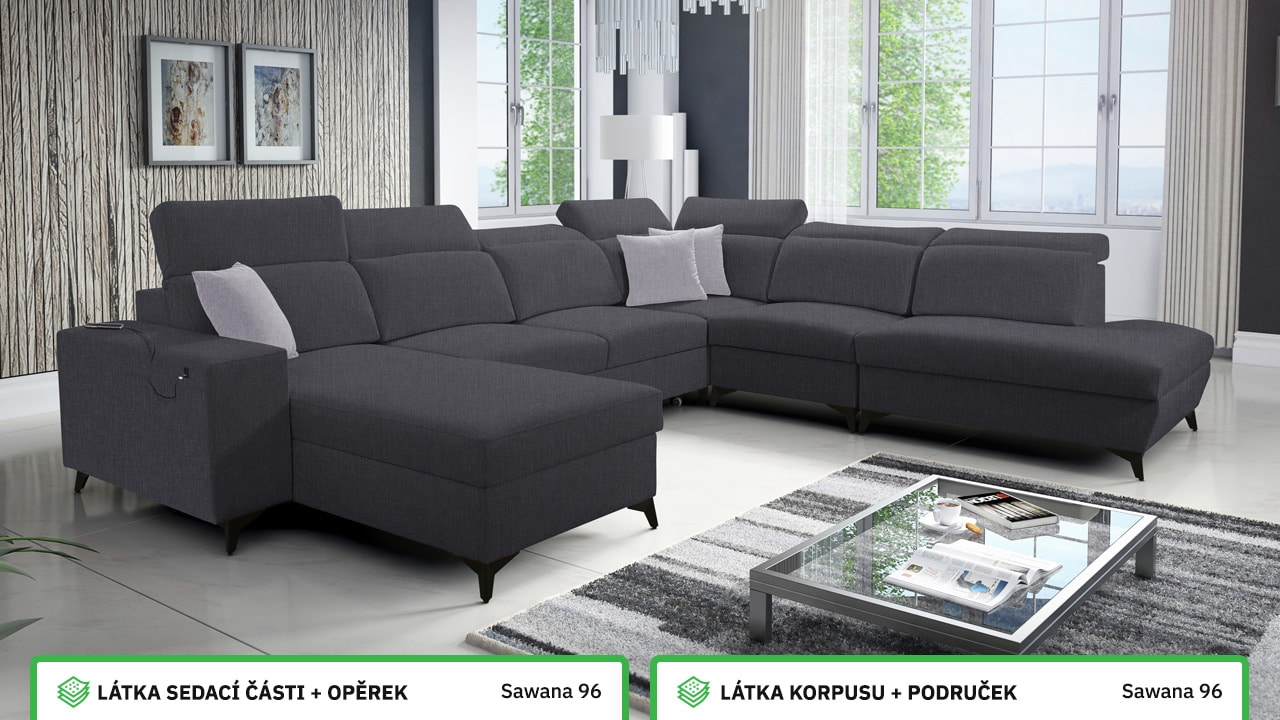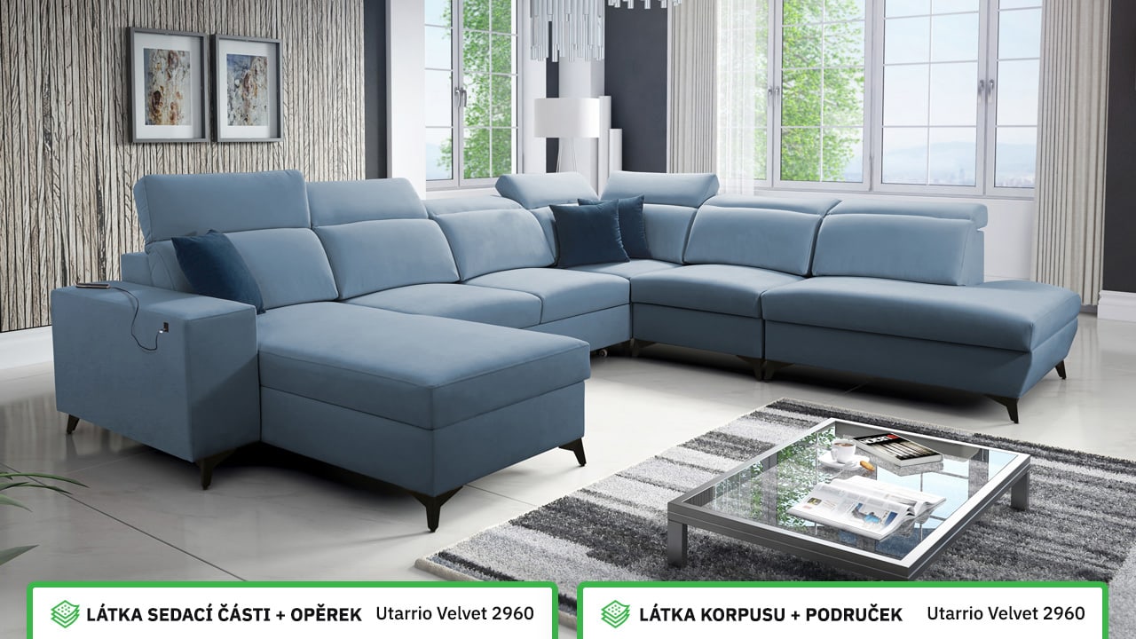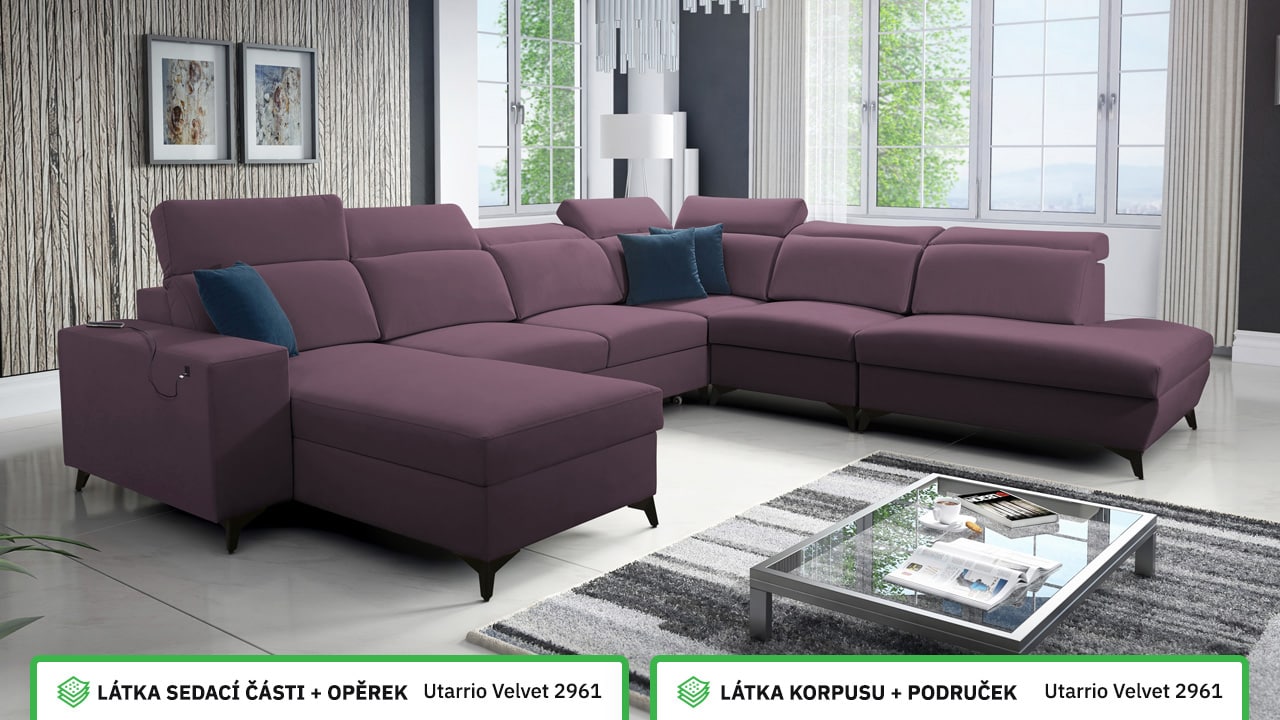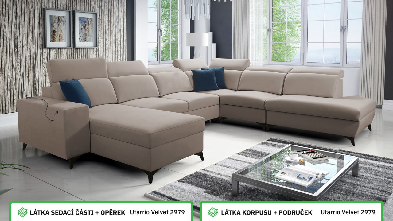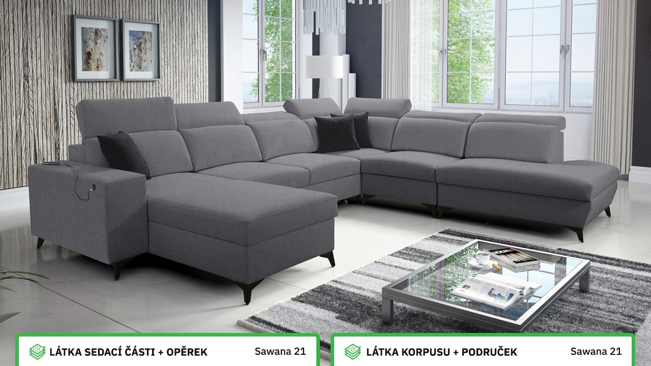 Jedna z největších U sedaček, jaké v naší nabídce máme. Pokud máte prostorný obývací pokoj, nad výběrem této sedačky byste neměli váhat. Usadíte na ni i větší návštěvu, a zároveň si na ní odpočine každý člen domácnosti. Poskytne vám spoustu úložného prostoru, rozkládací lůžko, polohovatelné opěrky hlavy a USB port pro nabití mobilu nebo tabletu. Zmínit už musíme jen fakt, že výběr potahové látky necháváme na vás. Můžete si tedy vybrat takovou barvu a typ, po jakém jste už dávno toužili.