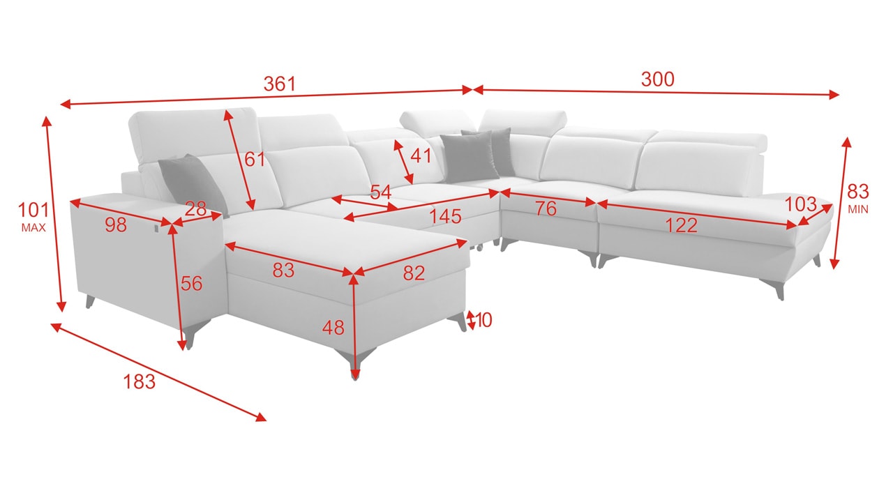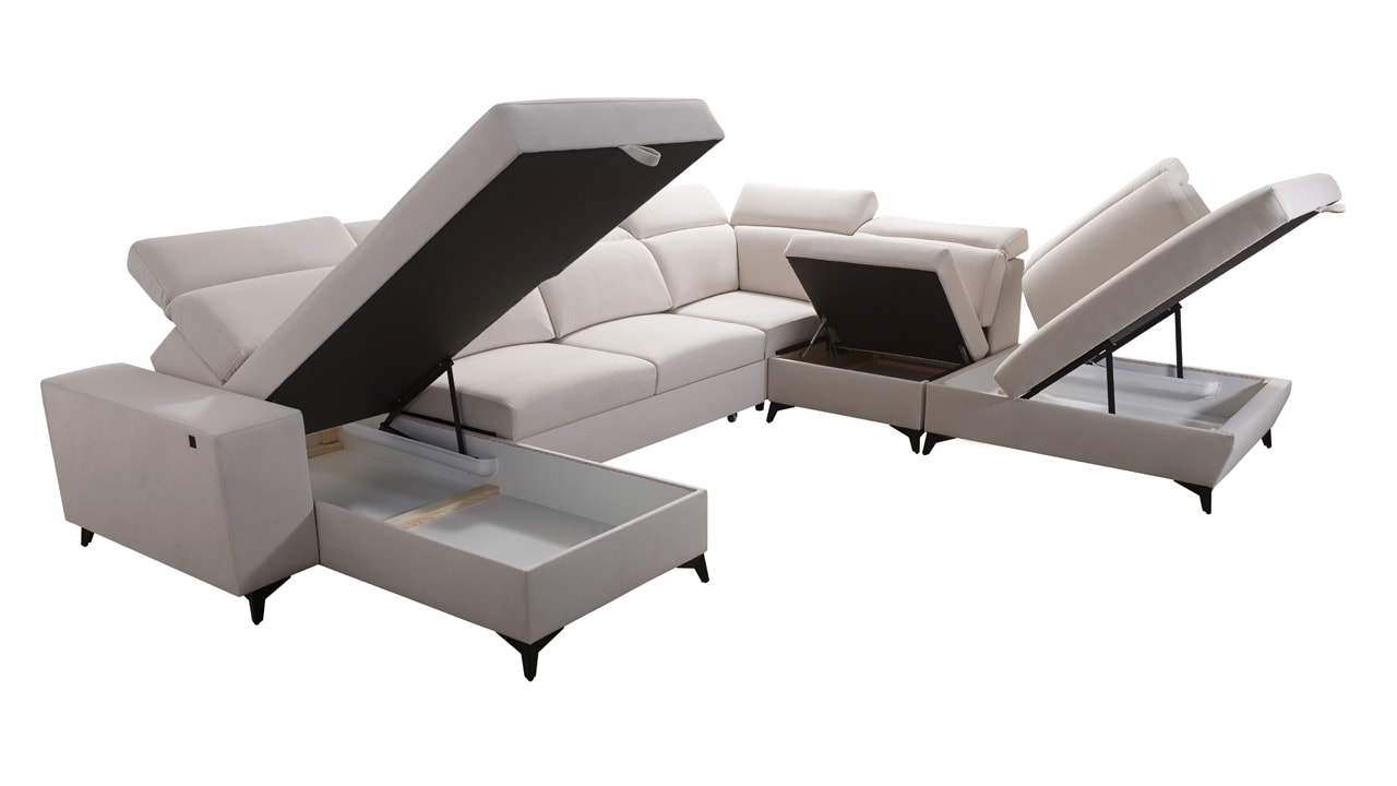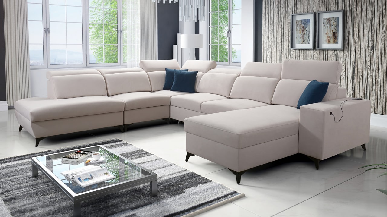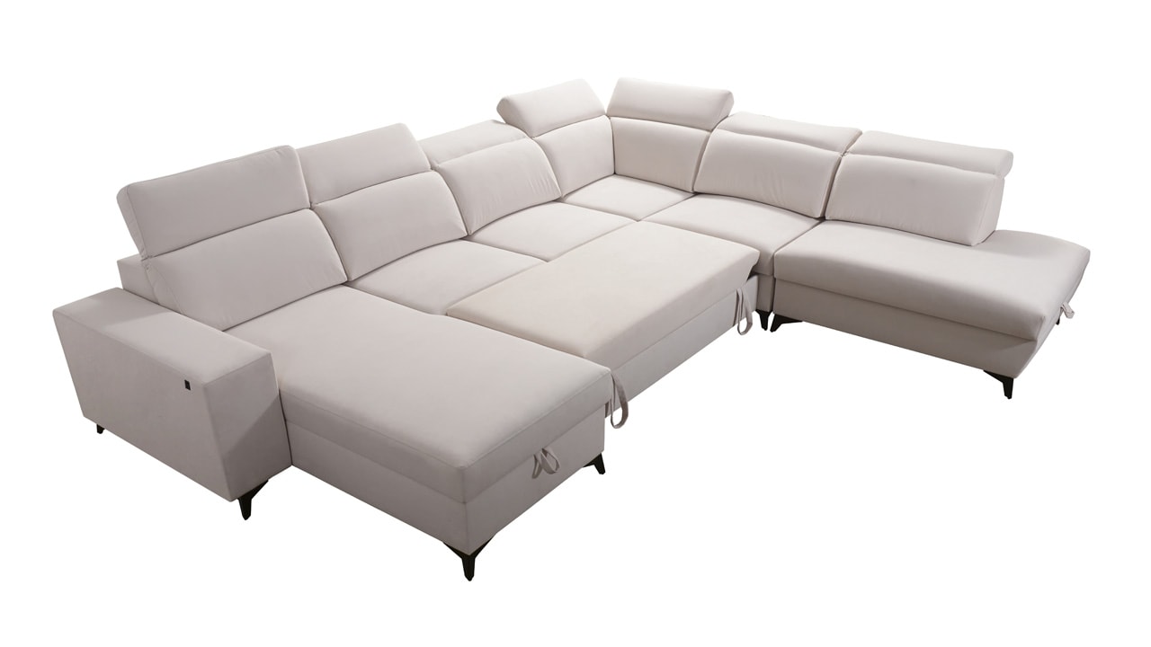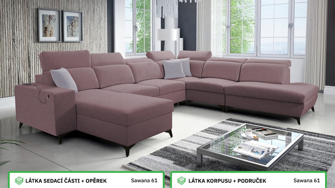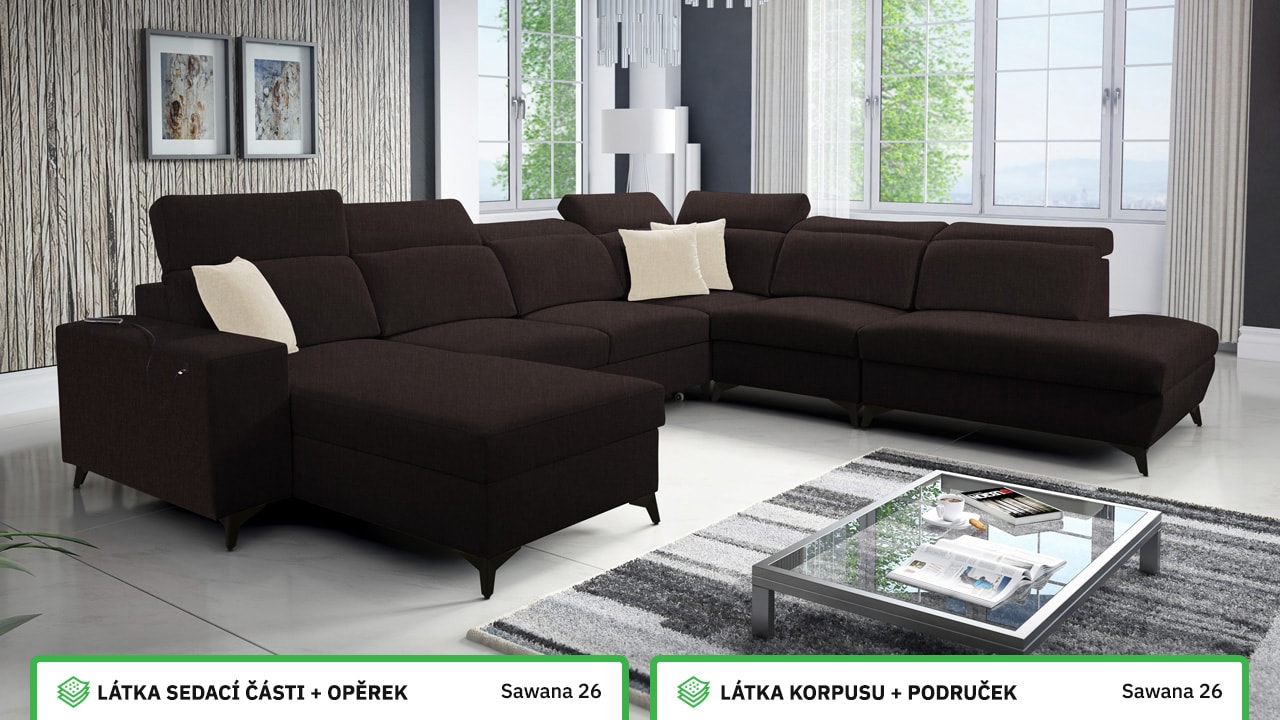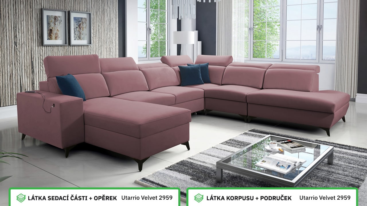 Jedna z největších U sedaček, jaké v naší nabídce máme. Pokud máte prostorný obývací pokoj, nad výběrem této sedačky byste neměli váhat. Usadíte na ni i větší návštěvu, a zároveň si na ní odpočine každý člen domácnosti. Poskytne vám spoustu úložného prostoru, rozkládací lůžko, polohovatelné opěrky hlavy a USB port pro nabití mobilu nebo tabletu. Zmínit už musíme jen fakt, že výběr potahové látky necháváme na vás. Můžete si tedy vybrat takovou barvu a typ, po jakém jste už dávno toužili.
