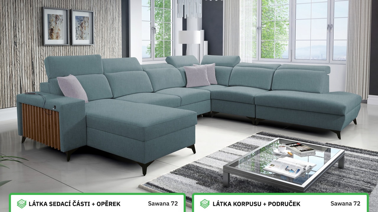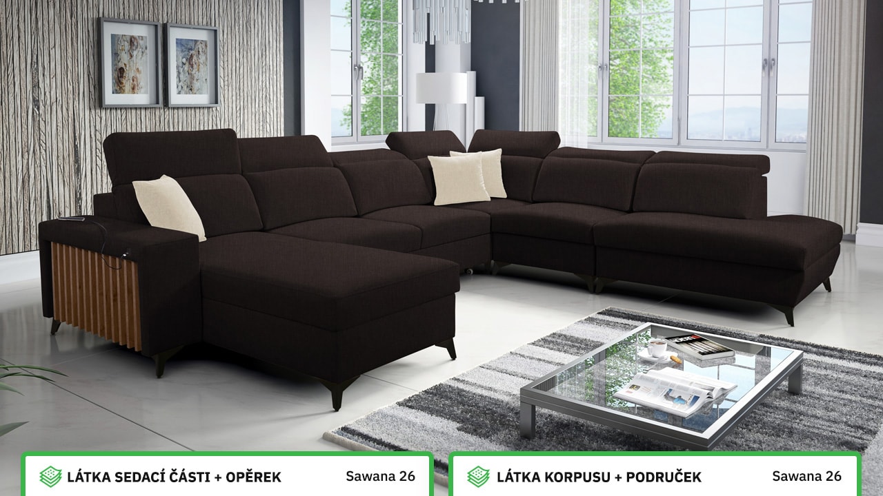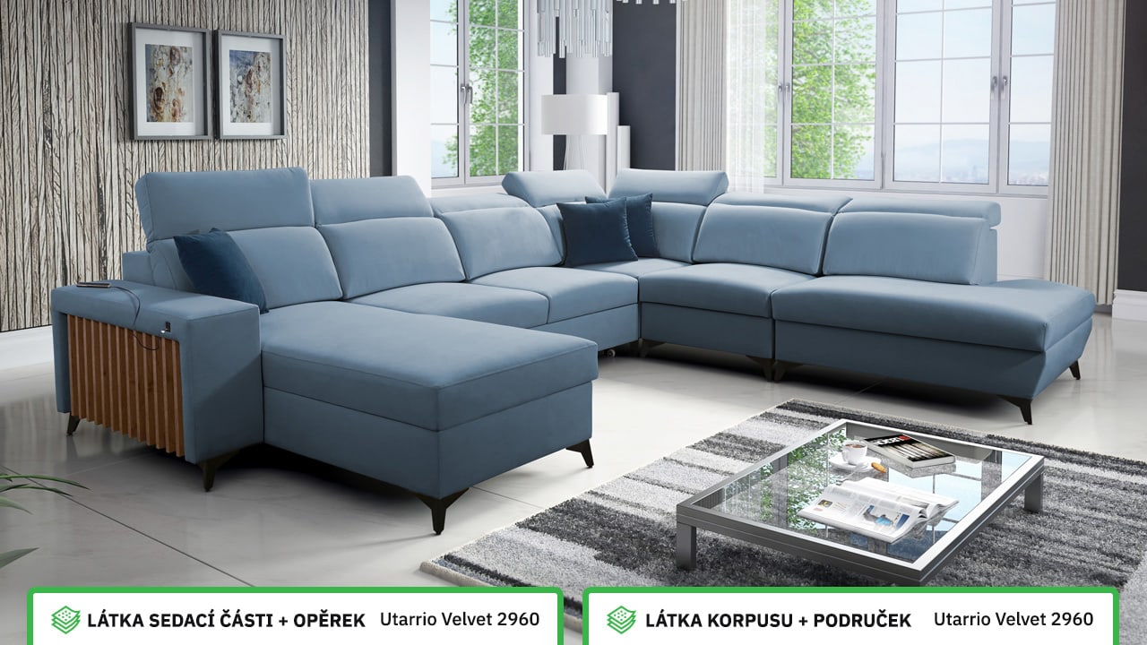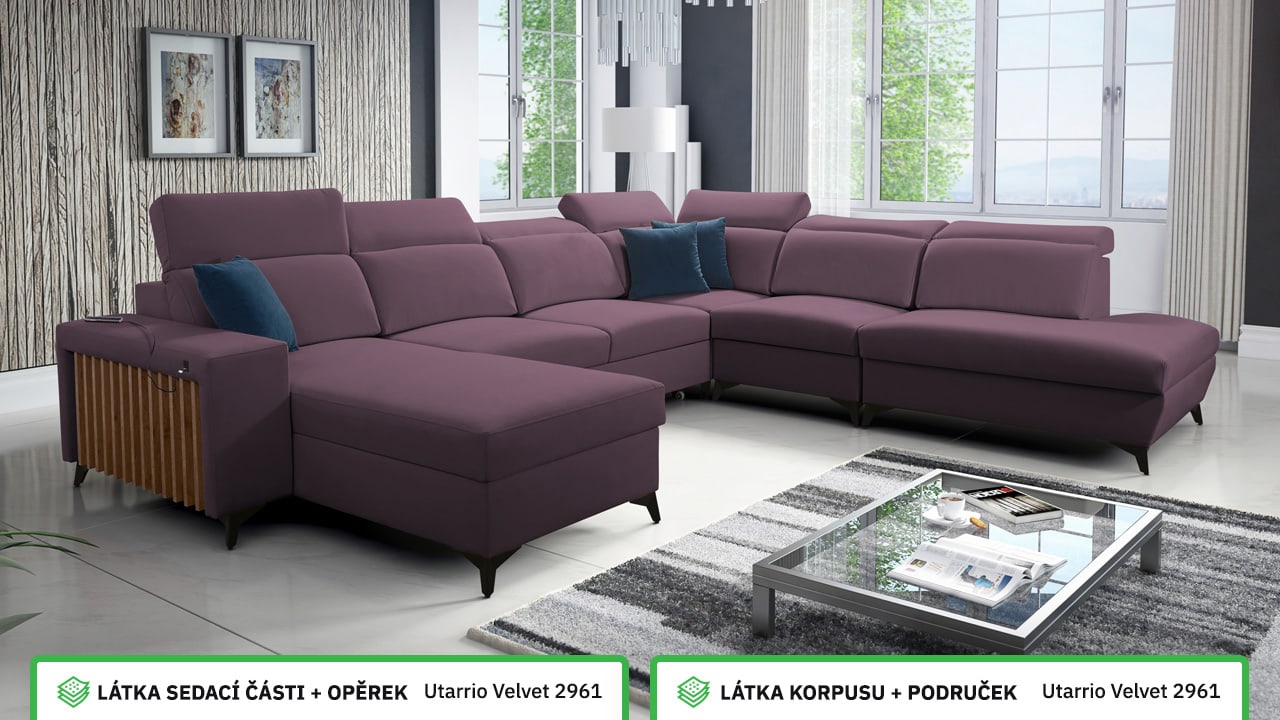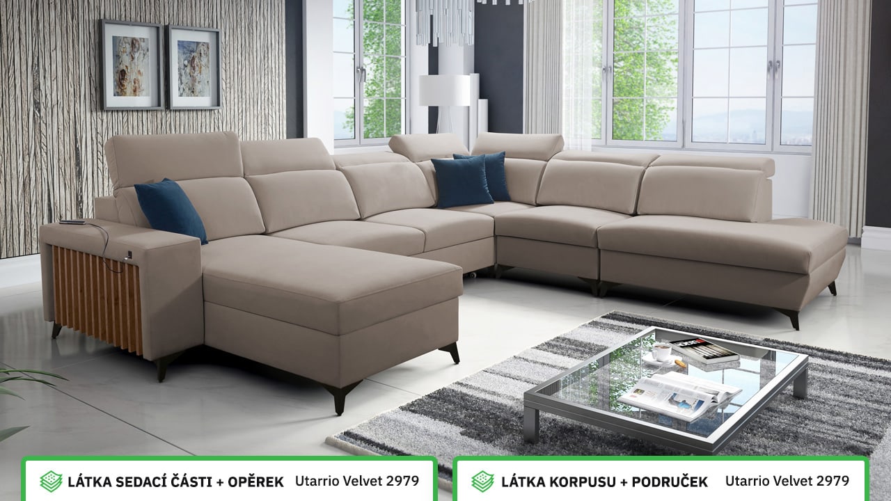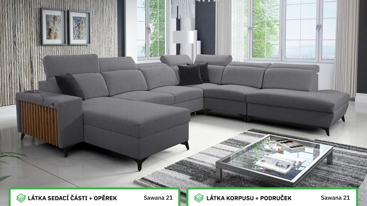 Jedna z největších U sedacích souprav v naší nabídce. Pohodlně usadí minimálně 6 lidí, no a při večerním relaxu si na ní komfortně odpočine 4-členná rodina. Je vybavena polohovatelnými opěrkami hlavy a USB porty pro nabíjení. Objednat si ji můžete v různých barevných provedeních. Inspirujte se našimi vizualizacemi nebo si vyberte sami podle vašeho vkusu ze vzorníku materiálů. Přizpůsobit lze také dřevěný detail.