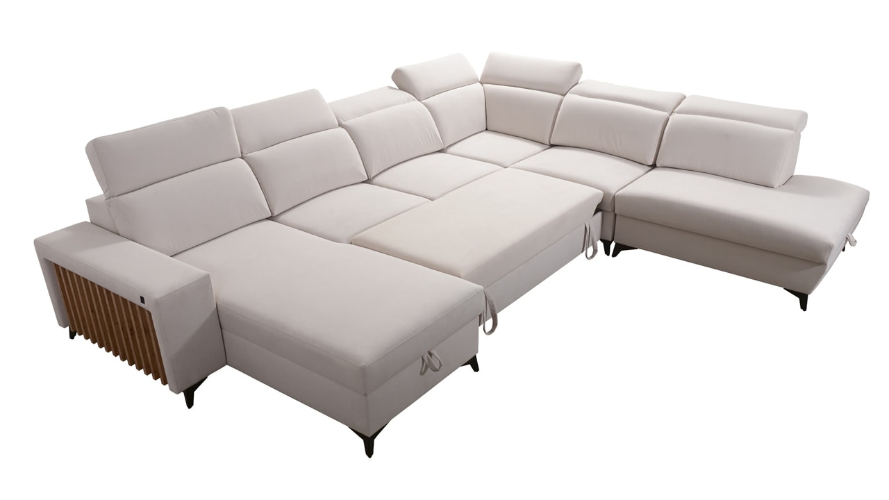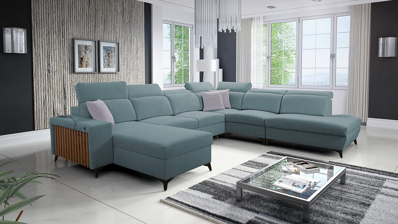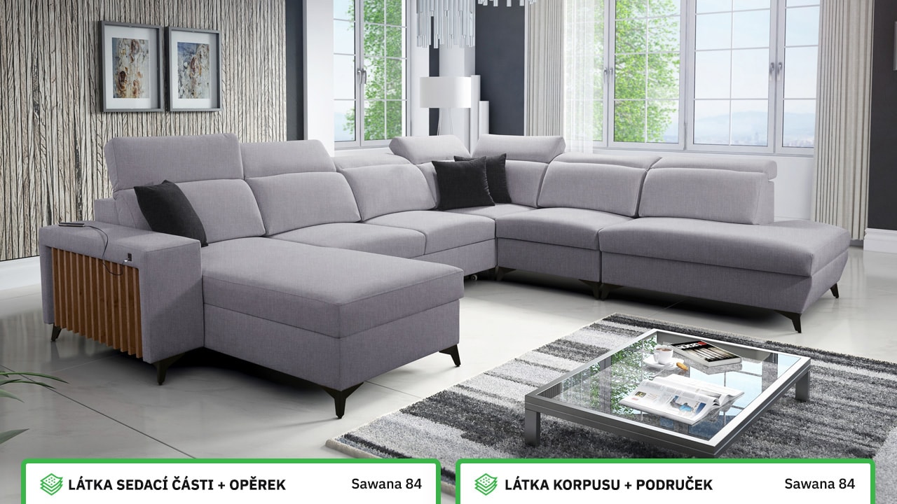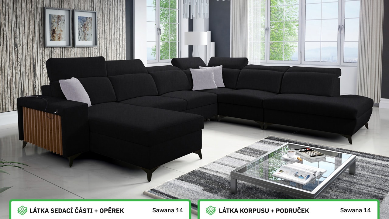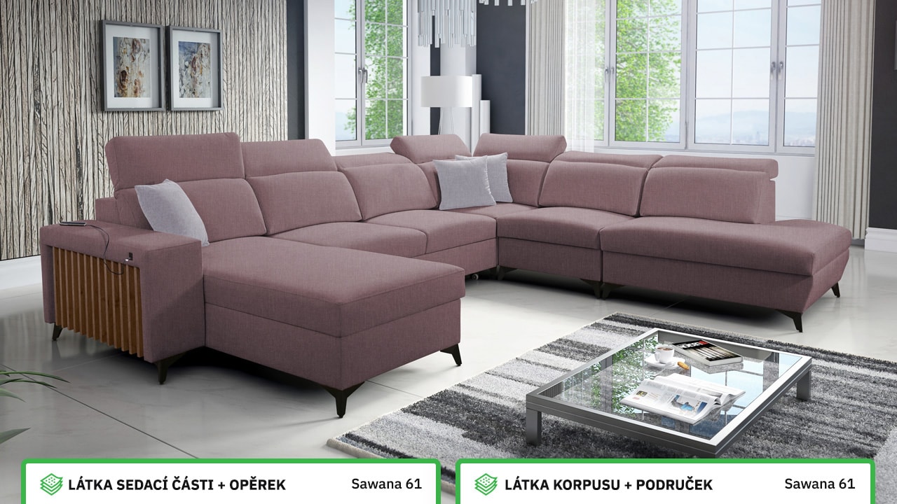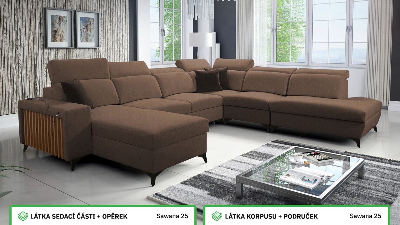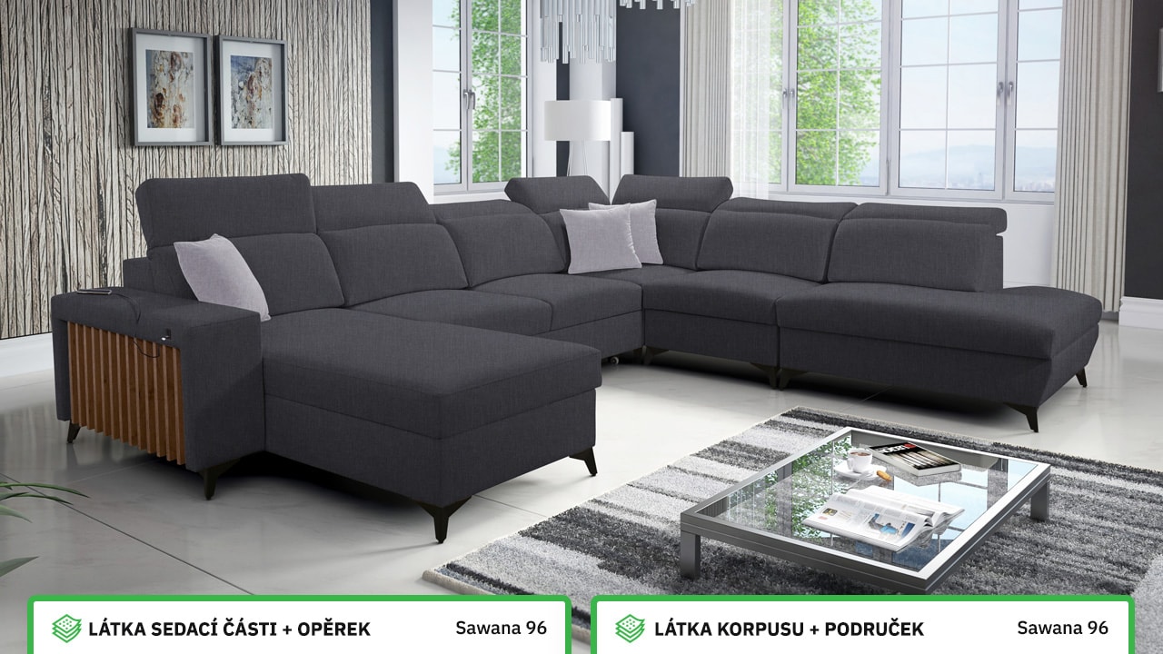 Jedna z největších U sedacích souprav v naší nabídce. Pohodlně usadí minimálně 6 lidí, no a při večerním relaxu si na ní komfortně odpočine 4-členná rodina. Je vybavena polohovatelnými opěrkami hlavy a USB porty pro nabíjení. Objednat si ji můžete v různých barevných provedeních. Inspirujte se našimi vizualizacemi nebo si vyberte sami podle vašeho vkusu ze vzorníku materiálů. Přizpůsobit lze také dřevěný detail.