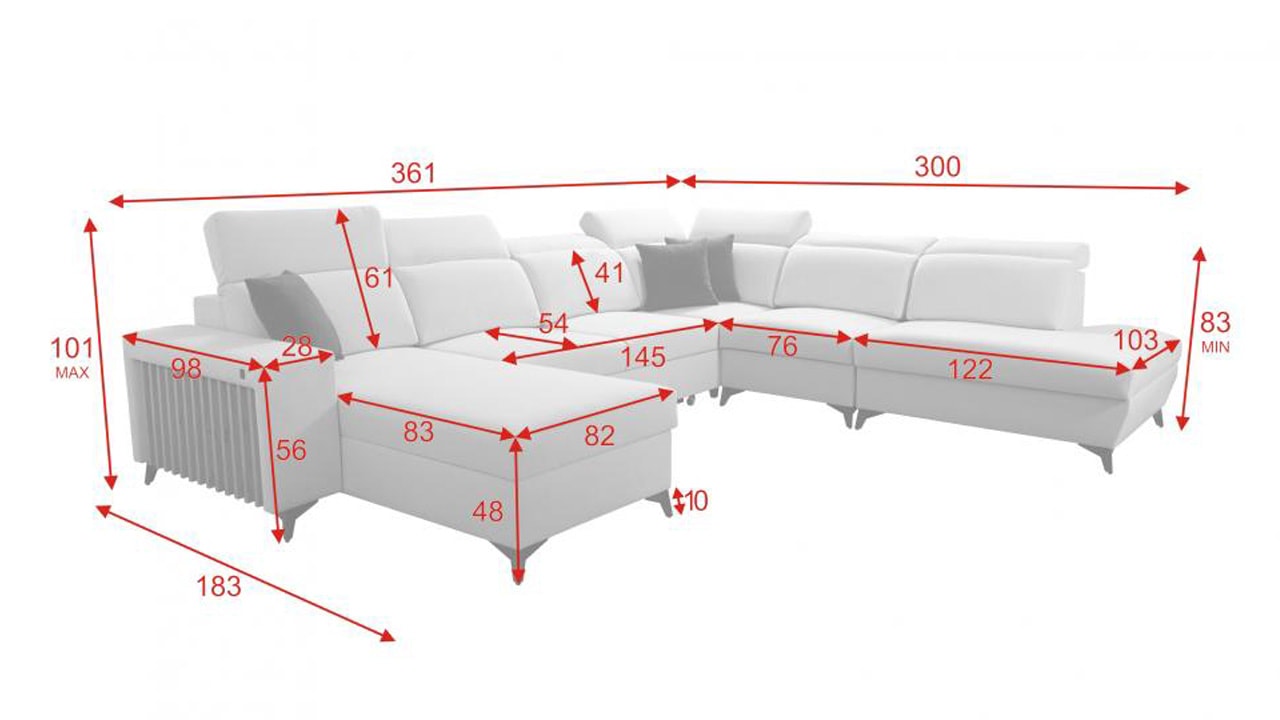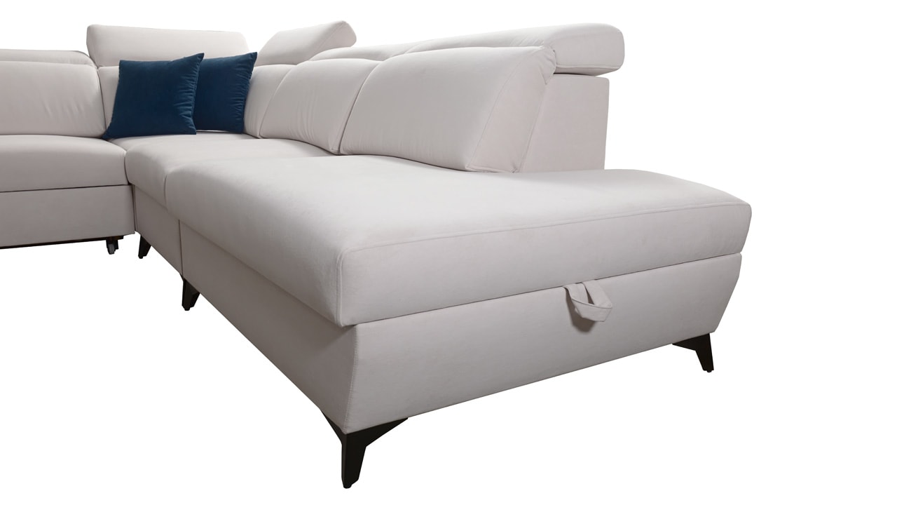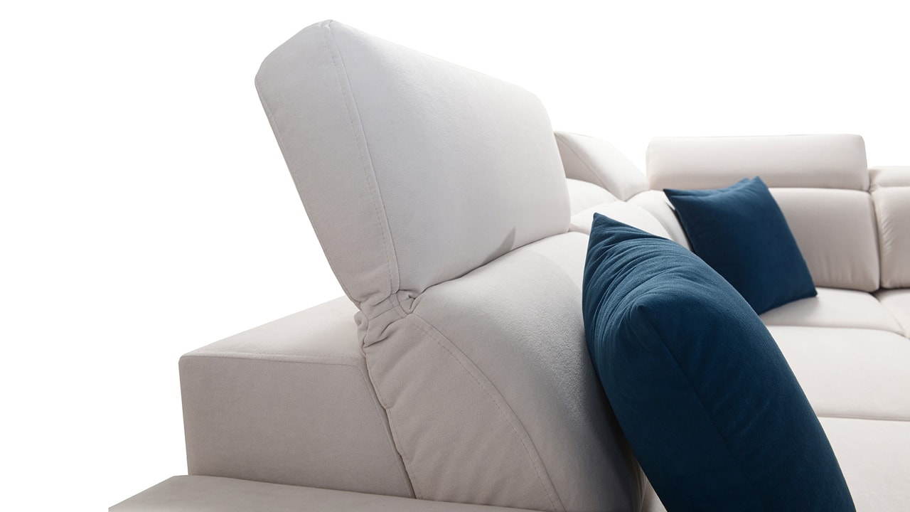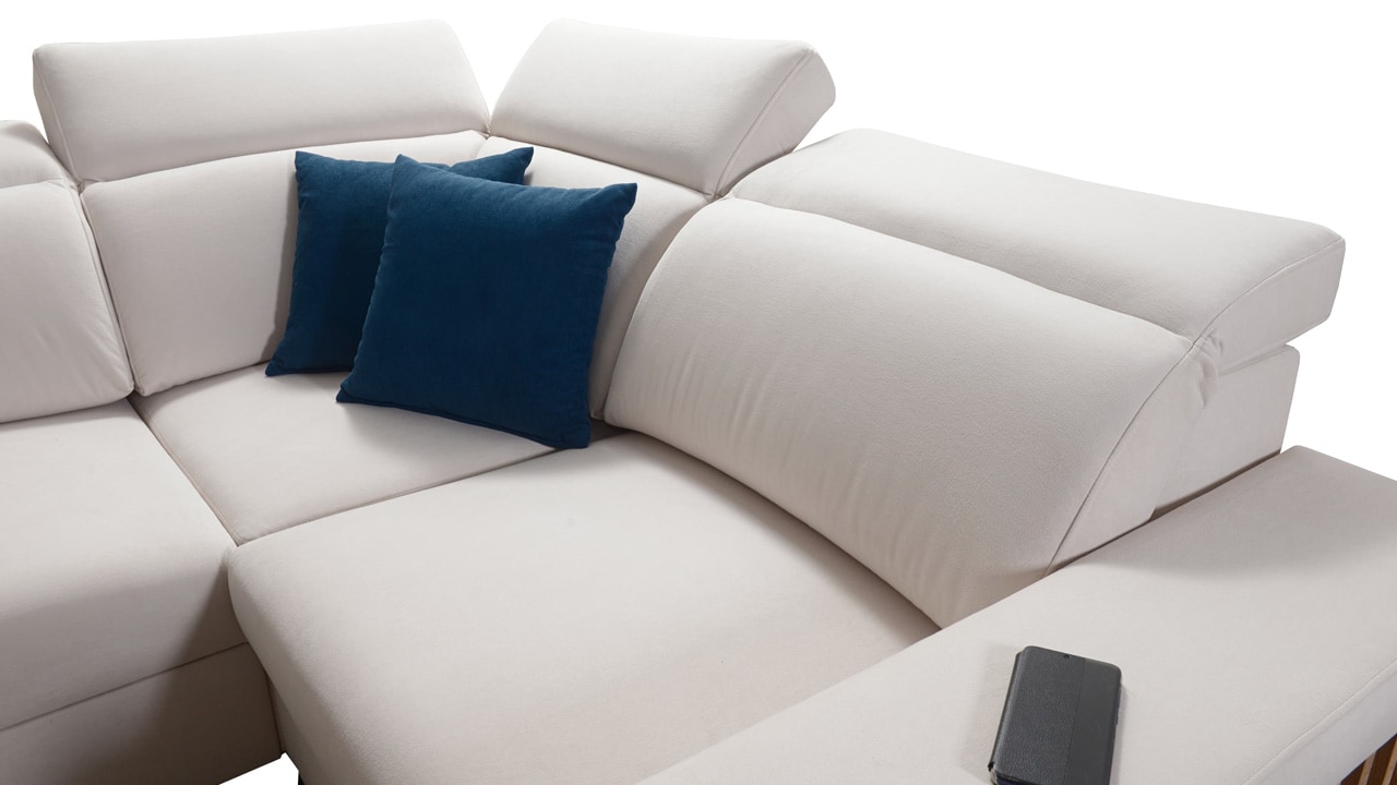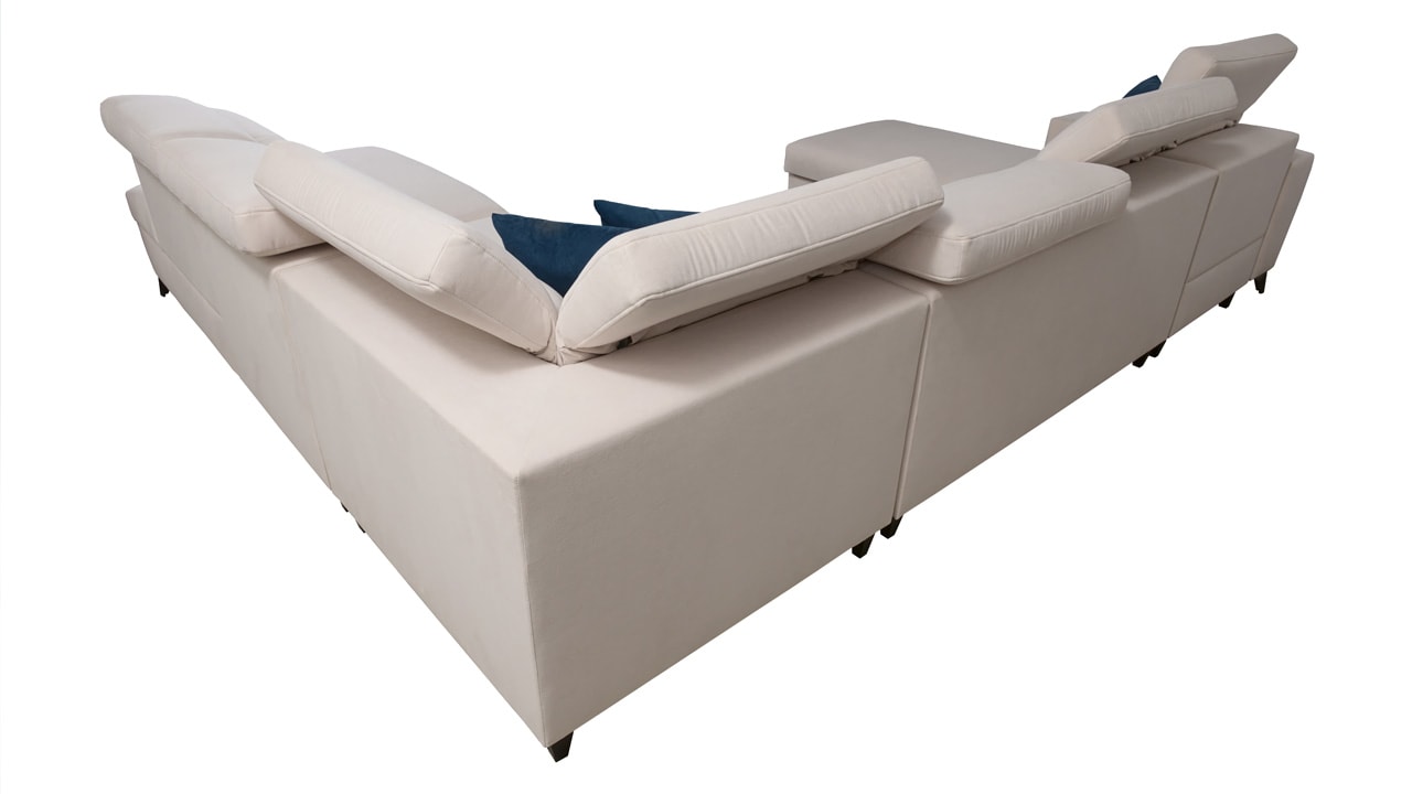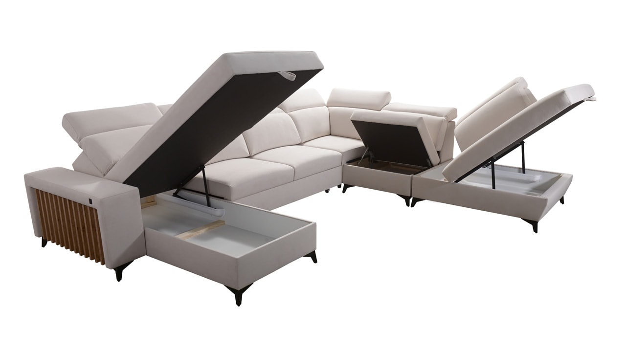 Jedna z největších U sedacích souprav v naší nabídce. Pohodlně usadí minimálně 6 lidí, no a při večerním relaxu si na ní komfortně odpočine 4-členná rodina. Je vybavena polohovatelnými opěrkami hlavy a USB porty pro nabíjení. Objednat si ji můžete v různých barevných provedeních. Inspirujte se našimi vizualizacemi nebo si vyberte sami podle vašeho vkusu ze vzorníku materiálů. Přizpůsobit lze také dřevěný detail.
