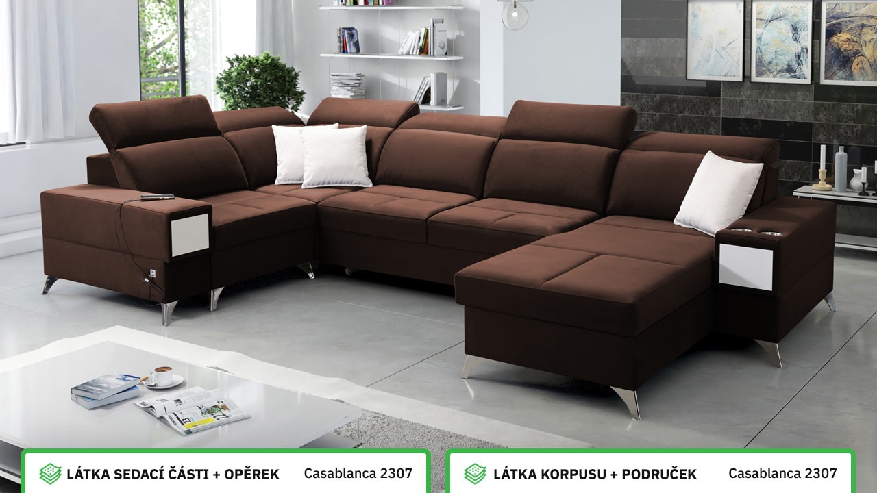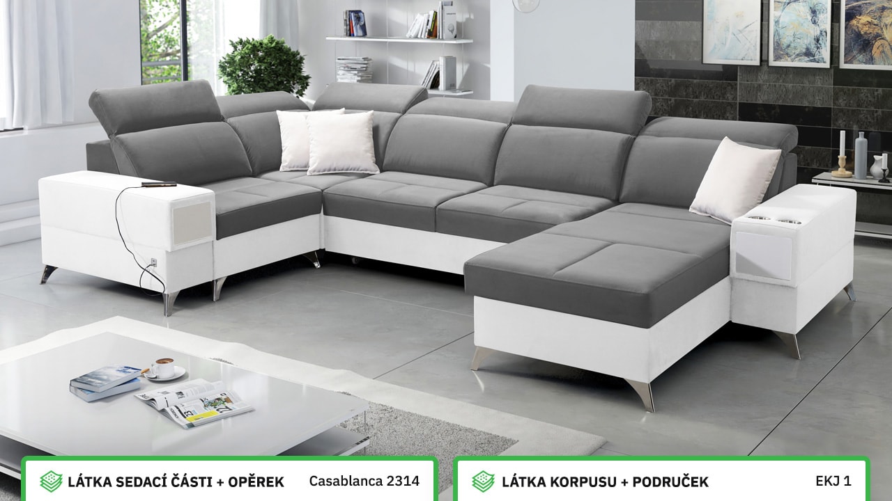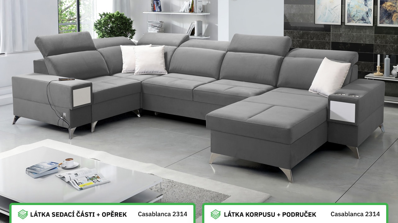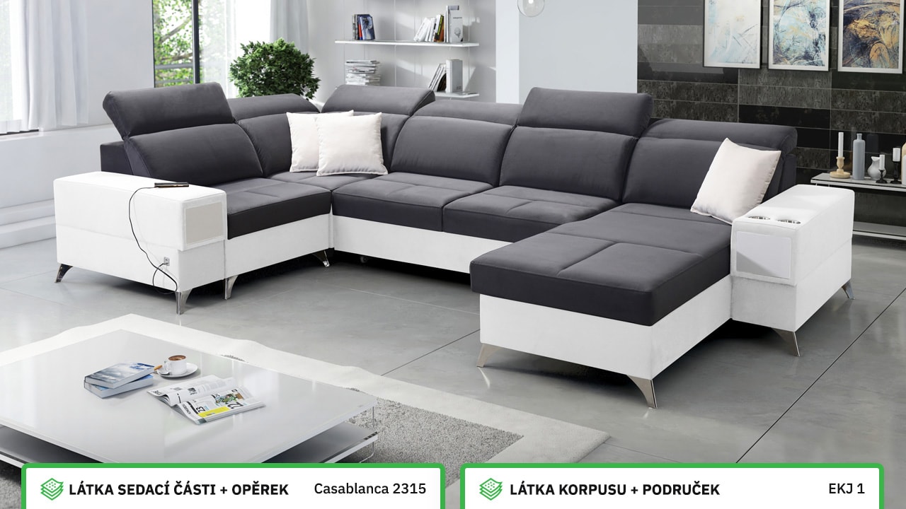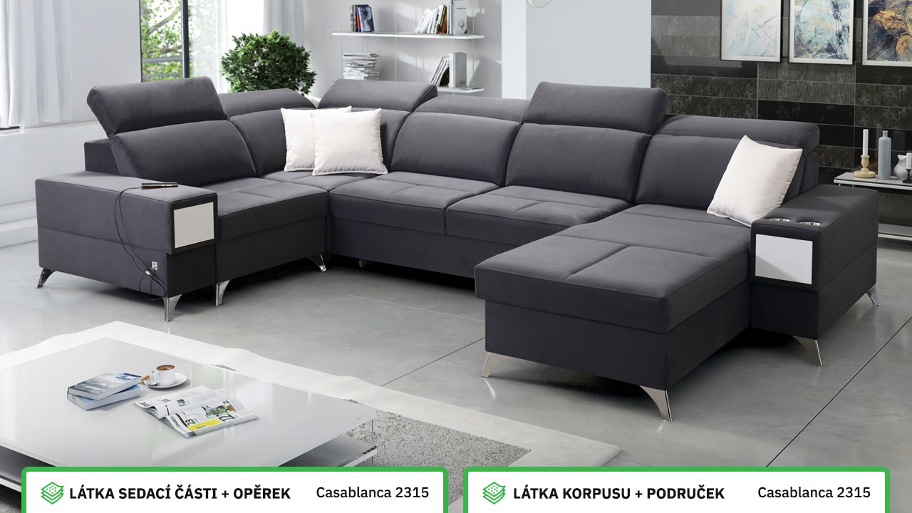 Velká, praktická a pohodlná sedačka s polohovatelnými opěrkami hlavy, úložným prostorem, USB porty a vestavěným šuplíkem. Celou sedačku si můžete dotvořit podle svých představ – v konfigurátoru si vyberete barvu potahové látky, typ nožiček i doplňků. Šuplík je možno zvolit v dekoru dřeva nebo potažený stejnou látkou, jako i sedačka. Je tedy jen na vás, jestli ho zamaskujete nebo zvýrazníte detail dřevěným prvkem.