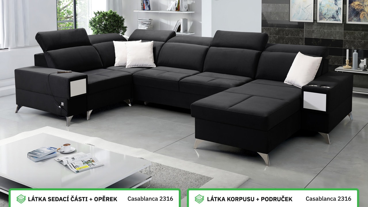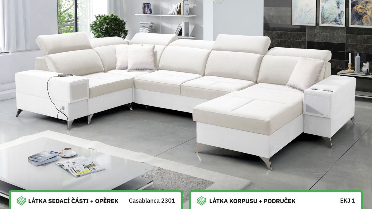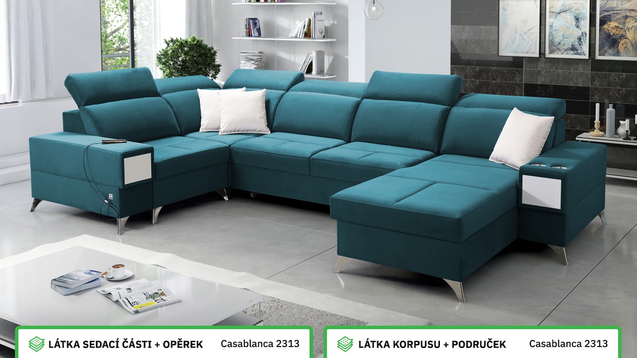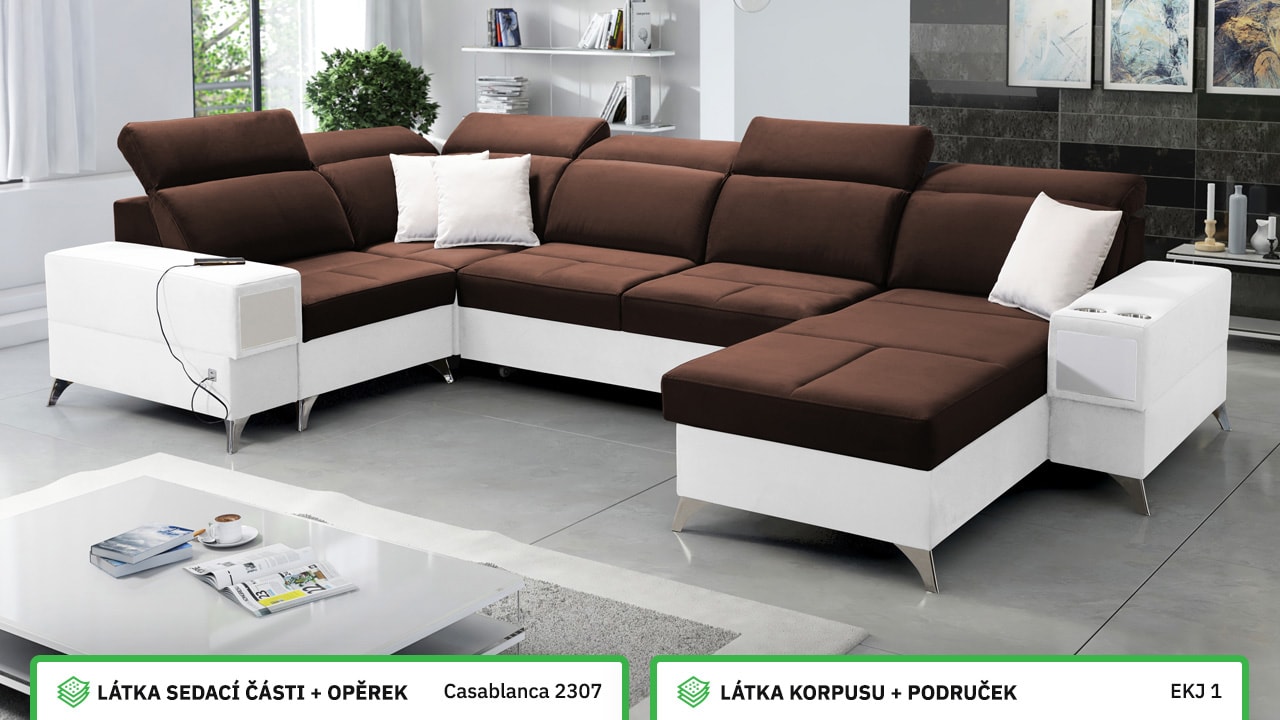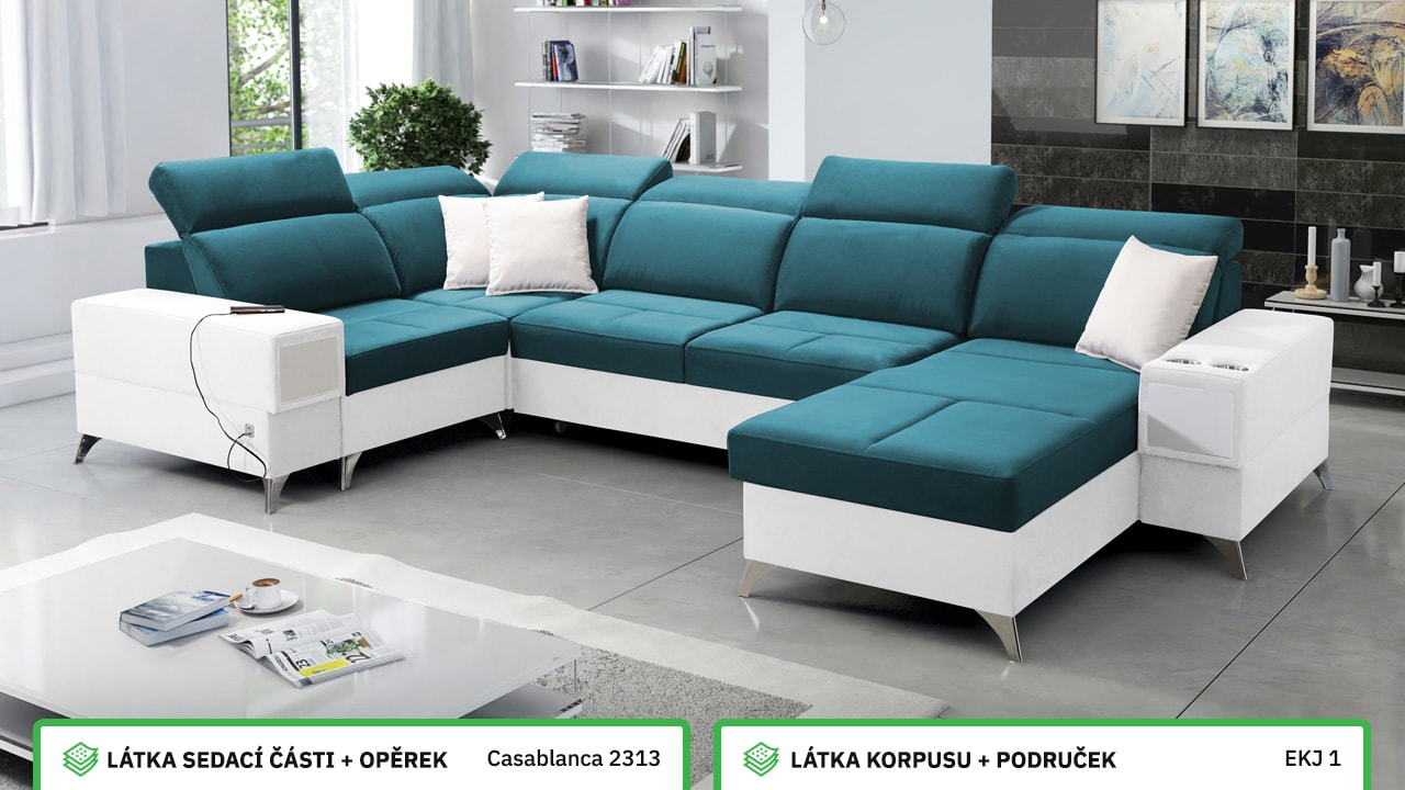 Velká, praktická a pohodlná sedačka s polohovatelnými opěrkami hlavy, úložným prostorem, USB porty a vestavěným šuplíkem. Celou sedačku si můžete dotvořit podle svých představ – v konfigurátoru si vyberete barvu potahové látky, typ nožiček i doplňků. Šuplík je možno zvolit v dekoru dřeva nebo potažený stejnou látkou, jako i sedačka. Je tedy jen na vás, jestli ho zamaskujete nebo zvýrazníte detail dřevěným prvkem.