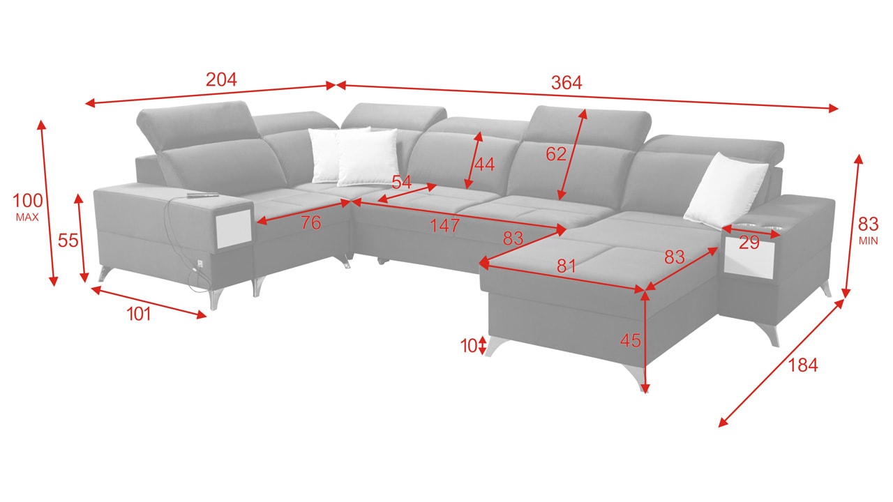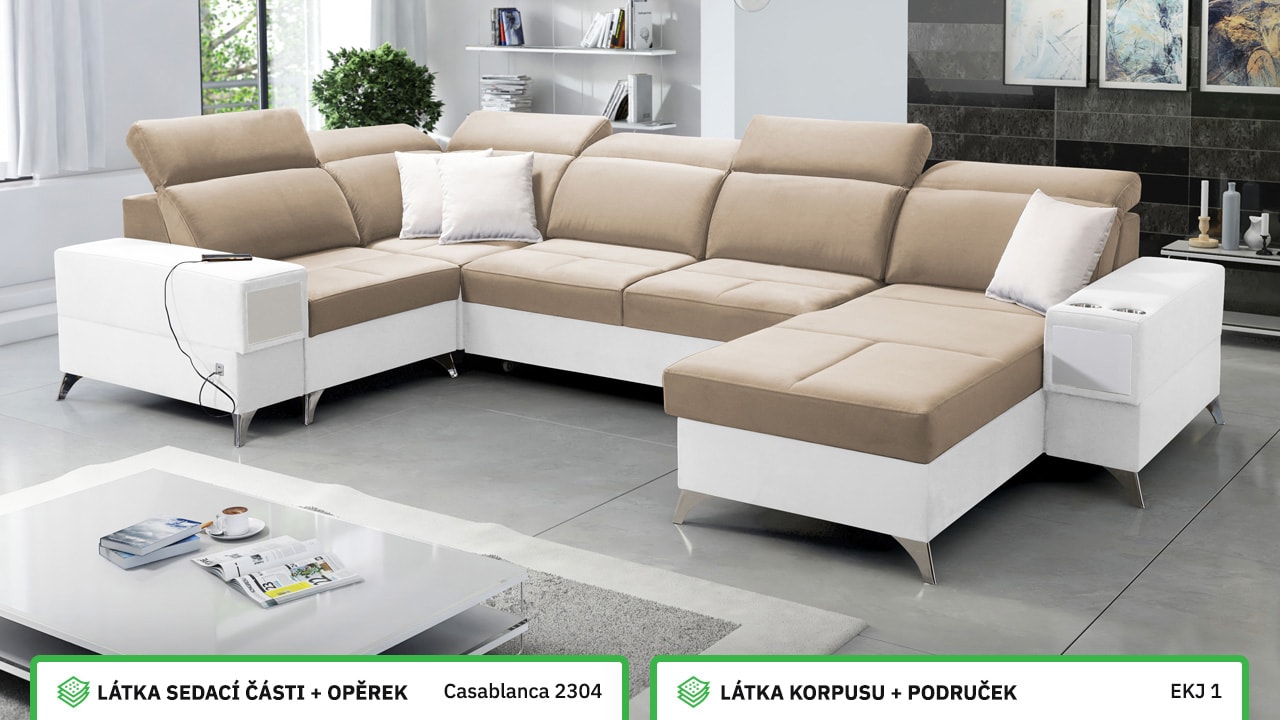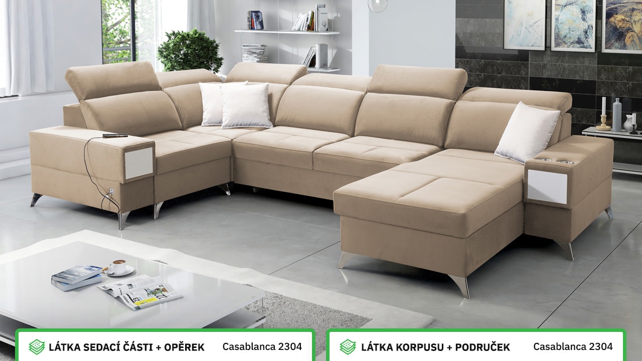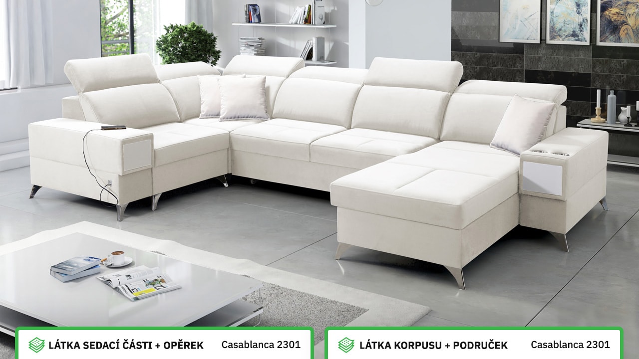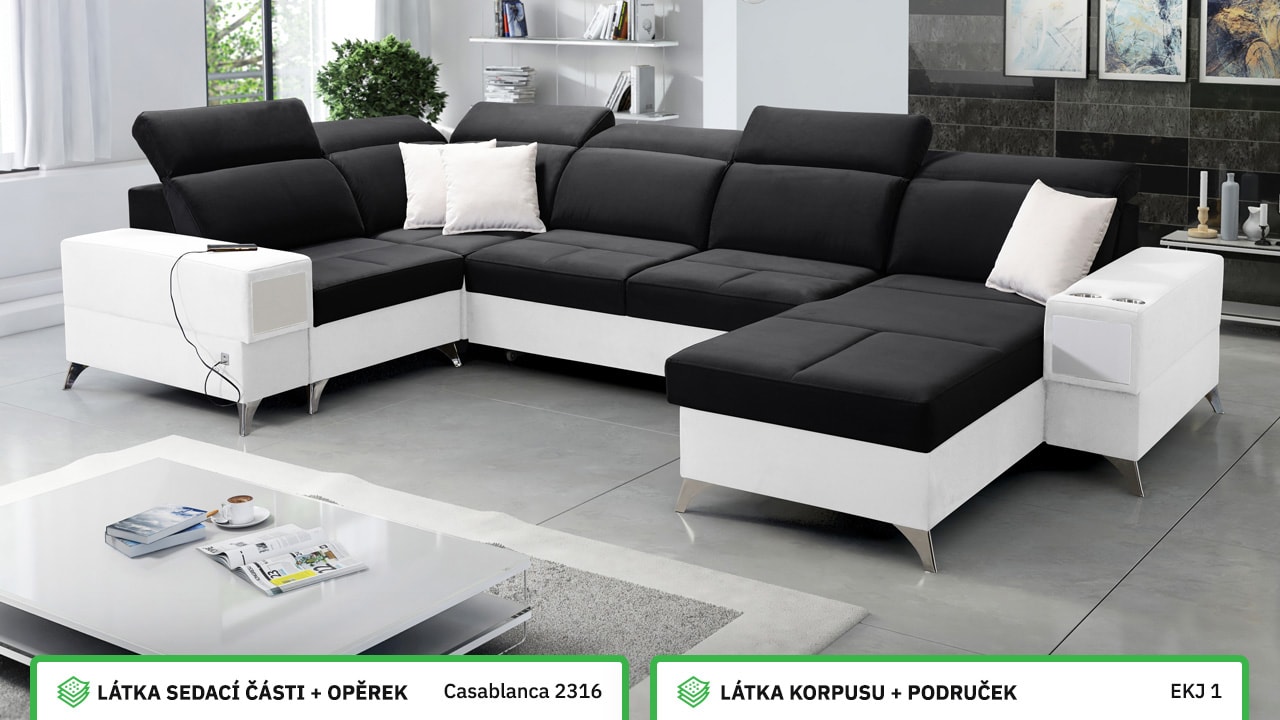 Velká, praktická a pohodlná sedačka s polohovatelnými opěrkami hlavy, úložným prostorem, USB porty a vestavěným šuplíkem. Celou sedačku si můžete dotvořit podle svých představ – v konfigurátoru si vyberete barvu potahové látky, typ nožiček i doplňků. Šuplík je možno zvolit v dekoru dřeva nebo potažený stejnou látkou, jako i sedačka. Je tedy jen na vás, jestli ho zamaskujete nebo zvýrazníte detail dřevěným prvkem.