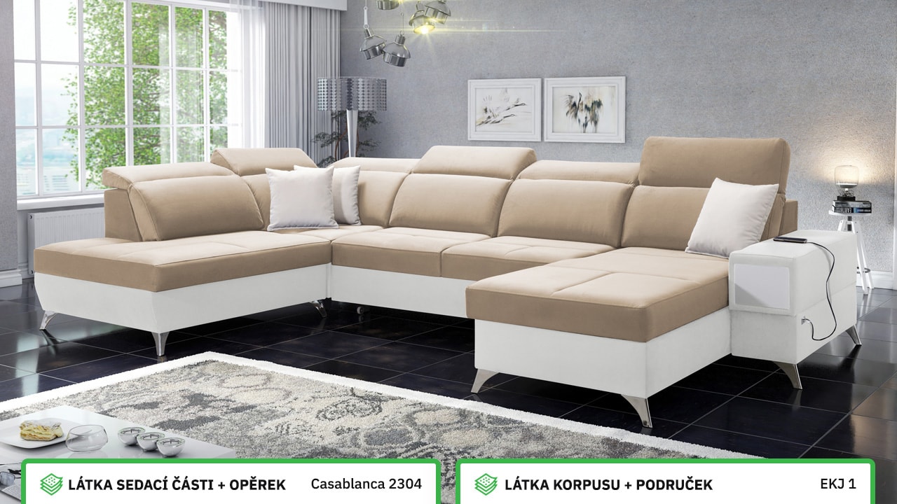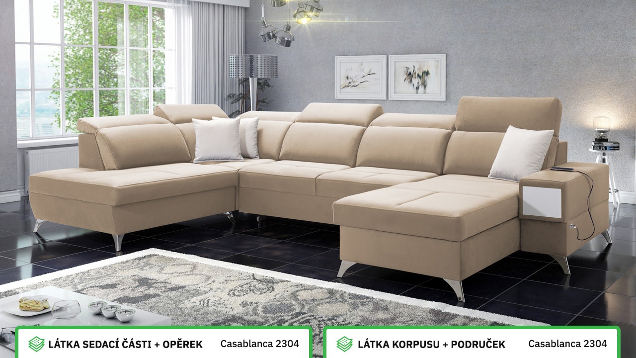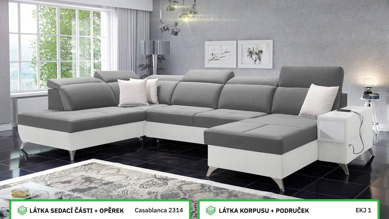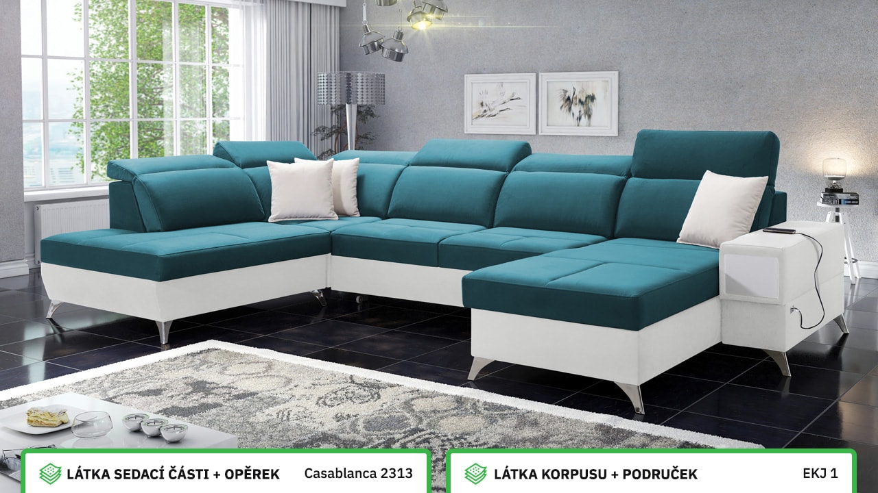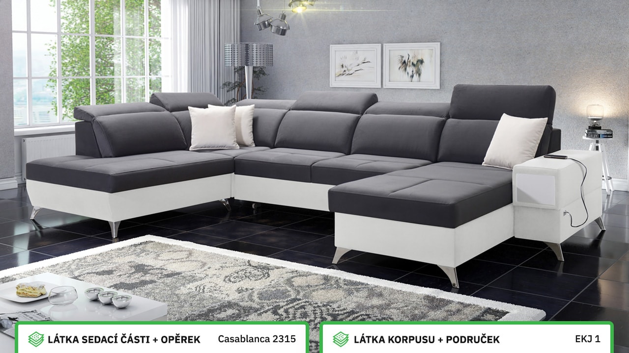 Chcete si sedačku přizpůsobit vlastním představám? Model sedací soupravy ve tvaru U Deuss VI vám to umožní na pár kliků. Je vybaven polohovatelnými opěrkami hlavy, USB nabíjecí stanicí a možností rozložení. Kromě potahové látky si na sedačku budete moci zkombinovat také typ nožiček a design vestavěného šuplíku. Jediné fixní jsou její rozměry. Konfigurátor se vám zobrazí v dalším kroku objednávky.