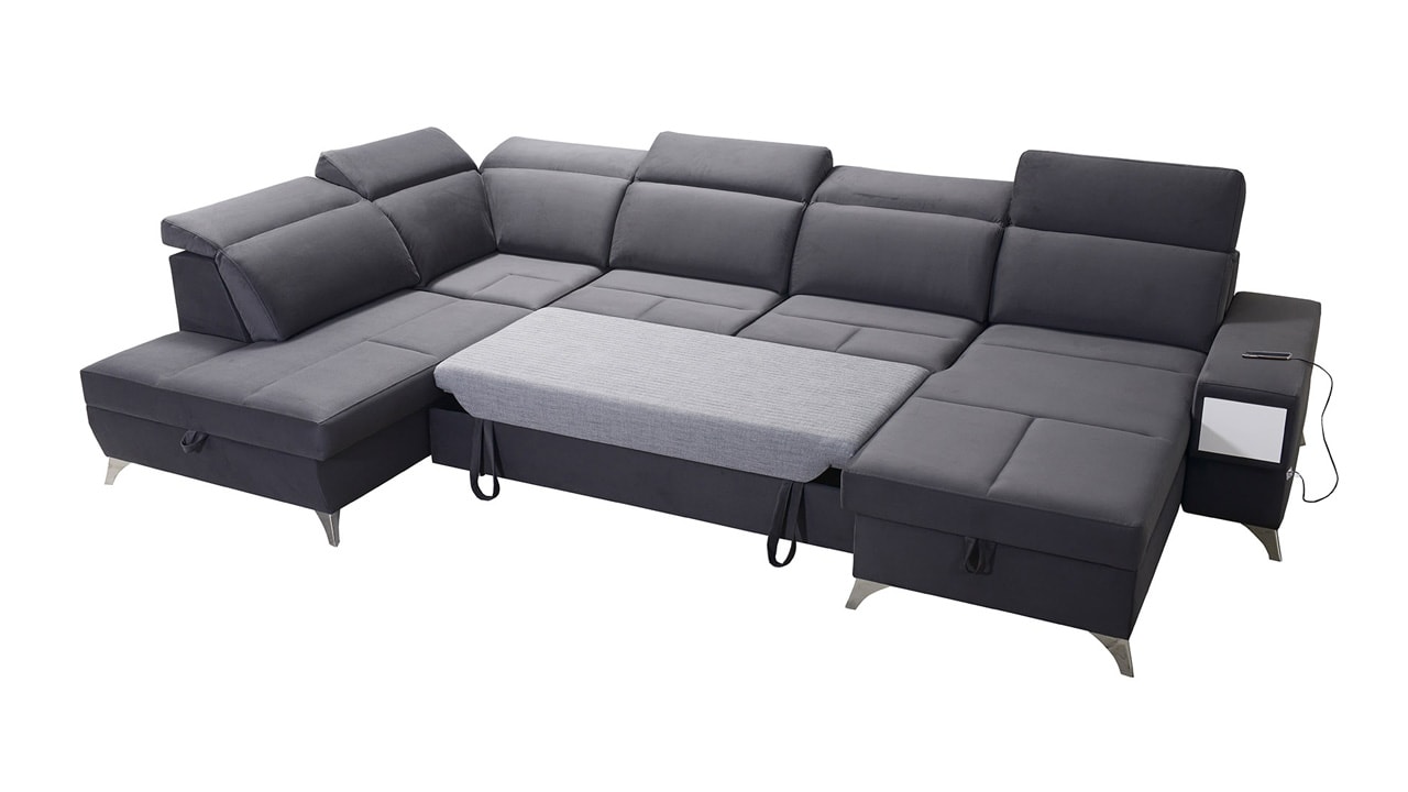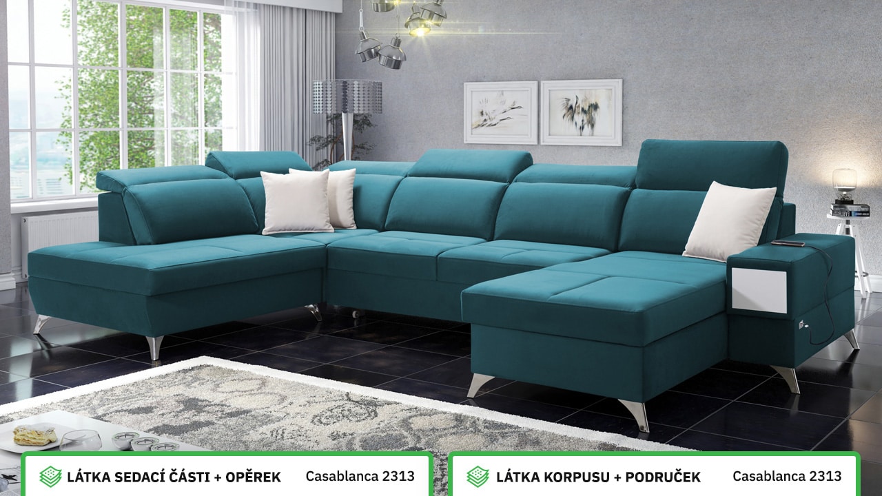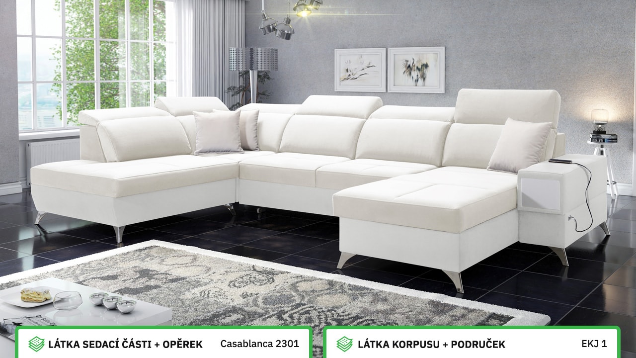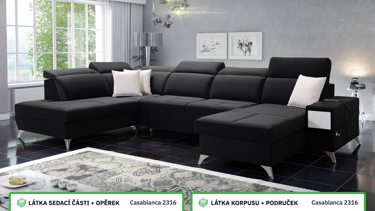 Chcete si sedačku přizpůsobit vlastním představám? Model sedací soupravy ve tvaru U Deuss VI vám to umožní na pár kliků. Je vybaven polohovatelnými opěrkami hlavy, USB nabíjecí stanicí a možností rozložení. Kromě potahové látky si na sedačku budete moci zkombinovat také typ nožiček a design vestavěného šuplíku. Jediné fixní jsou její rozměry. Konfigurátor se vám zobrazí v dalším kroku objednávky.