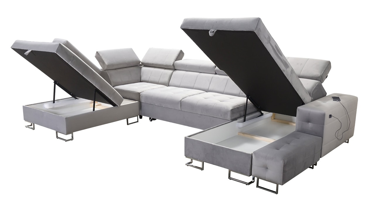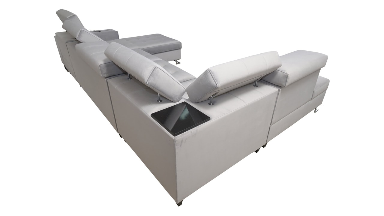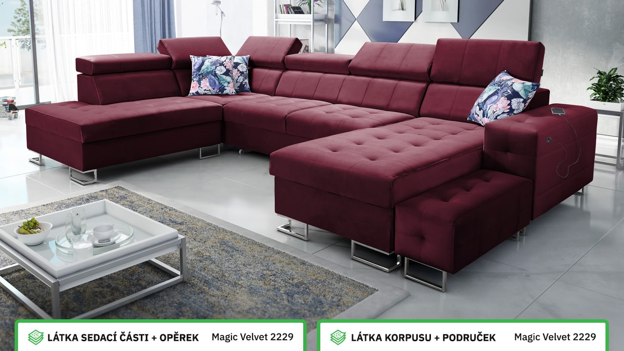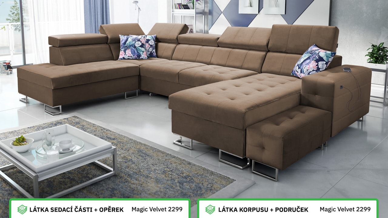 Tato velká sedací souprava do tvaru U je sázkou na kvalitu. Je vyrobena z pevných materiálů tak, aby konstrukce, sezení i šití vydržely dlouhá léta jako nové. Zaručí to její dlouhou životnost a vaši spokojenost. Ke spokojenosti vám však jistě poslouží i praktické funkce sedačky – například polohovatelné opěrky hlavy, možnost rozložení, velký úložný prostor a USB port. V ceně sedačky dostanete také praktický taburet.