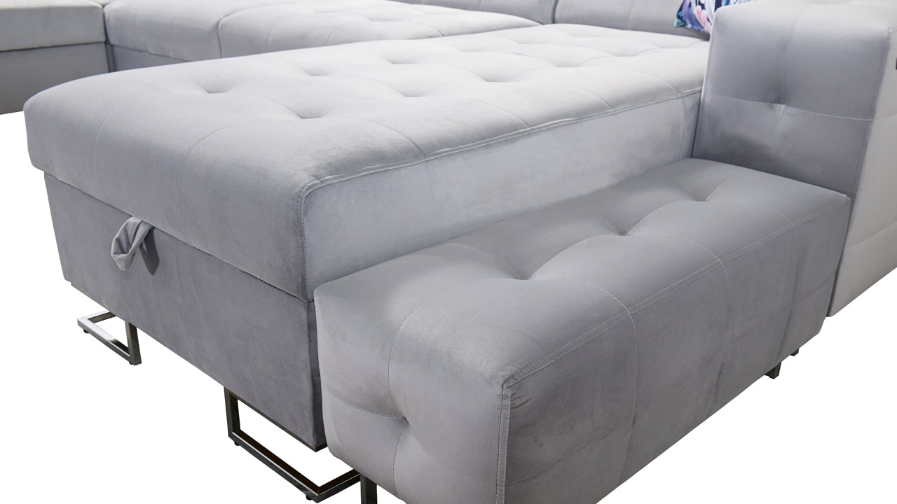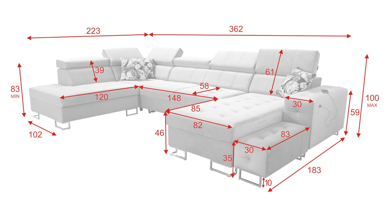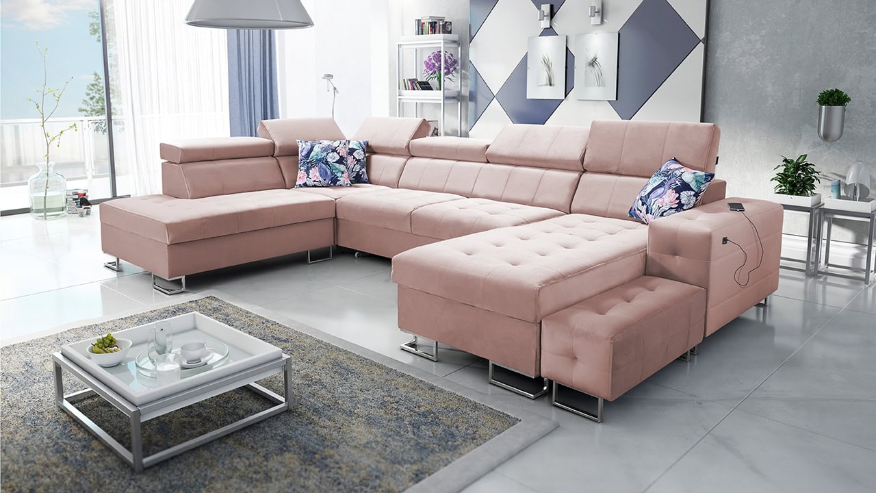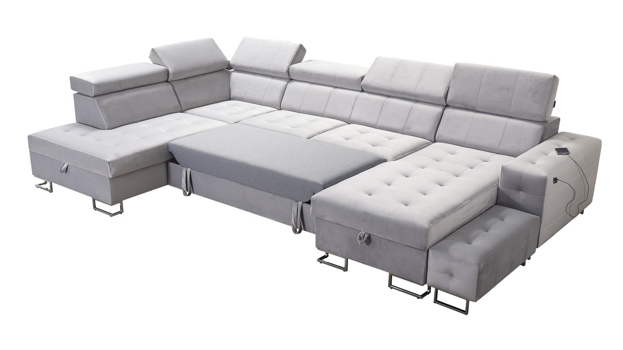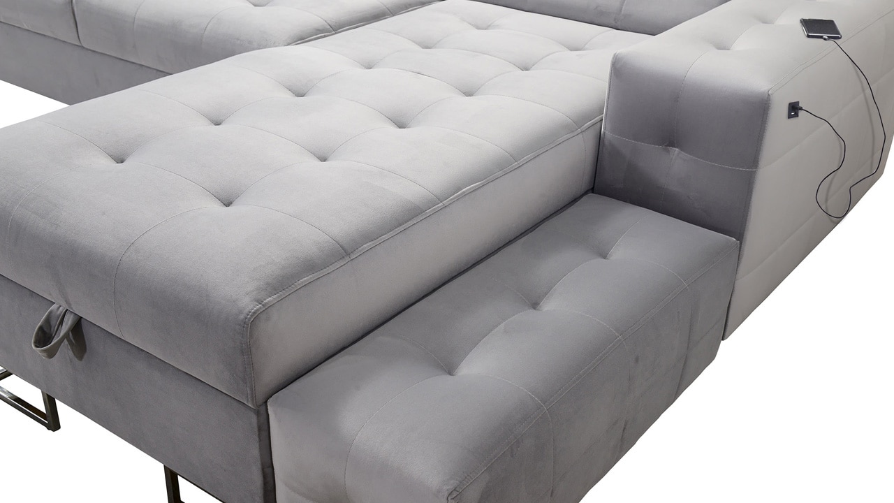 Tato velká sedací souprava do tvaru U je sázkou na kvalitu. Je vyrobena z pevných materiálů tak, aby konstrukce, sezení i šití vydržely dlouhá léta jako nové. Zaručí to její dlouhou životnost a vaši spokojenost. Ke spokojenosti vám však jistě poslouží i praktické funkce sedačky – například polohovatelné opěrky hlavy, možnost rozložení, velký úložný prostor a USB port. V ceně sedačky dostanete také praktický taburet.
