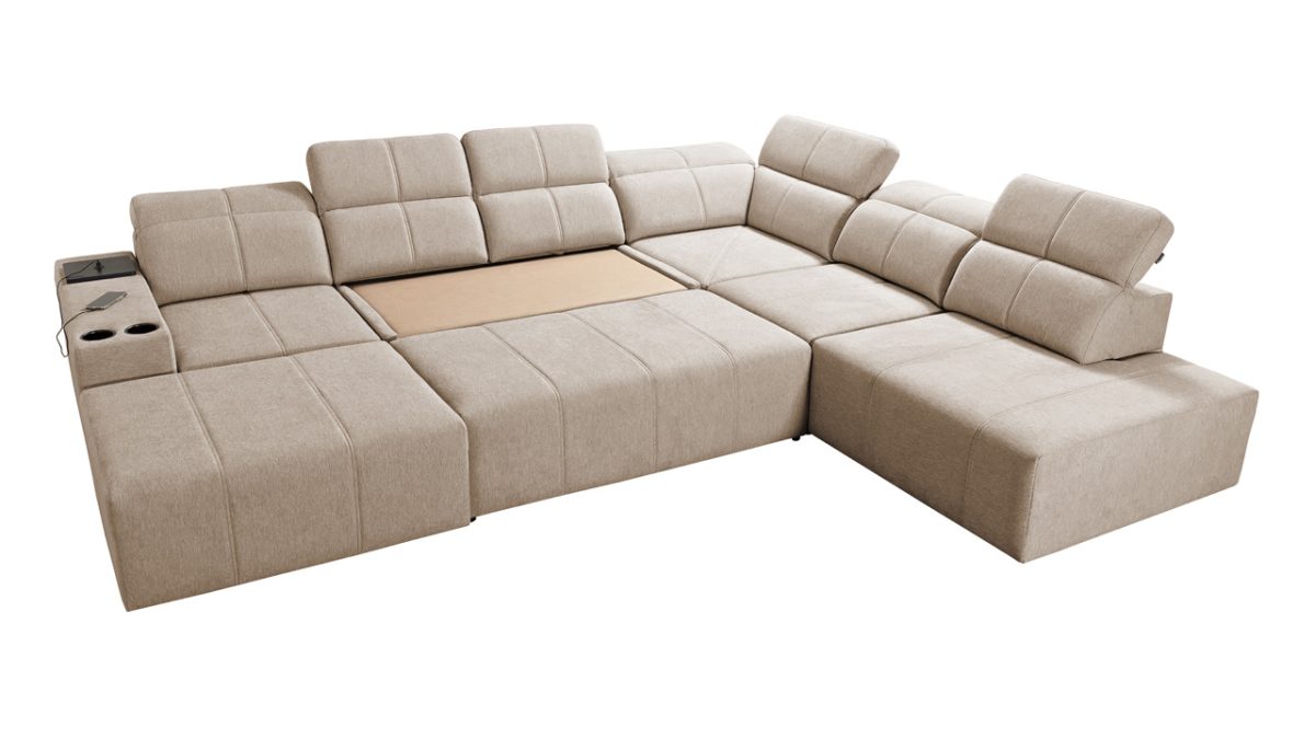 Představujeme vám prostorný model Mendy X – moderní a elegantní sedačku ve tvaru U vhodnou do velkých prostor. Disponuje nejen štědrým místem k sezení, ale také úložným prostorem a spací plochou až 284 × 138 cm. Užijte si relax s rodinou či oblíbený film a současně využijte všechny možnosti, které vám tato pohovka nabízí. Vestavěný minibar, zabudovaná zásuvka na drobnosti, držáky na sklenice, polohovatelné opěrky hlavy, posuvná opěrka zad i nabíjecí stanice na chytrá zařízení povýší vaše pohodlí na novou úroveň.